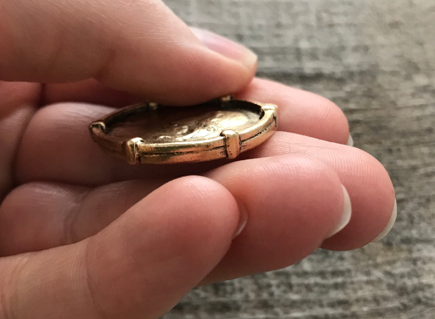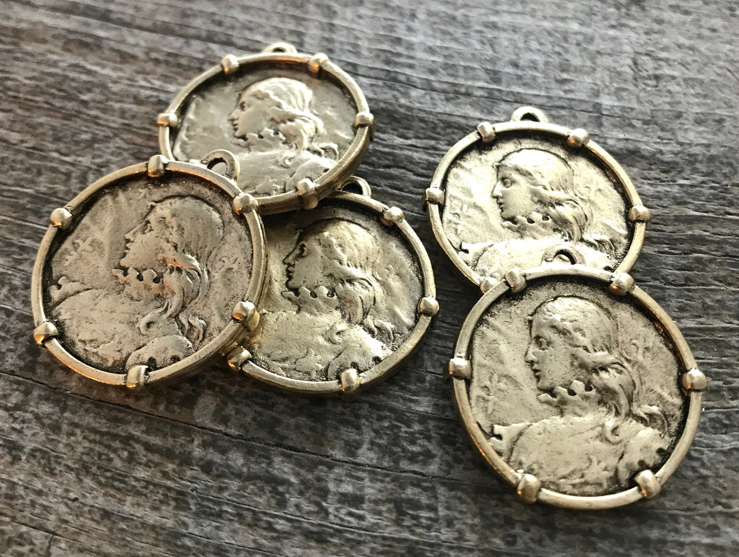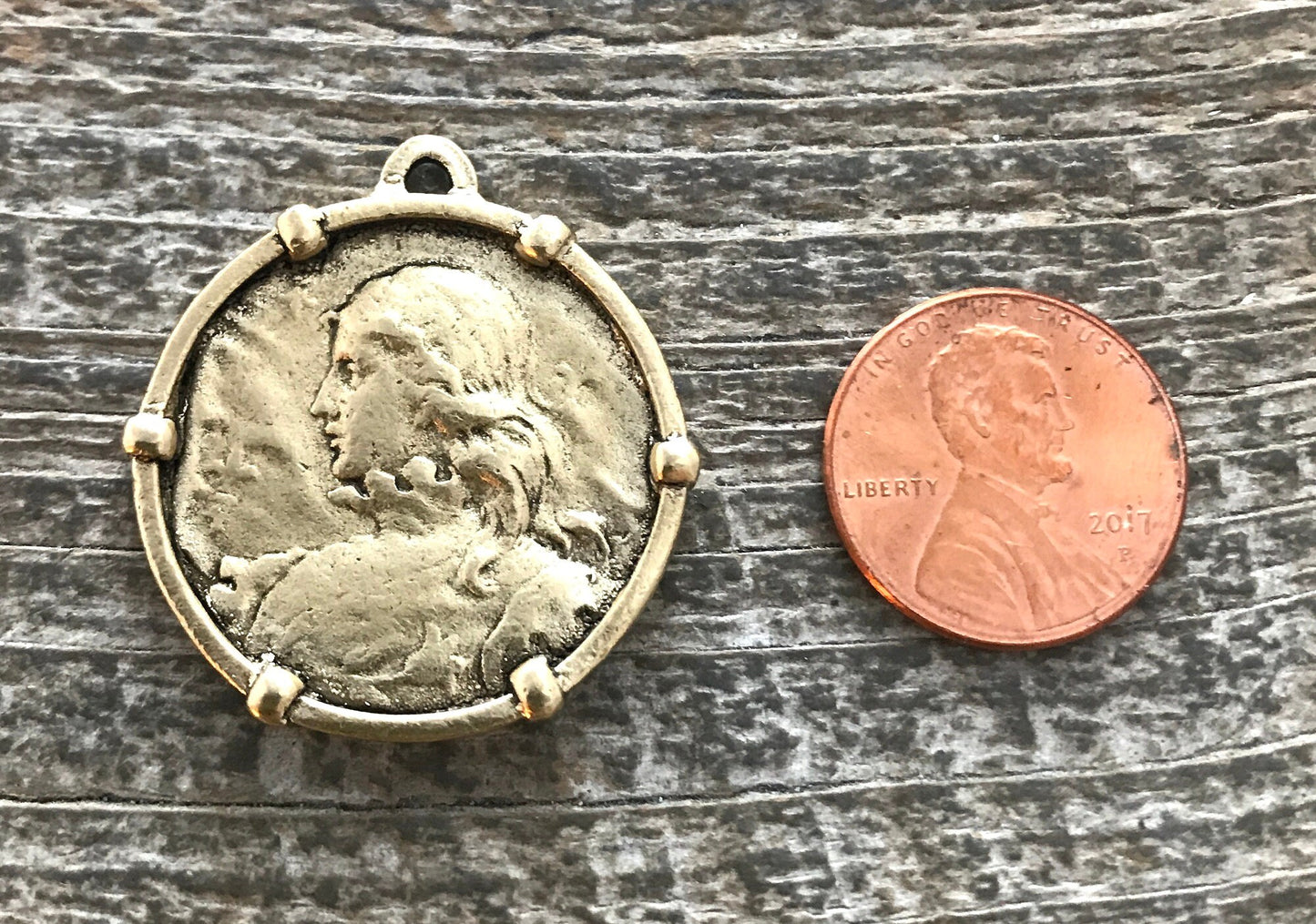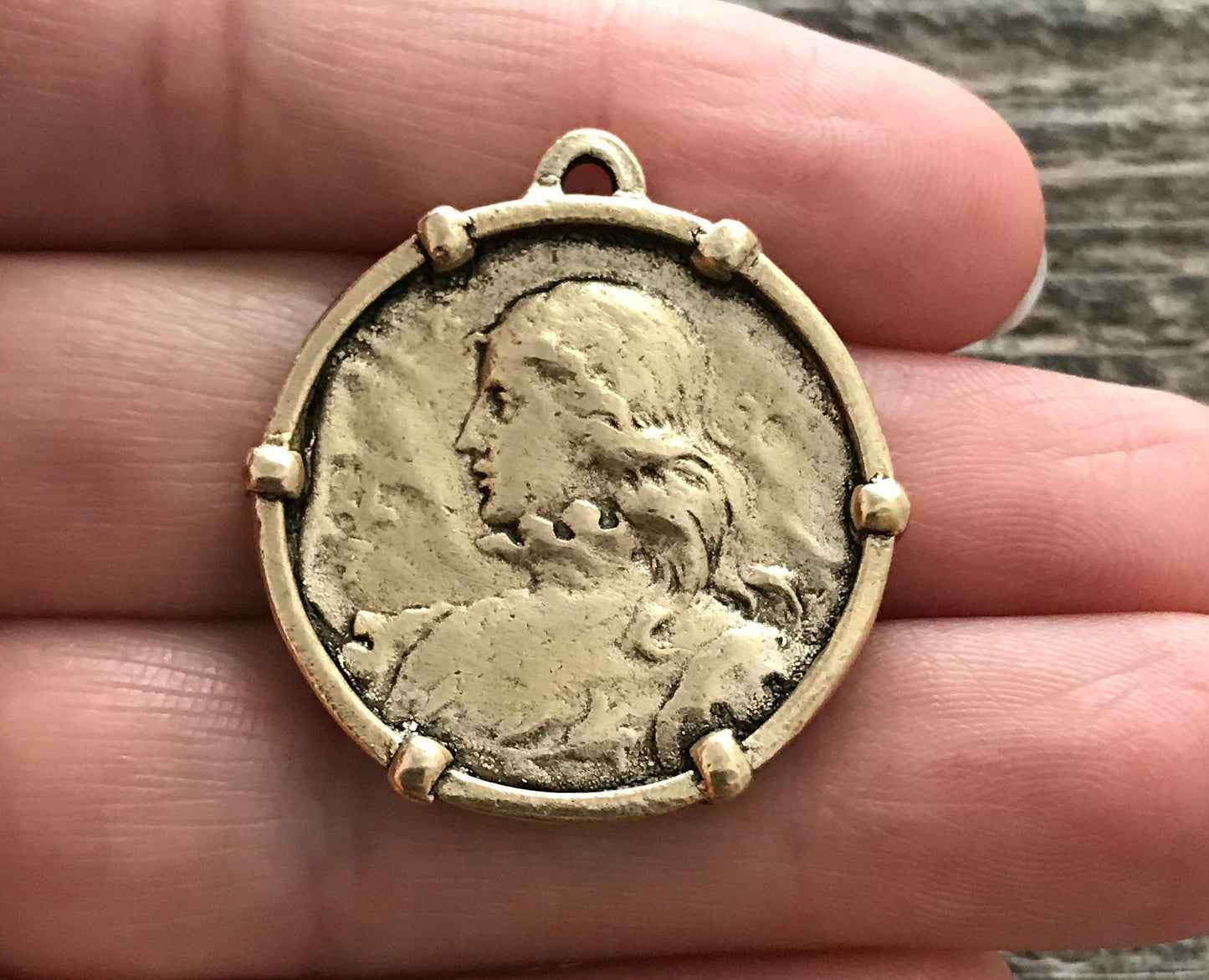This unique and lovely medal depicts Joan of Arc, known for her intense bravery and devotion to hearing and following her convictions. She is known as the patron saint of soldiers. I bought the original of this medal from France.