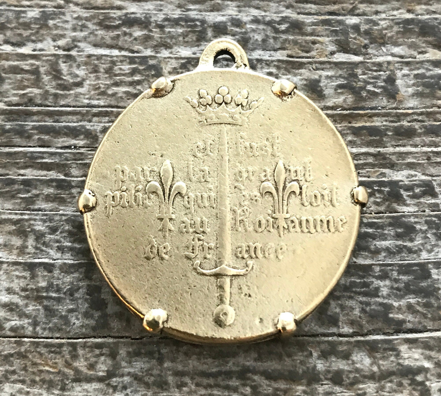 It dates circa early 1900’s. This medal is thick and has a very nice weight to it. The back is written in French and translates to: “There is great pity in the kingdom of France.” That is what the Archangel St. Michael told Joan of Arc in the year 1429. Here is a brief history from history.com about Joan of Arc: "Joan of Arc, a peasant girl living in medieval France, believed that God had chosen her to lead France to victory in its long-running war with England.