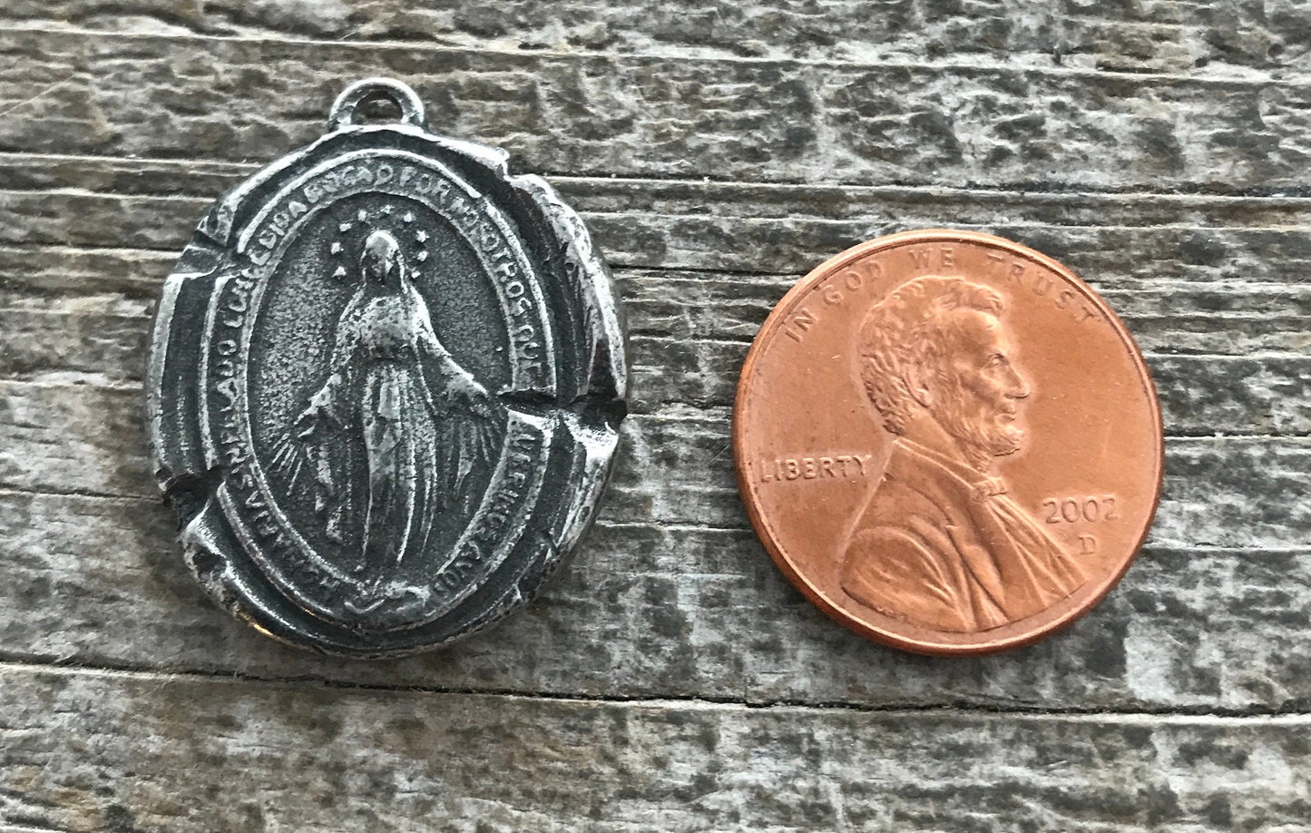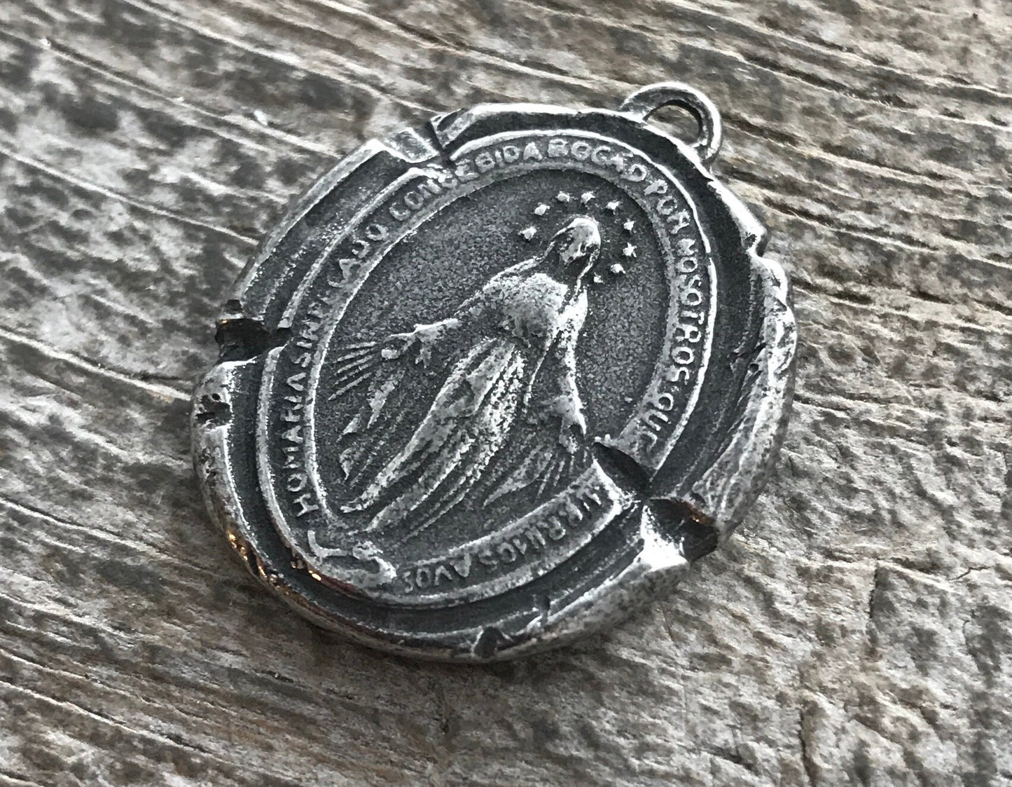 This is a wax seal featuring a depiction of the Blessed Mother. This is a truly gorgeous piece. It's very solid and quite thick. It really feels wonderful to the touch. This can be used to make an extremely special piece of jewelry. The inscription says the following in Spanish: "Oh Mary without sin conceived pray for us who resort to you."
