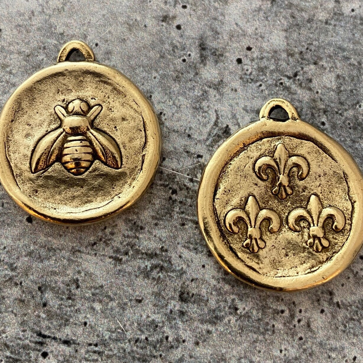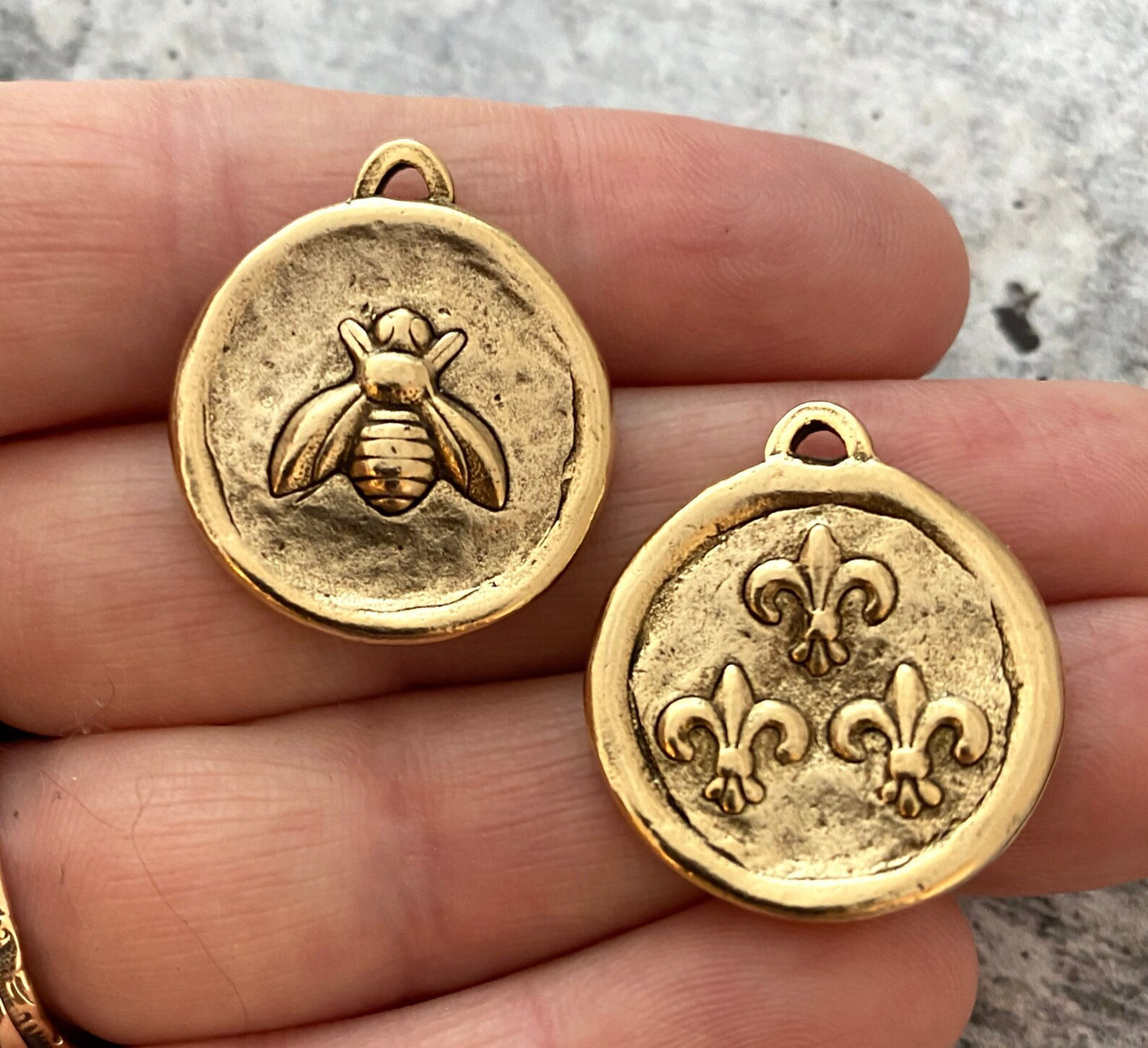 Soldered French Bee Charm with Fleur de Lis, Antiqued Gold Pendant, Jewelry Supplies, GL-6123