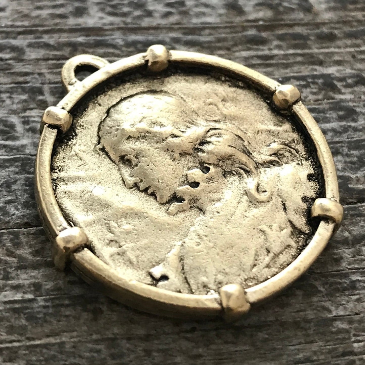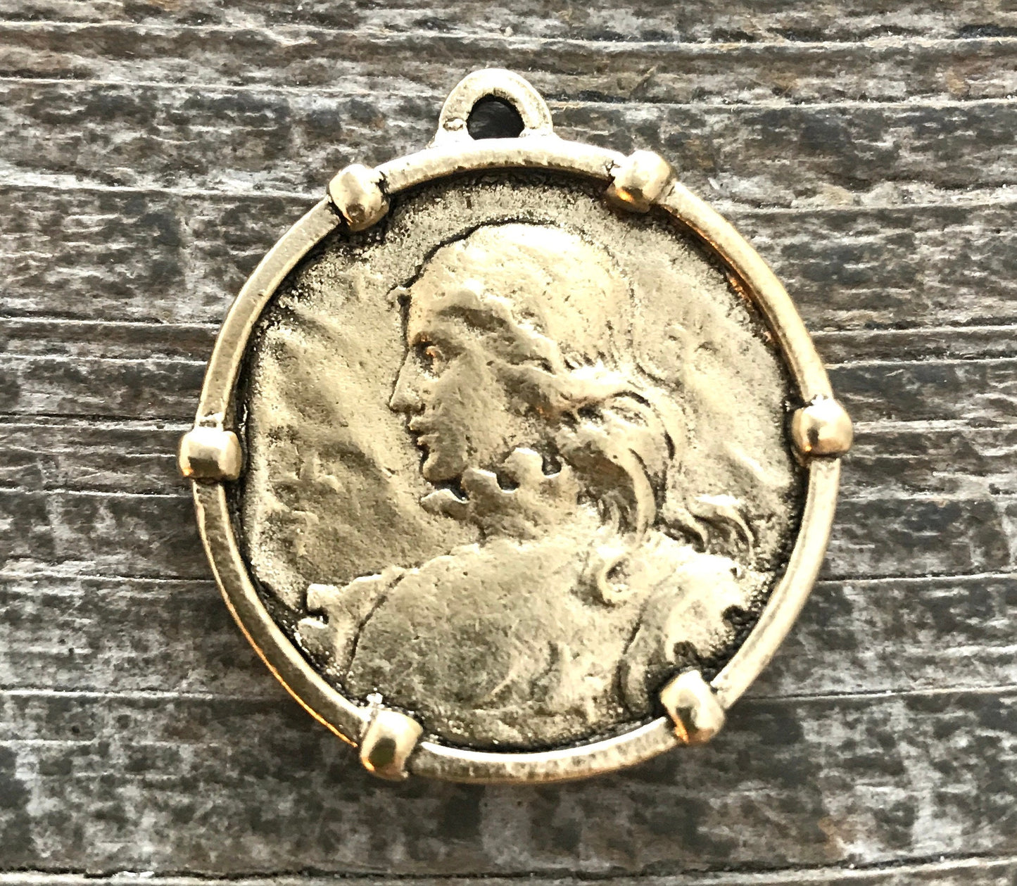 Joan of Arc Medal with Frame, Antiqued Gold Charm Pendant, Brave Woman, Saint of Soldiers, Religious Catholic Jewelry Supplies, GL-6124