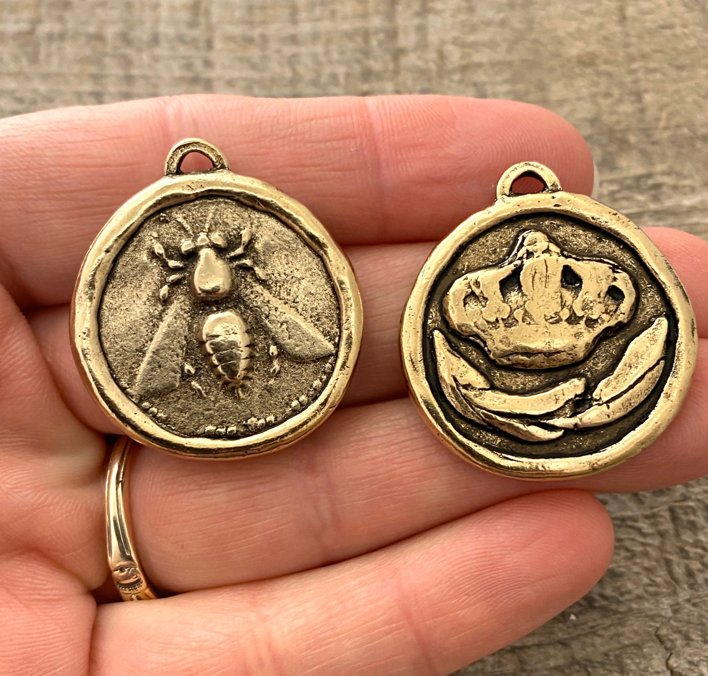 Add Large Soldered Bee Pendant, Crown and Laurel Leaf Charm, Artisan Jewelry Components Supplies, GL-6190 to the cart