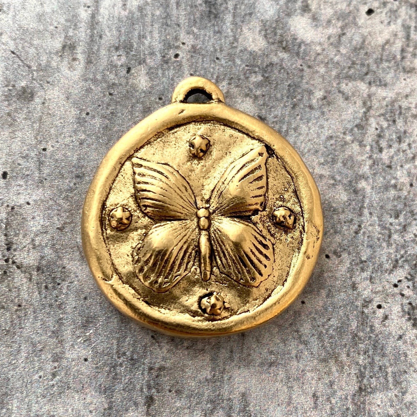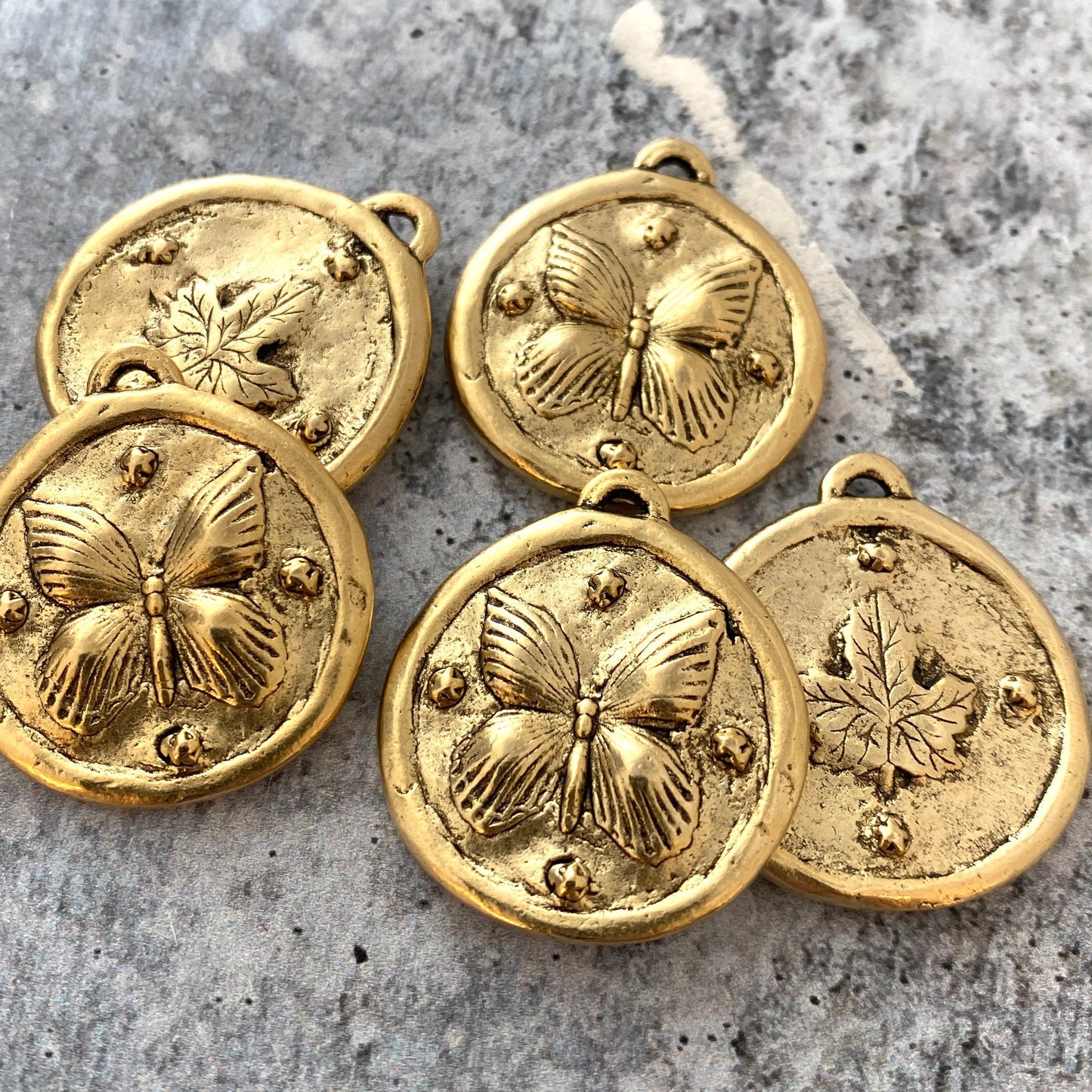 Soldered Butterfly and Maple Leaf Pendant, Antiqued Gold Nature Leaf Charm, Artisan Jewelry Components Supplies, GL-6192