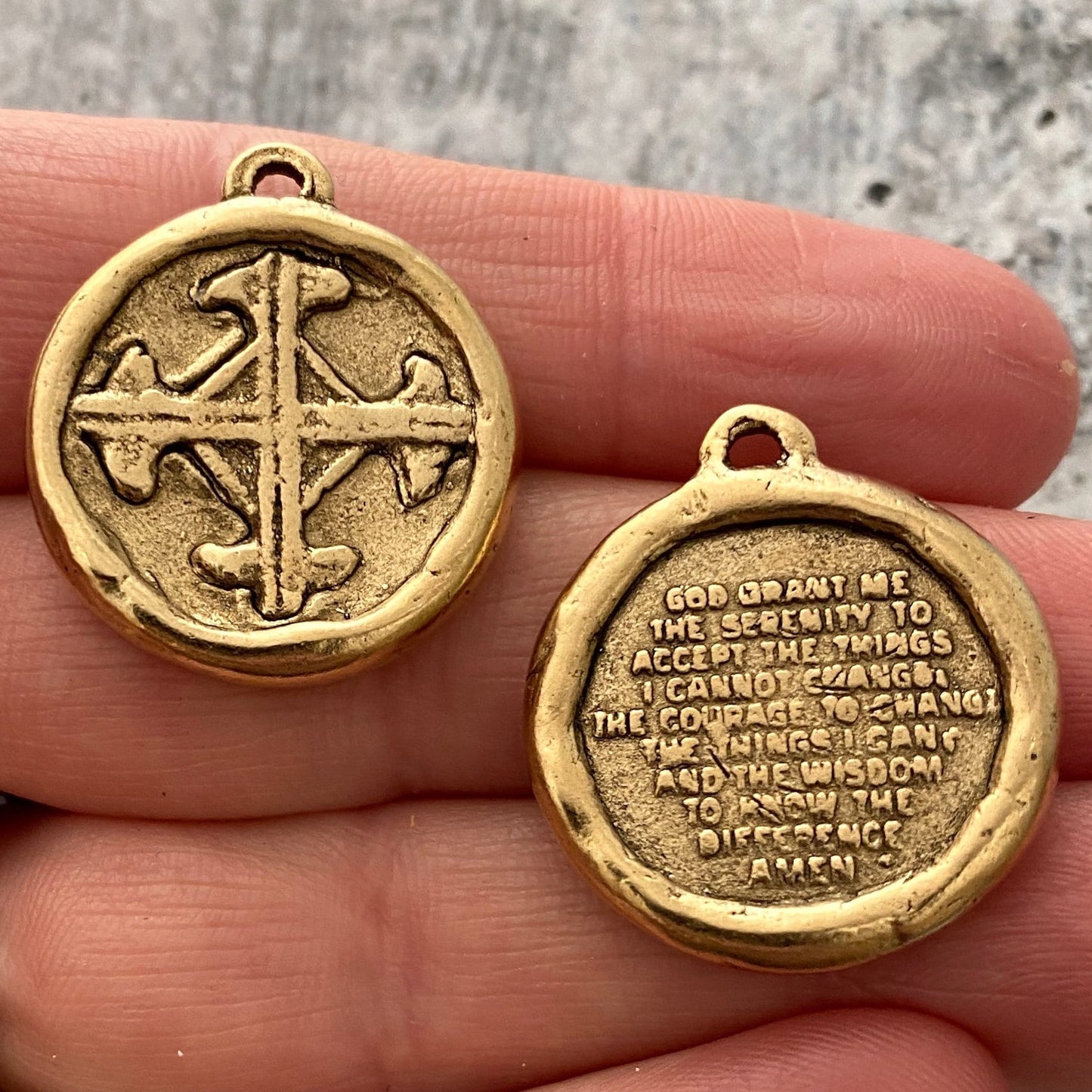 Soldered Serenity Prayer Coin, Pocket Cross Charm, Sobriety Token, Antiqued Gold Religious Christian Men's Jewelry, GL-6090
