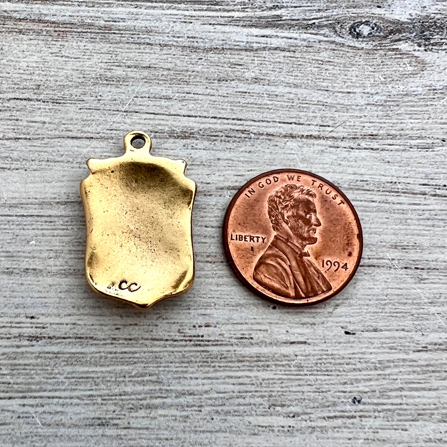 CC pewter components are made of high-quality pewter that is free of lead and cadmium. Most CC chain is made of regular steel, and some is made of brass. It is then plated with the various CC finishes. CC plating is known to hold up very well over time, but as always with any plated items, we recommend keeping it away from water and perfume.