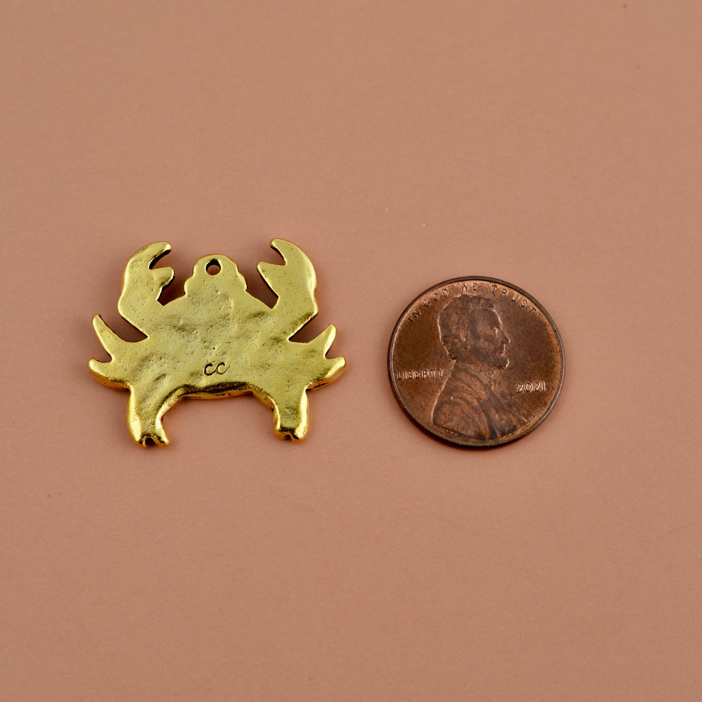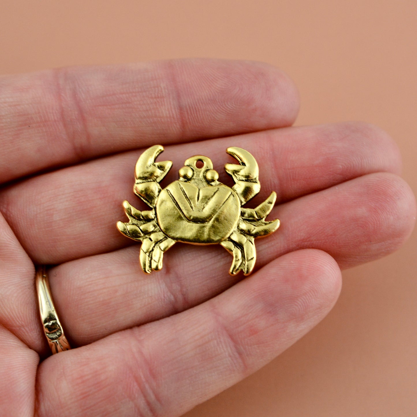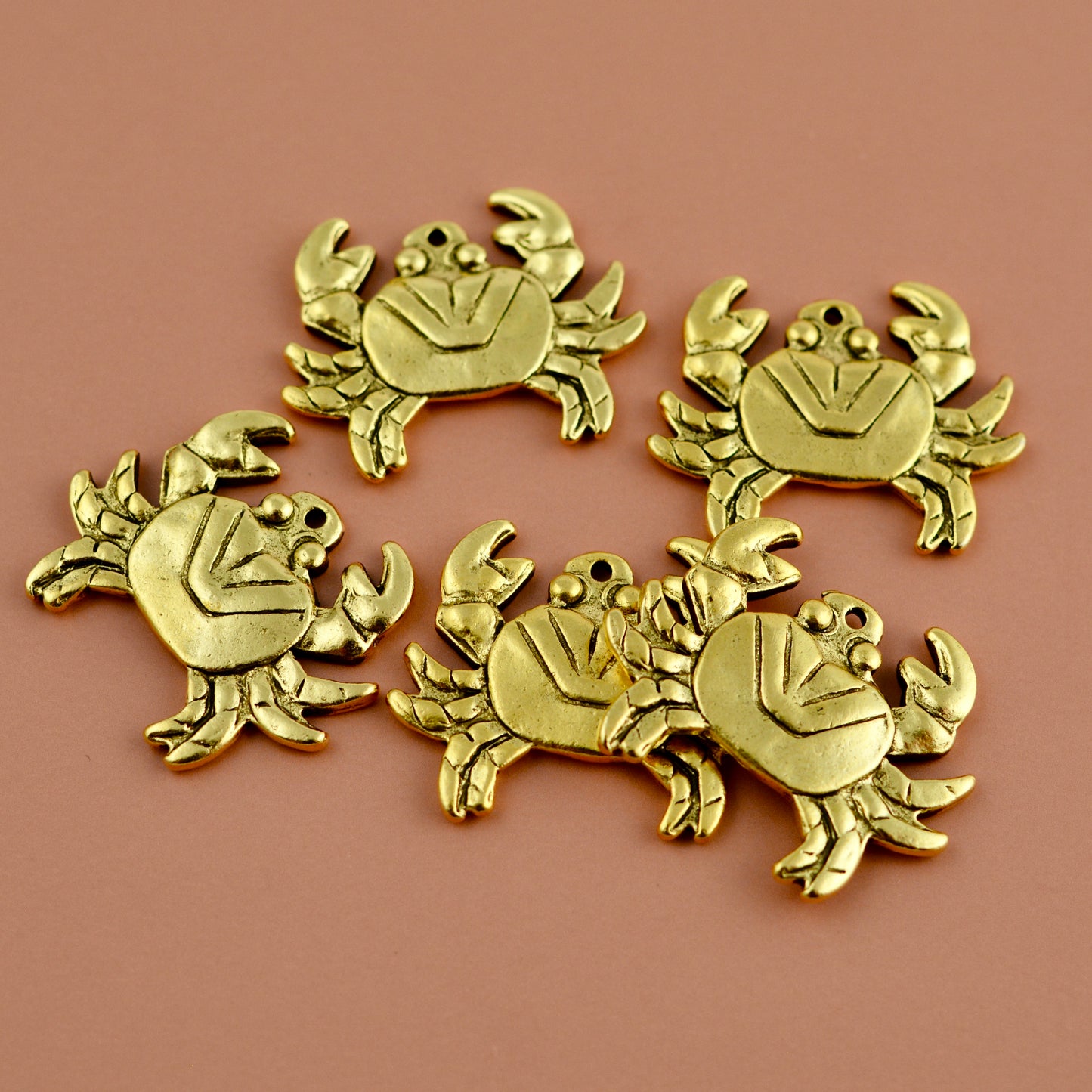 Celebrate coastal elegance with this antiqued gold crab charm pendant. Crafted for jewelry making, it captures the spirit of ocean beaches with its fun design and warm finish. This piece is great for charm necklaces and bracelets.