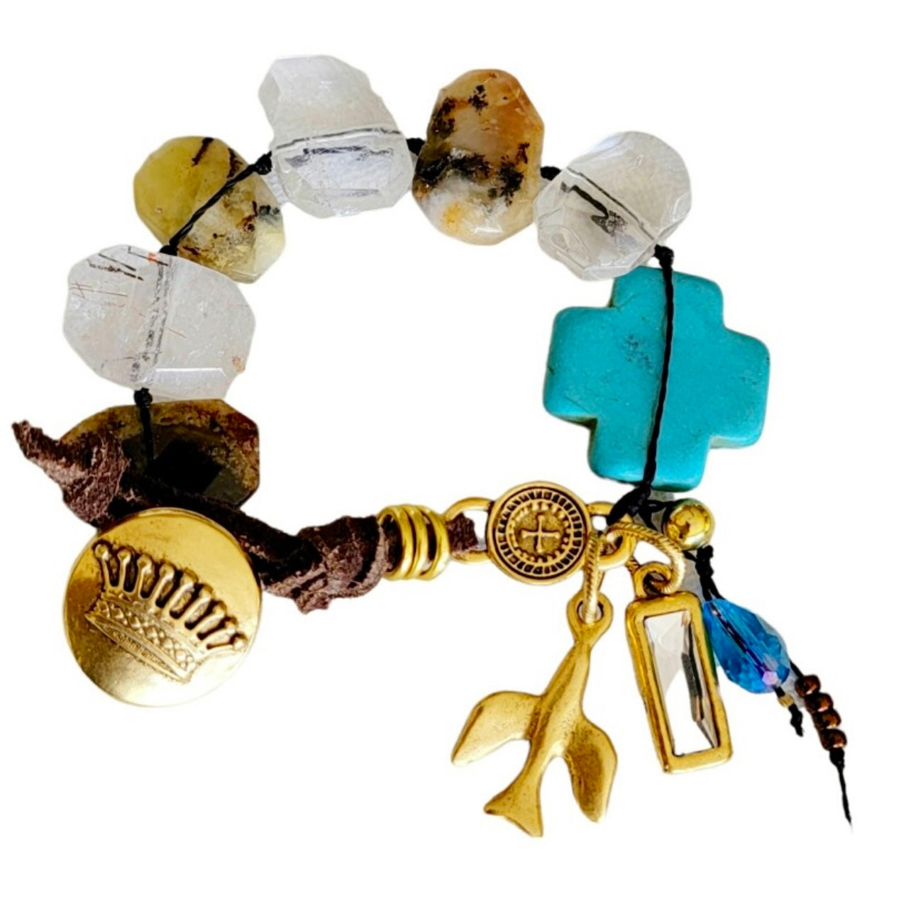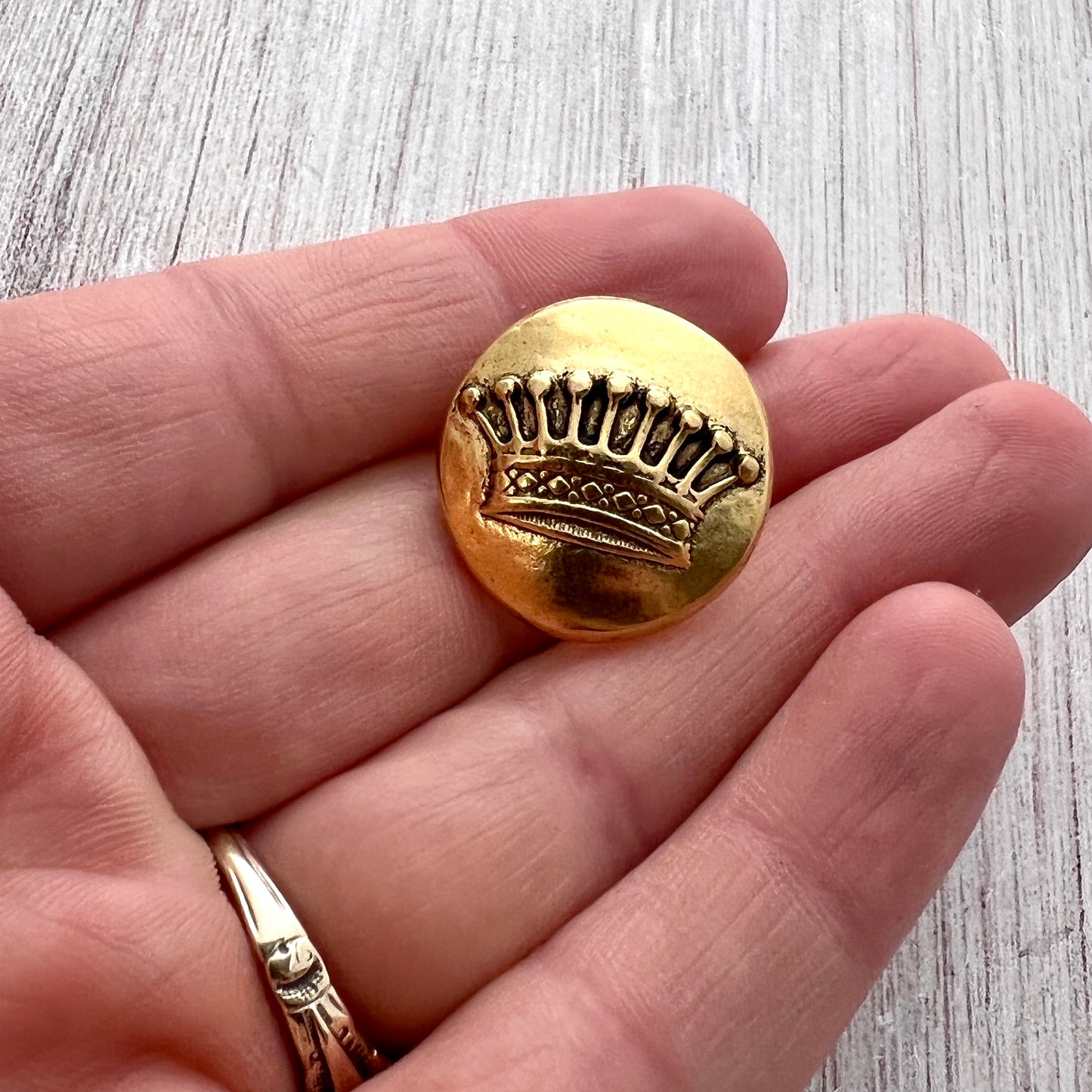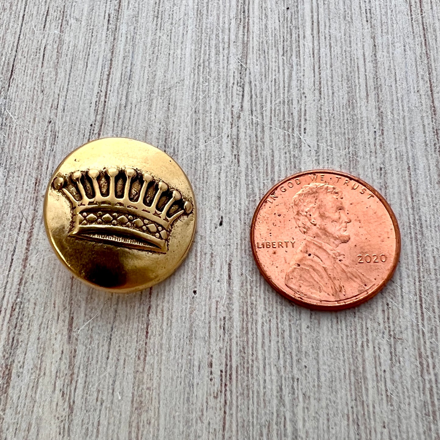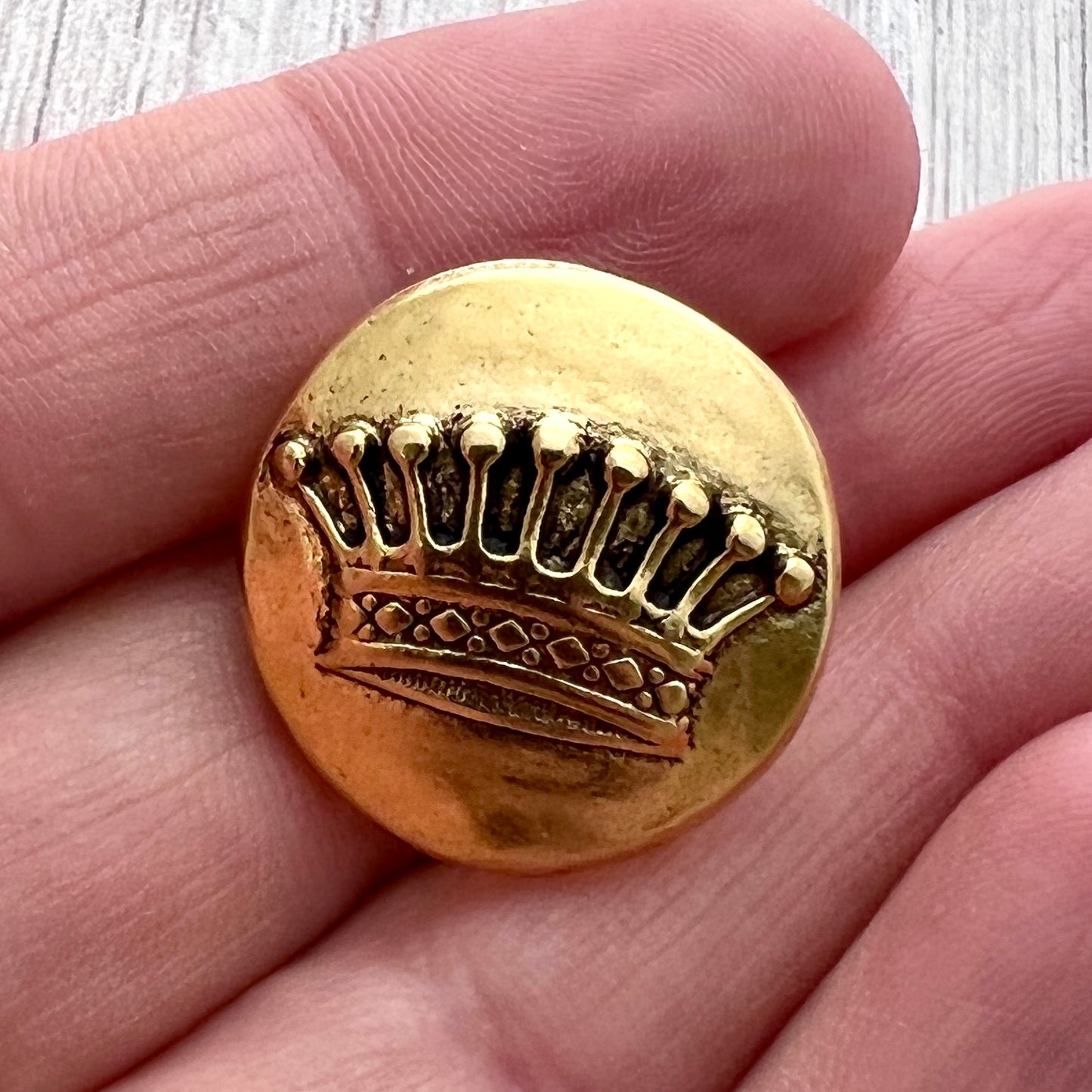 This domed button closure features a royal crown. This piece makes an excellent and unique clasp for wrap bracelets and leather jewelry.