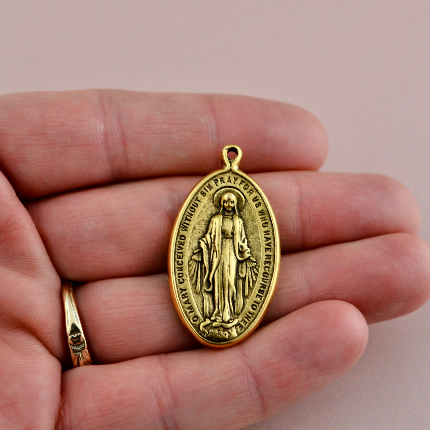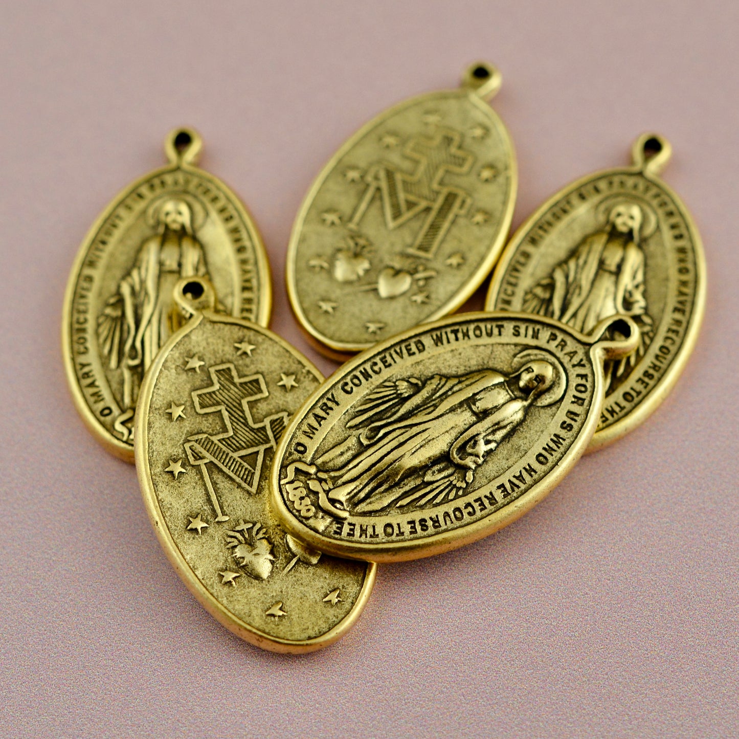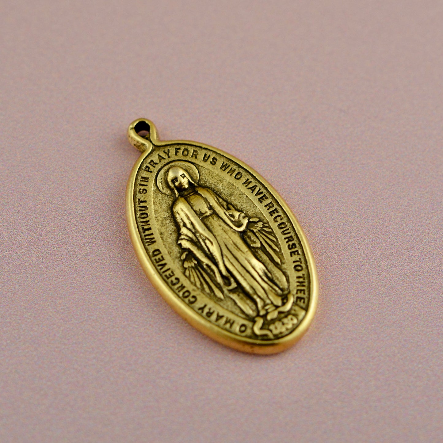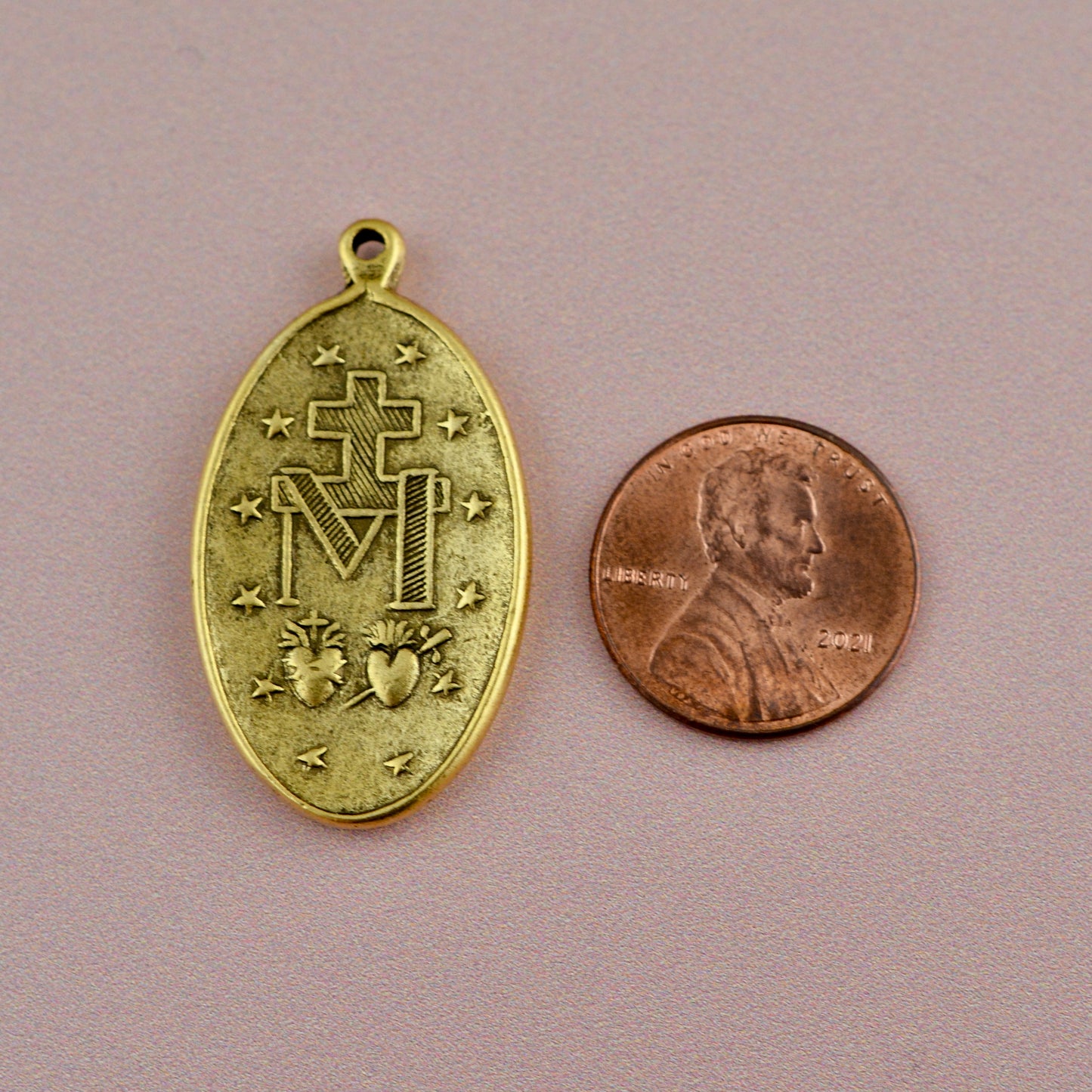 Miraculous Medal, Catholic Religious Mary Pendant, Antiqued Gold Charm, GL-6334