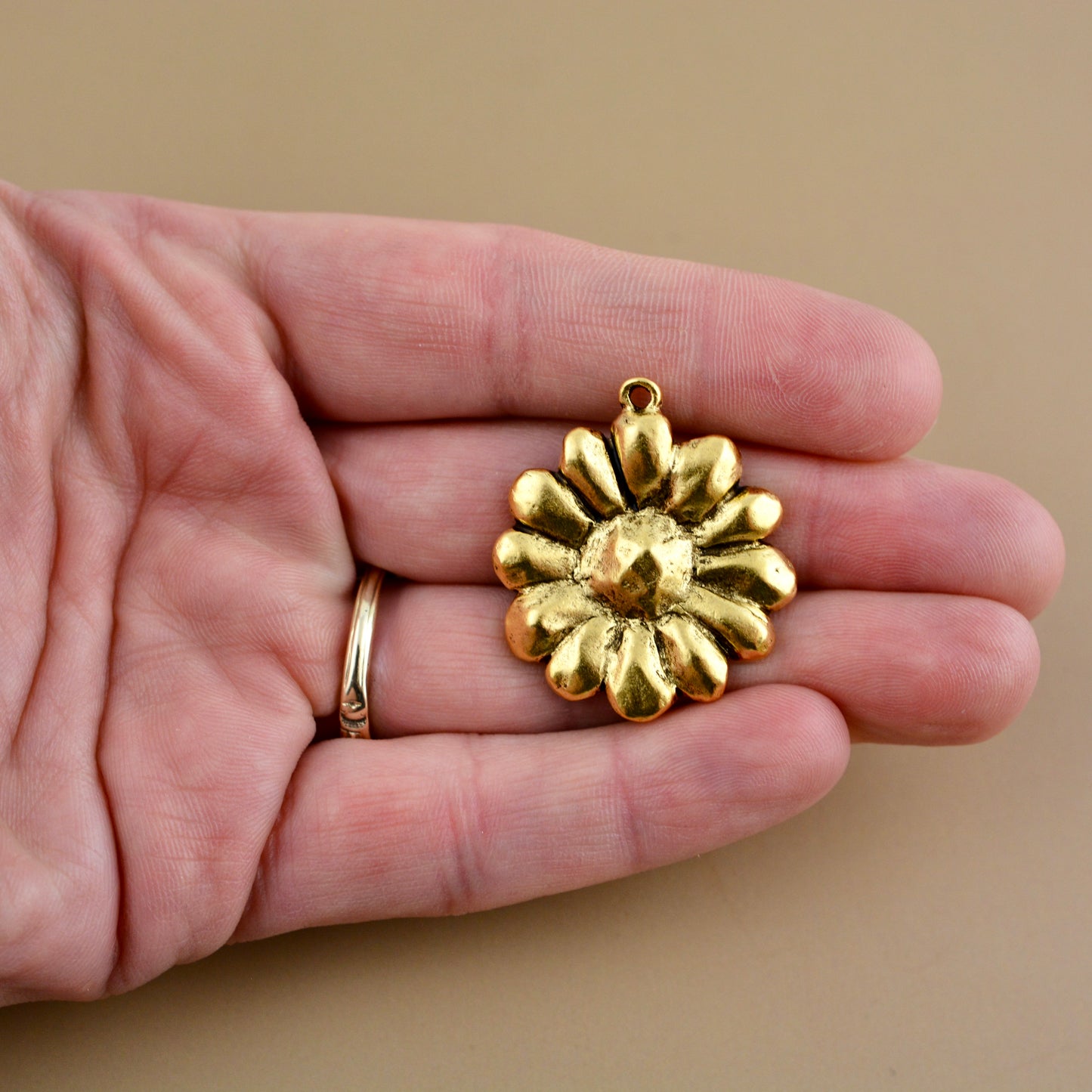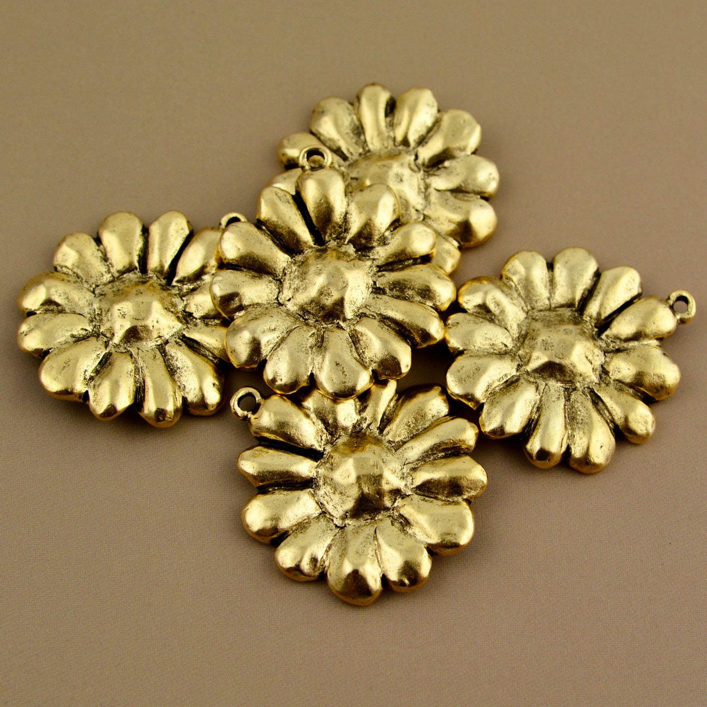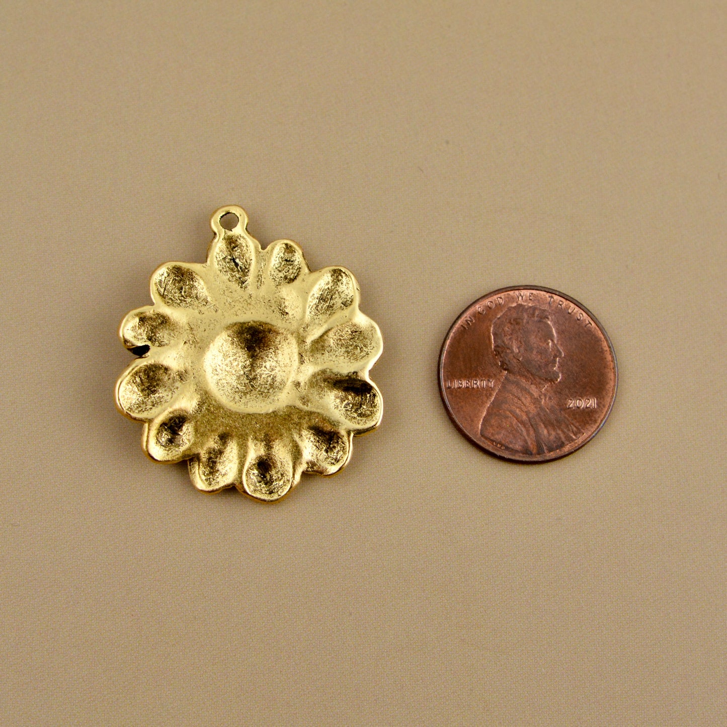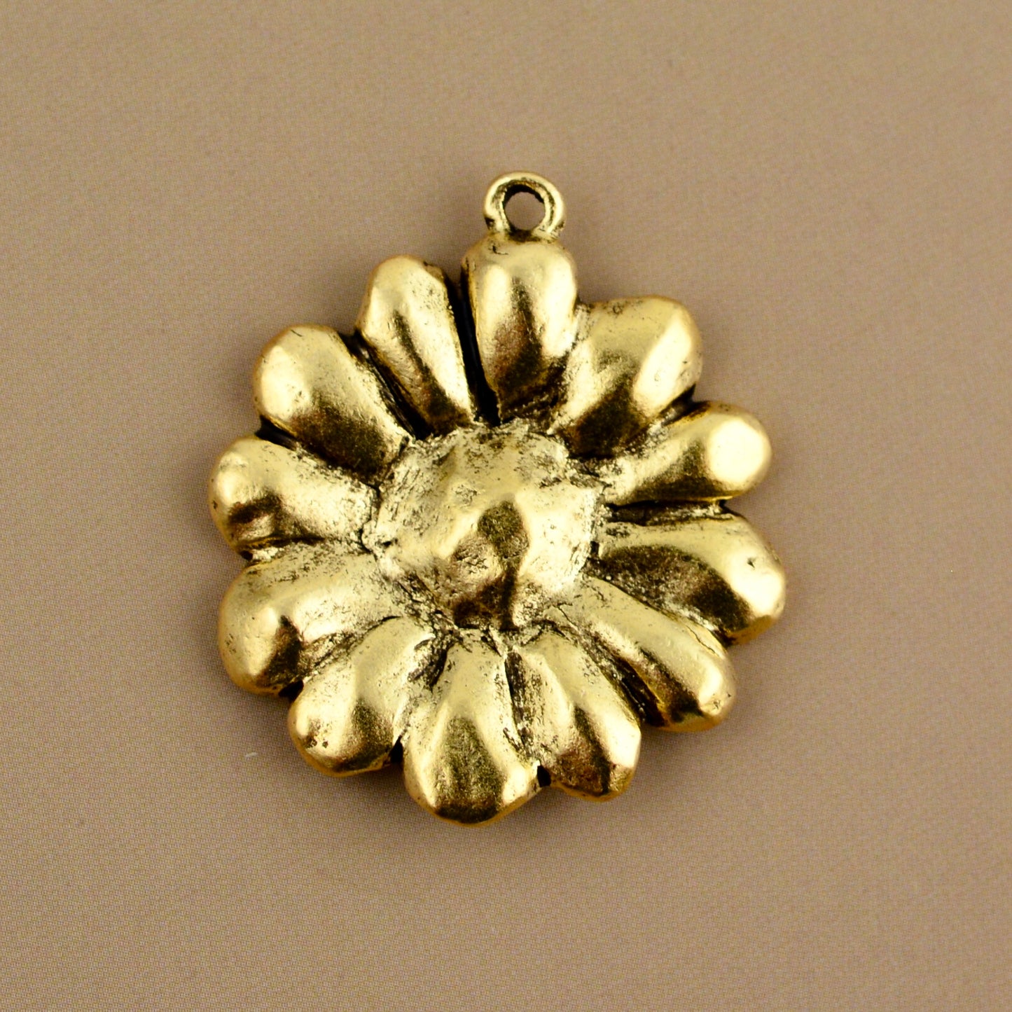 Add a bright, vintage-inspired feel to your jewelry with this antiqued gold round daisy pendant. Its textured surface highlights the delicate petals of the daisy, making each piece you create feel joyful and unique.
