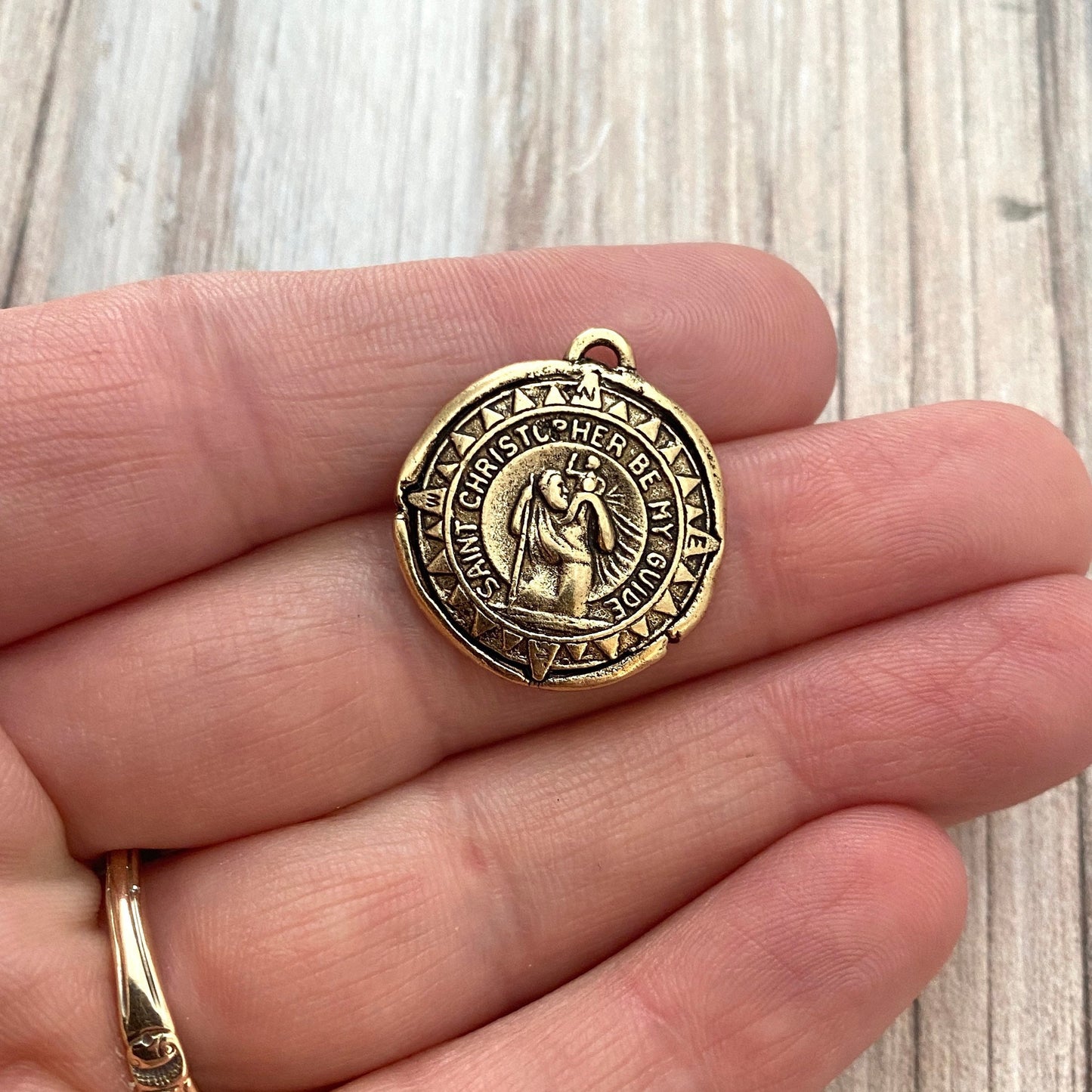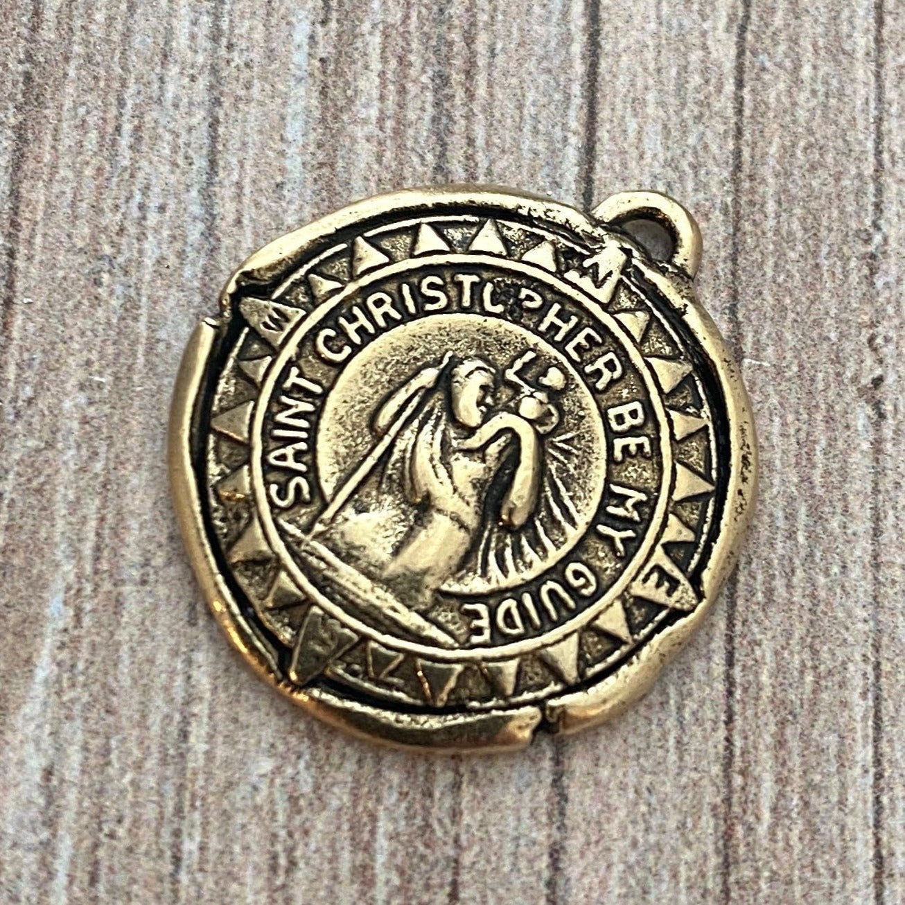 St. Christopher, Catholic Medal, Antiqued Gold Wax Seal Charm, Religious Medal, Compass, Saint, Protect Us, GL-6141