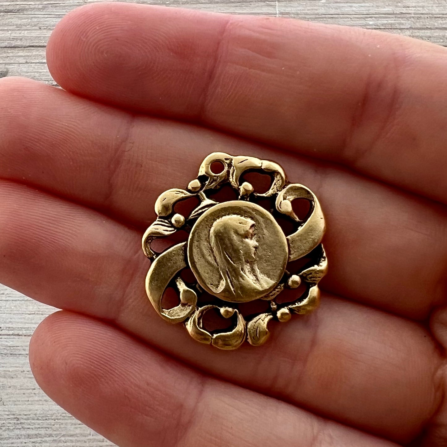 Mary Medal, Art Nouveau Medal, Antiqued Gold Religious Jewelry Making Charm Pendant, Catholic Jewelry, GL-6115