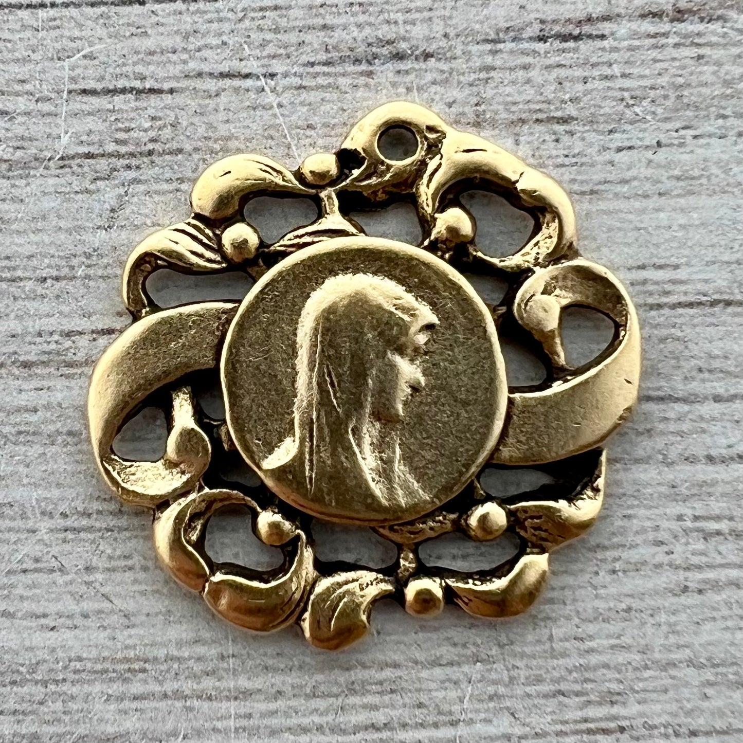 Filigree Virgin Mary Medal, Antiqued Gold Religious Jewelry Making Pendant, Catholic Jewelry, GL-6277
