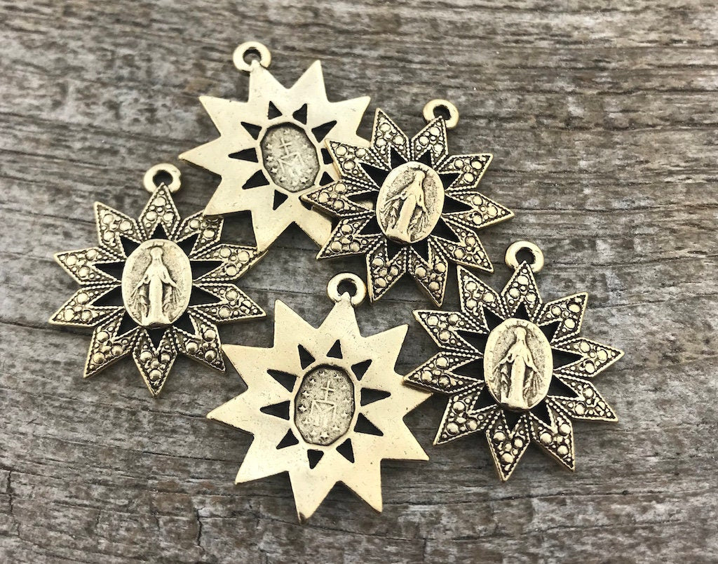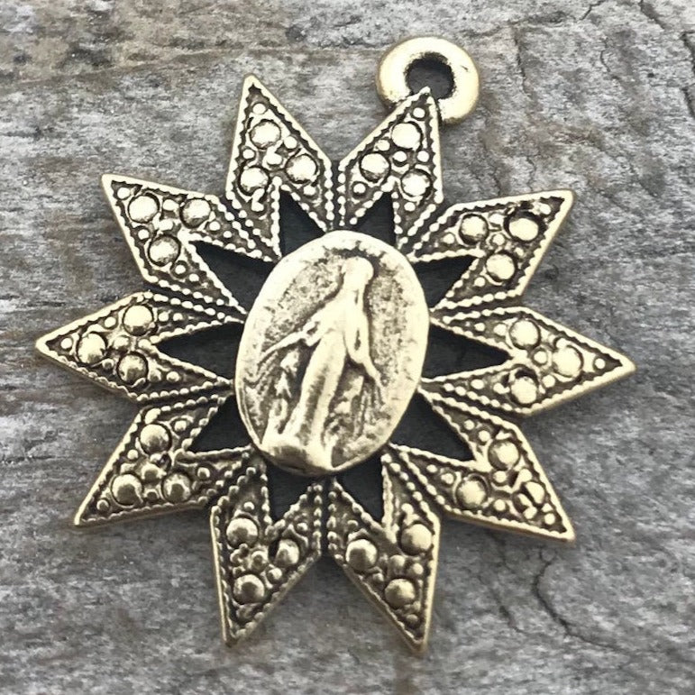Miraculous Medal, Mary Medal, Star Charm, Gold Medal Charm, Religious Art Deco Charm, Rosary, Catholic Pendant, Christian Jewelry, GL-6033