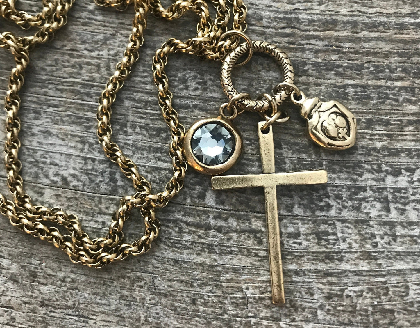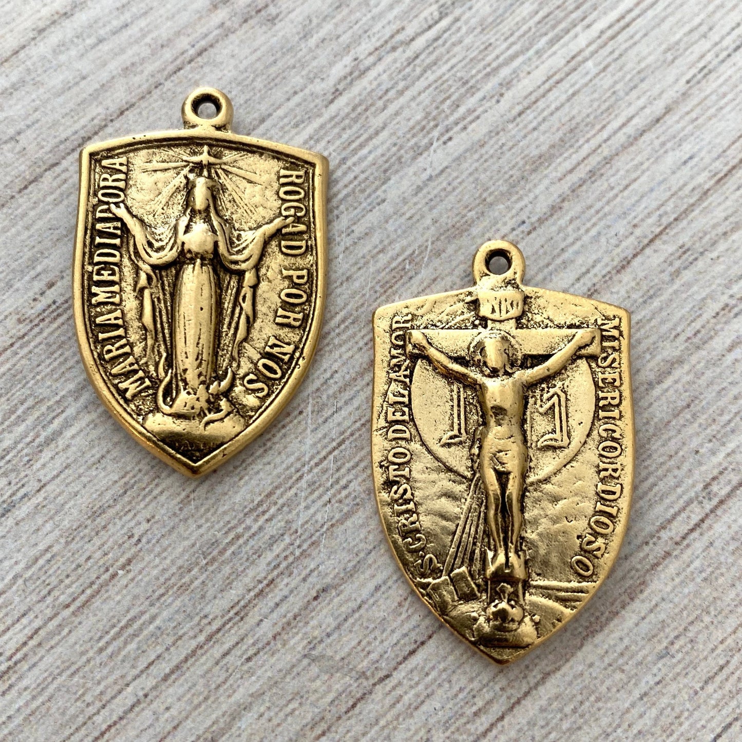 Virgin Mary Medal, Cross Pendant, Crucifix Shield, Antiqued Gold Rosary Parts, Catholic Religious Jewelry Supply, GL-6079