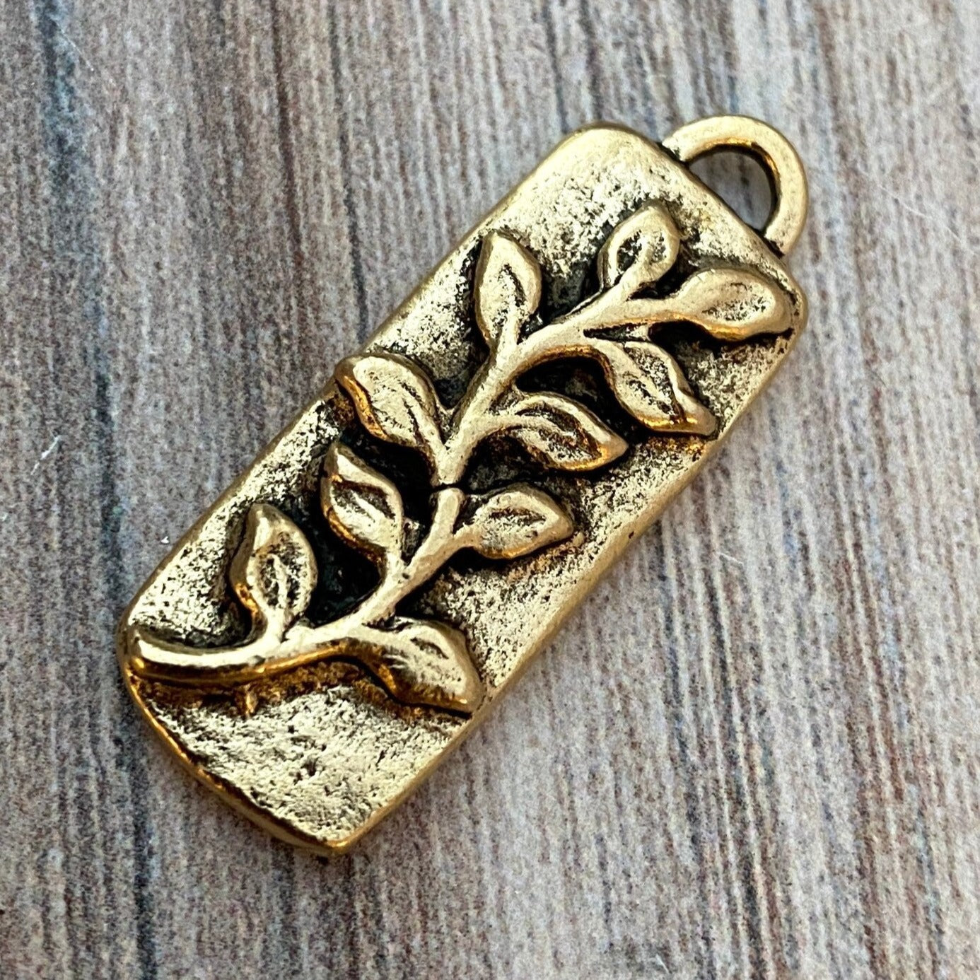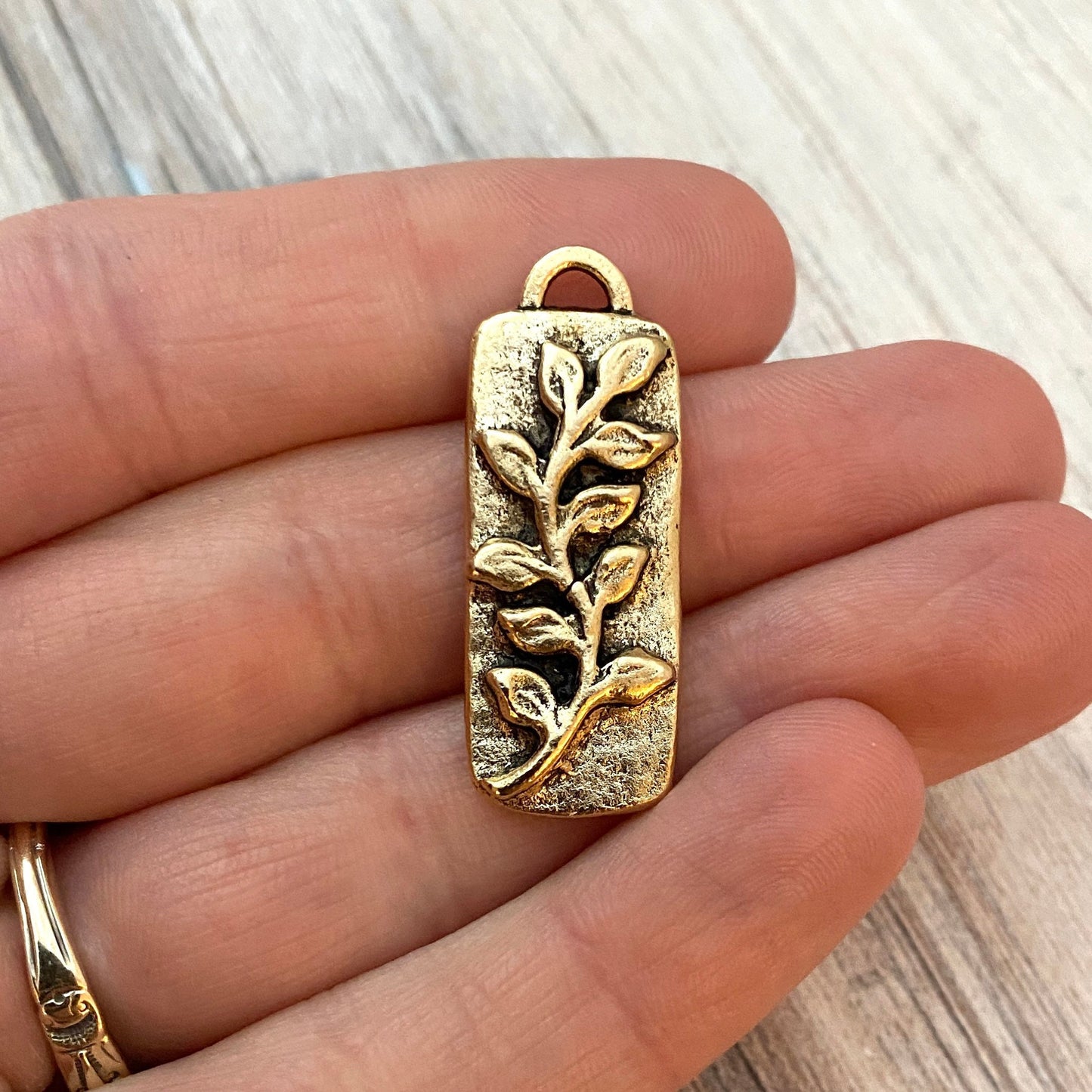 Vine Flower Bar Pendant, Antiqued Gold Rectangle Charm for Jewelry Making, GL-6122