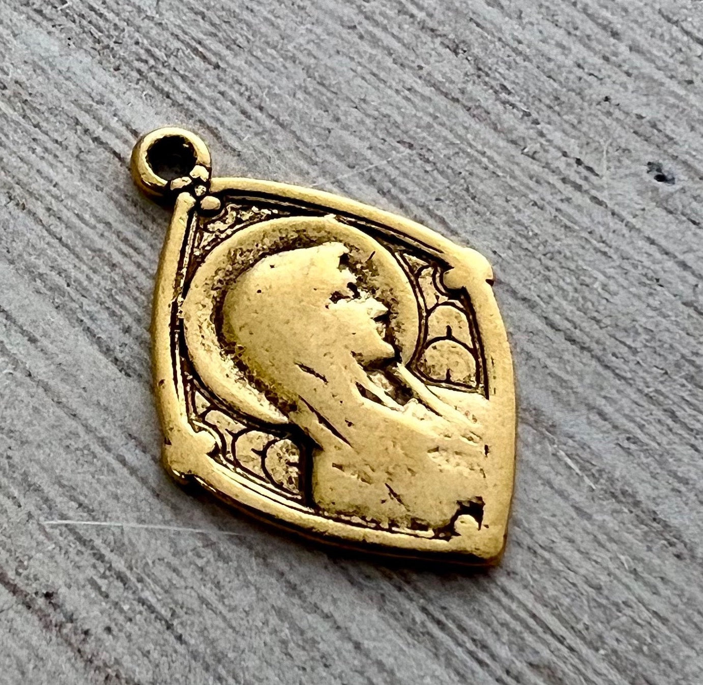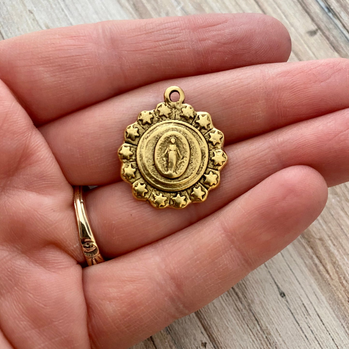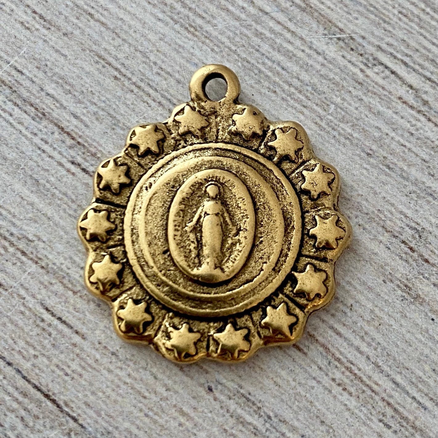 Mary Medal with Stars, Antiqued Gold Charm, Religious Rosary Parts, Catholic Pendant, Christian Jewelry, GL-6152