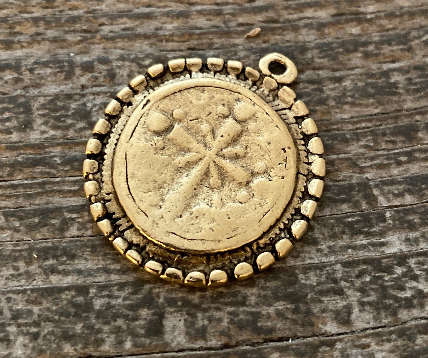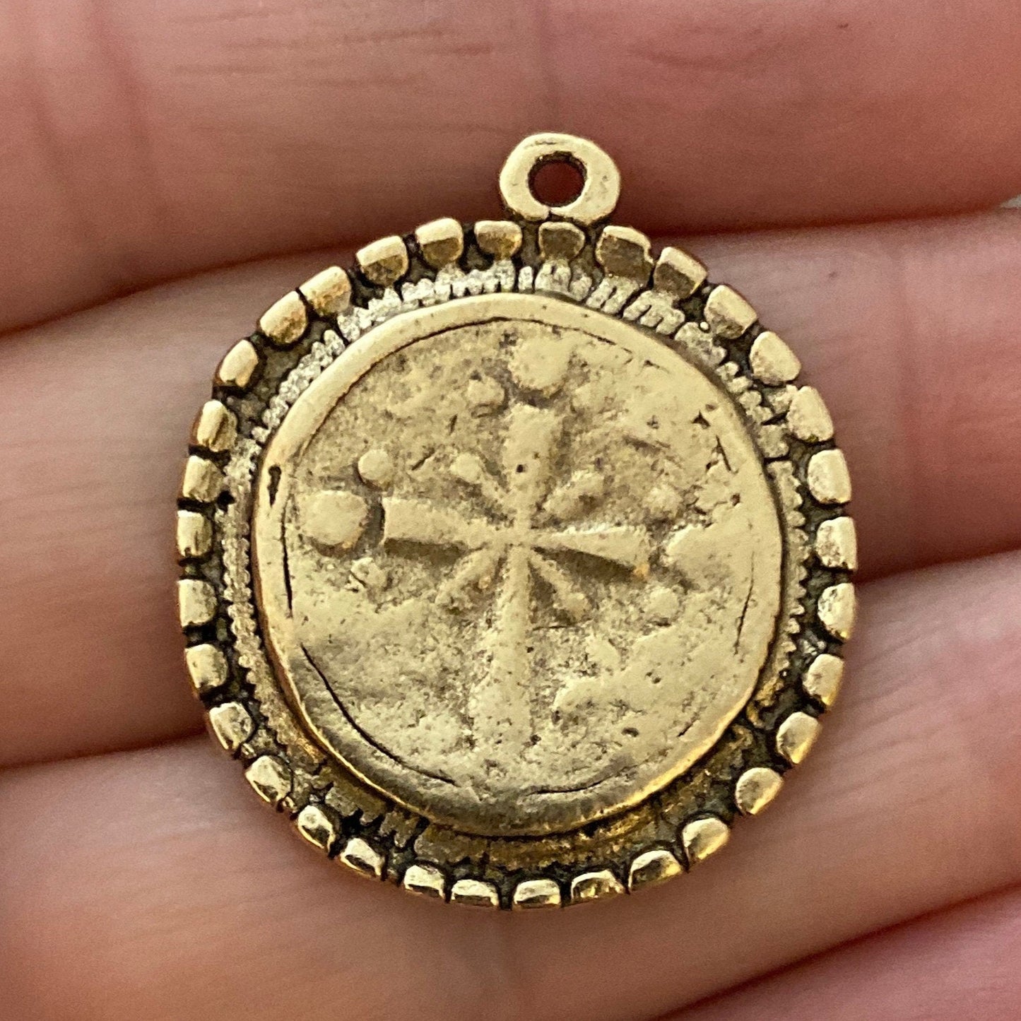Dotted Ancient Circle Cross Charm Token, Antiqued Gold Religious Christian Jewelry Making Supplies, GL-6166