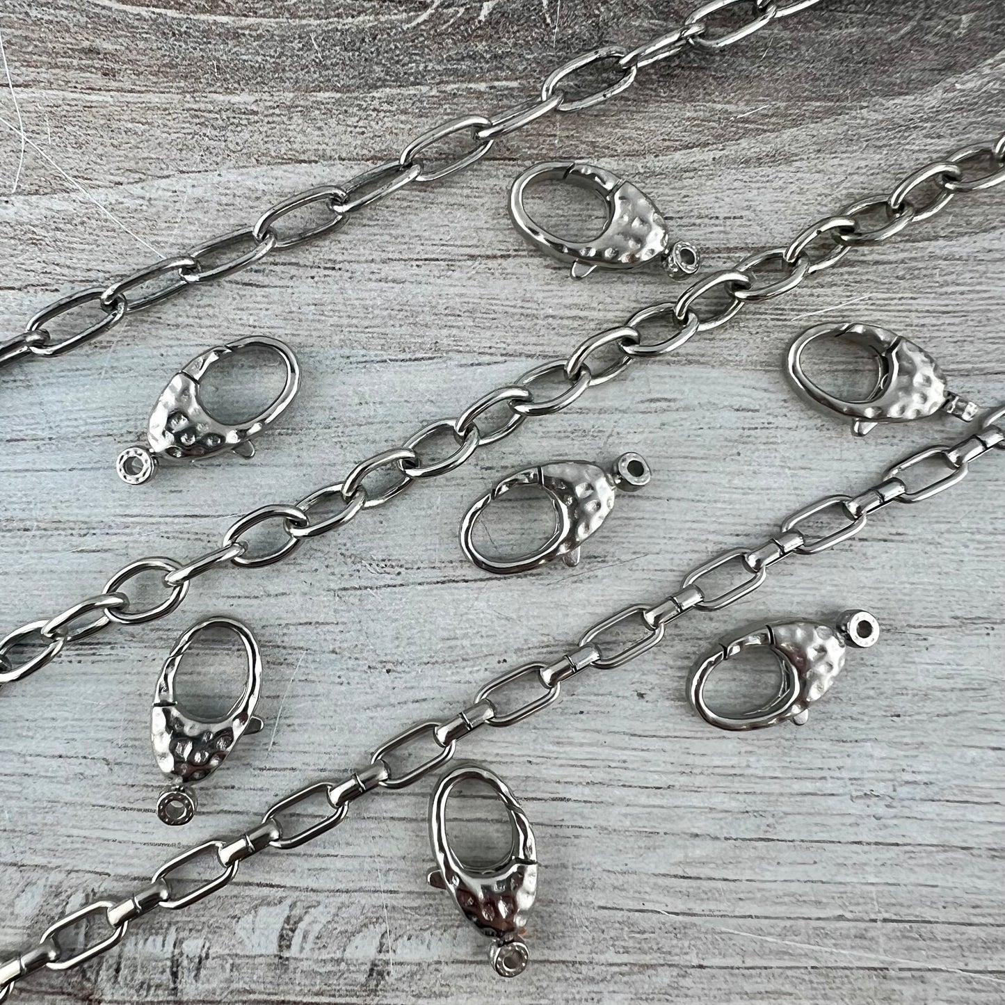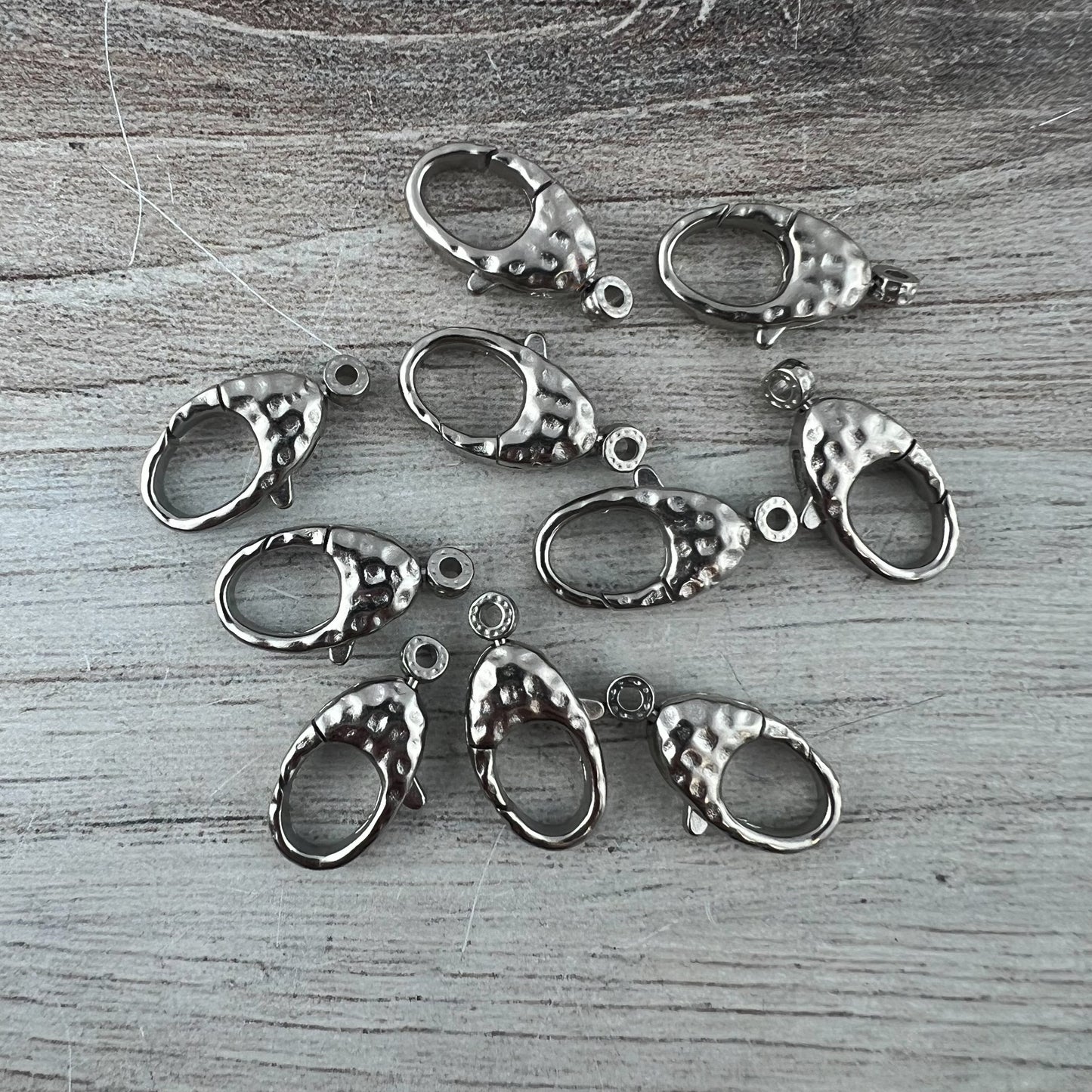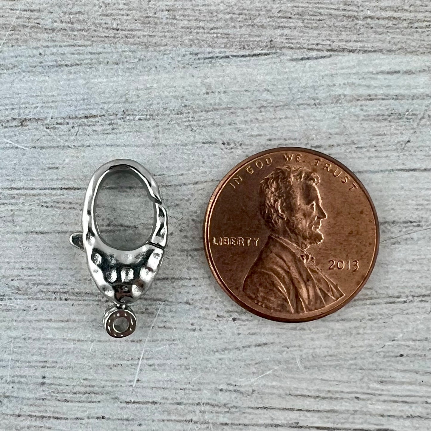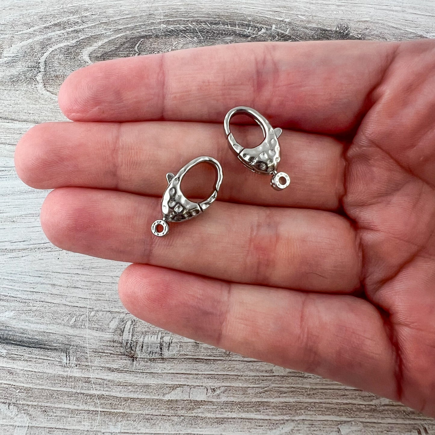 This medium sized hammered lobster clasp is perfect for a variety of jewelry pieces, such as bracelets and necklaces. The attached ring swivels. You receive two.
