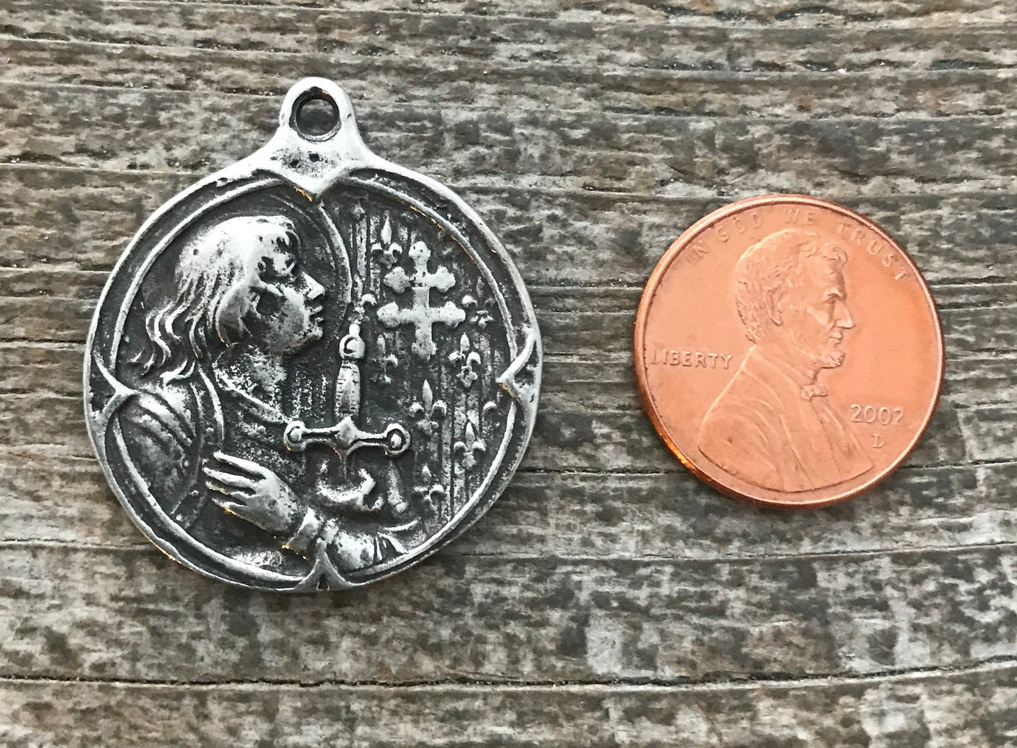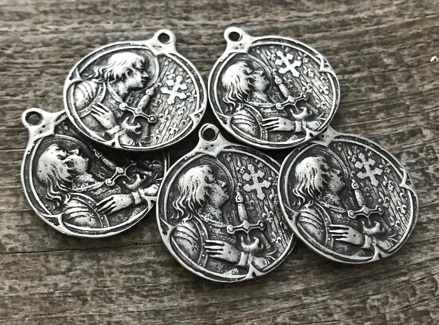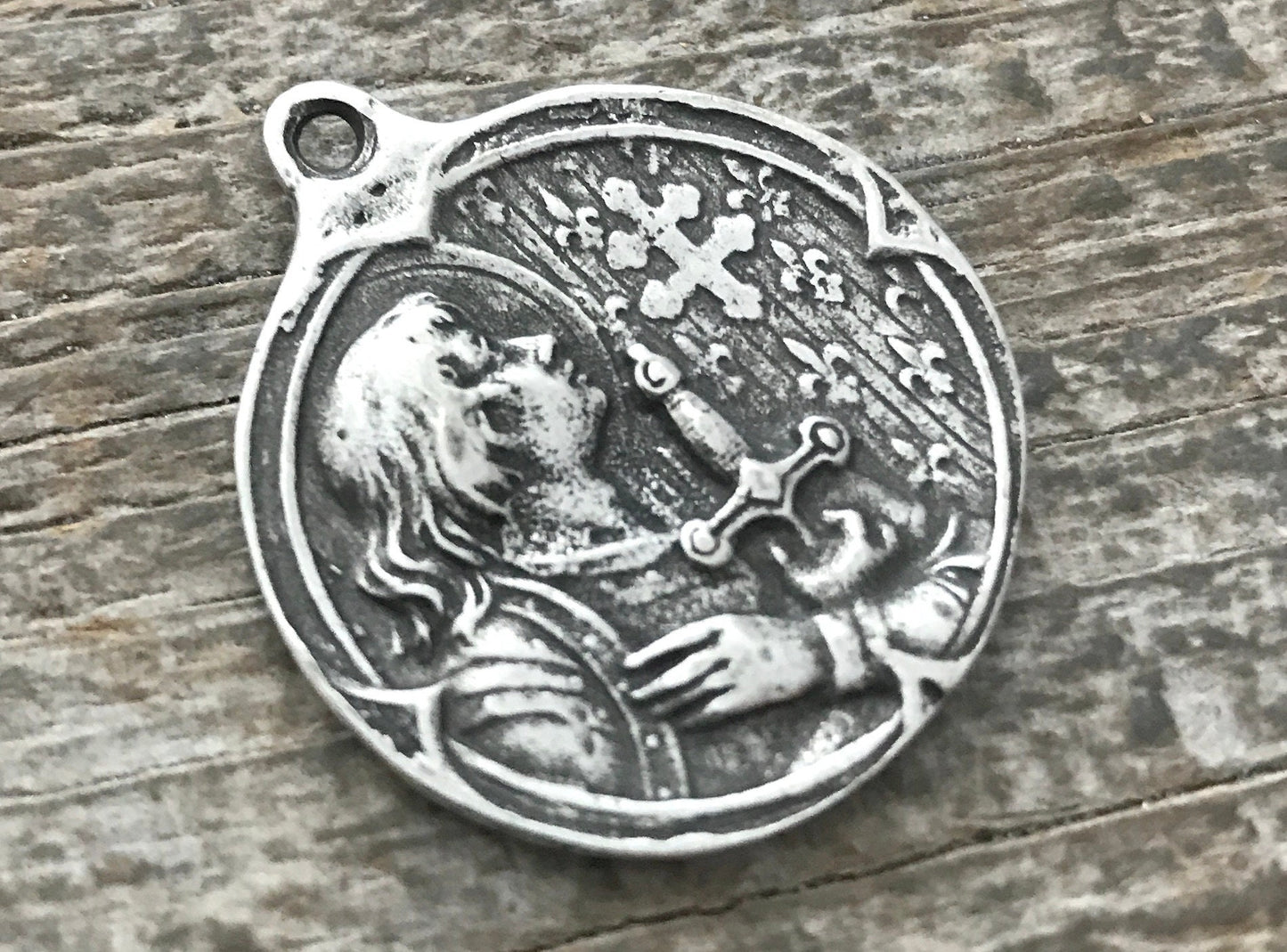 This unique and lovely medal depicts Joan of Arc, known for her intense bravery and devotion to hearing and following her convictions. She is known as the patron saint of soldiers. Here is a brief history from history.com: "Joan of Arc, a peasant girl living in medieval France, believed that God had chosen her to lead France to victory in its long-running war with England.