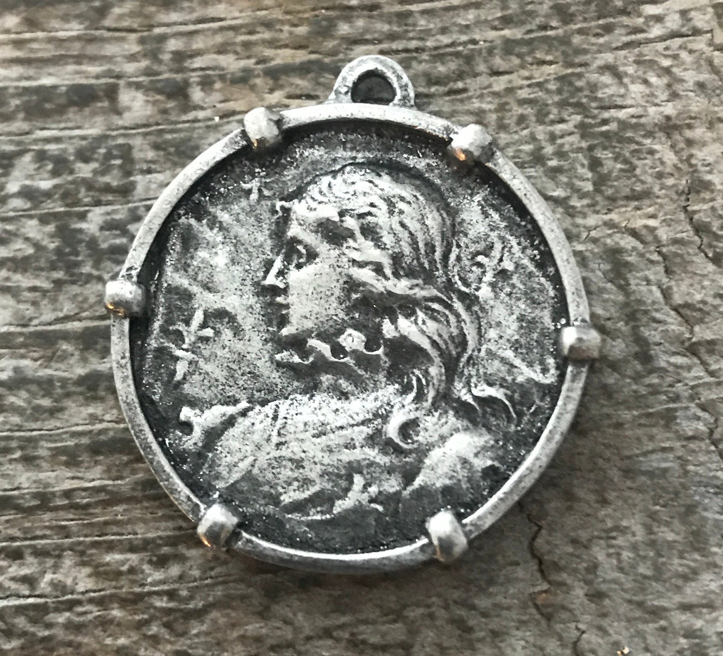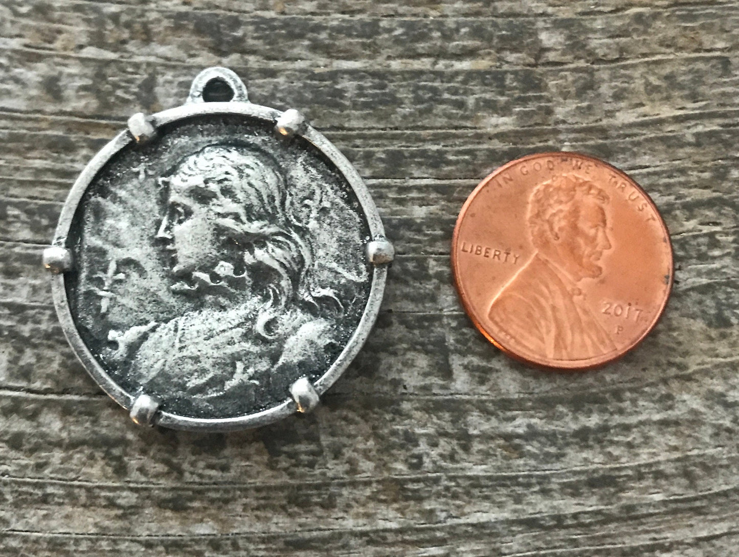 This unique and lovely medal depicts Joan of Arc, known for her intense bravery and devotion to hearing and following her convictions. She is known as the patron saint of soldiers. I bought the original of this medal from France. It dates circa early 1900’s. This medal is thick and has a very nice weight to it.