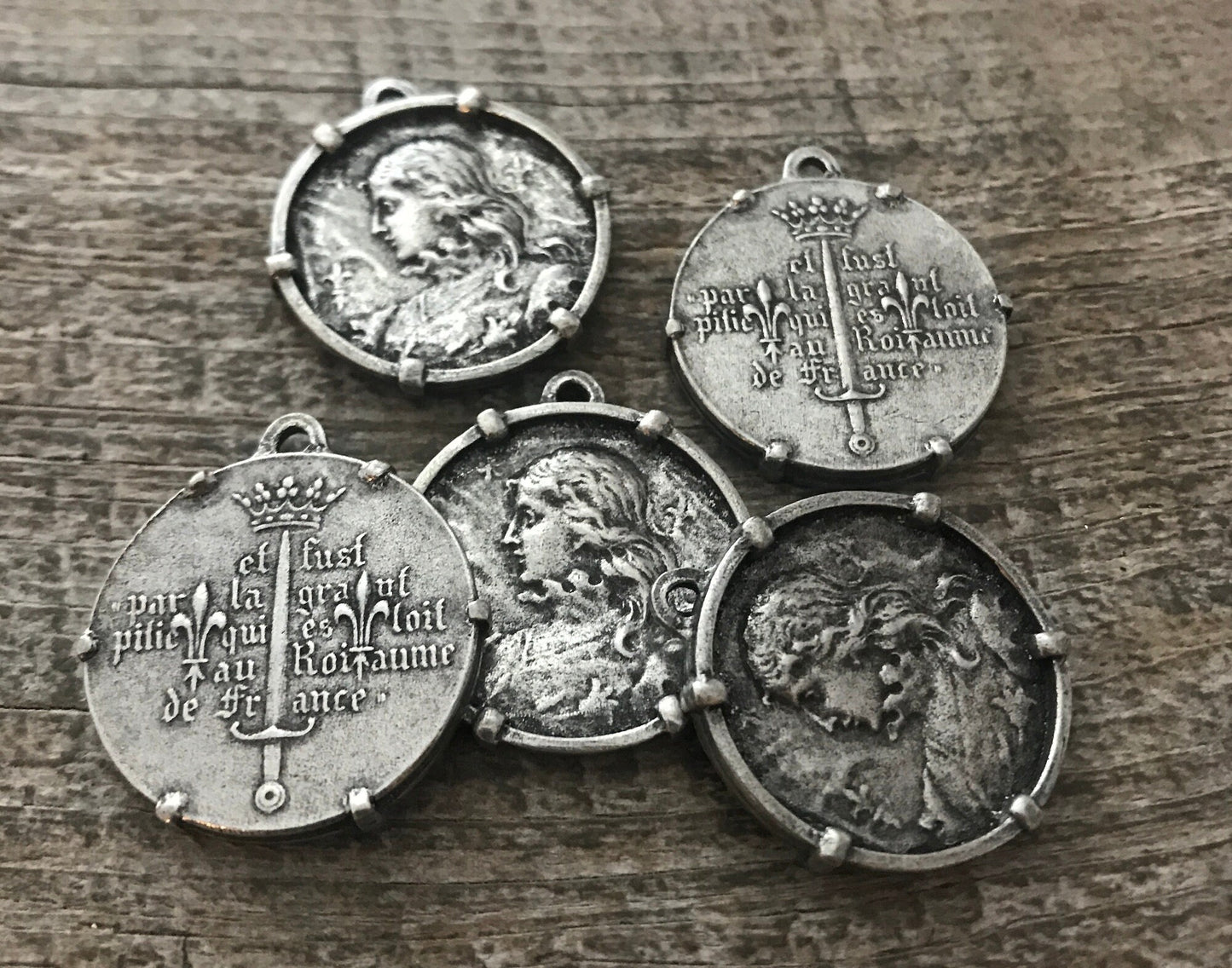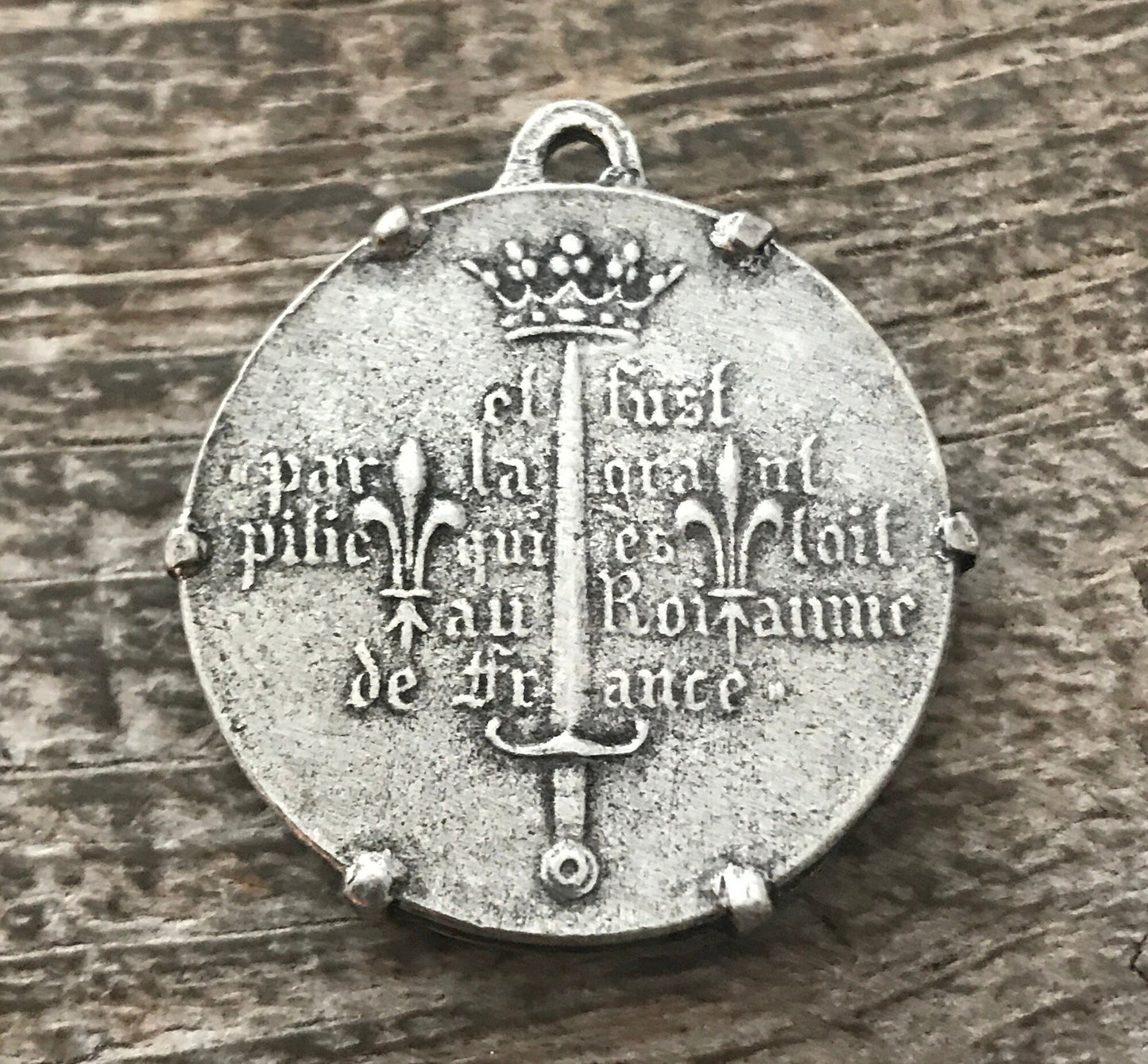 The back is written in French and translates to: “There is great pity in the kingdom of France.” That is what the Archangel St. Michael told Joan of Arc in the year 1429. Here is a brief history from history.com about Joan of Arc: "Joan of Arc, a peasant girl living in medieval France, believed that God had chosen her to lead France to victory in its long-running war with England.