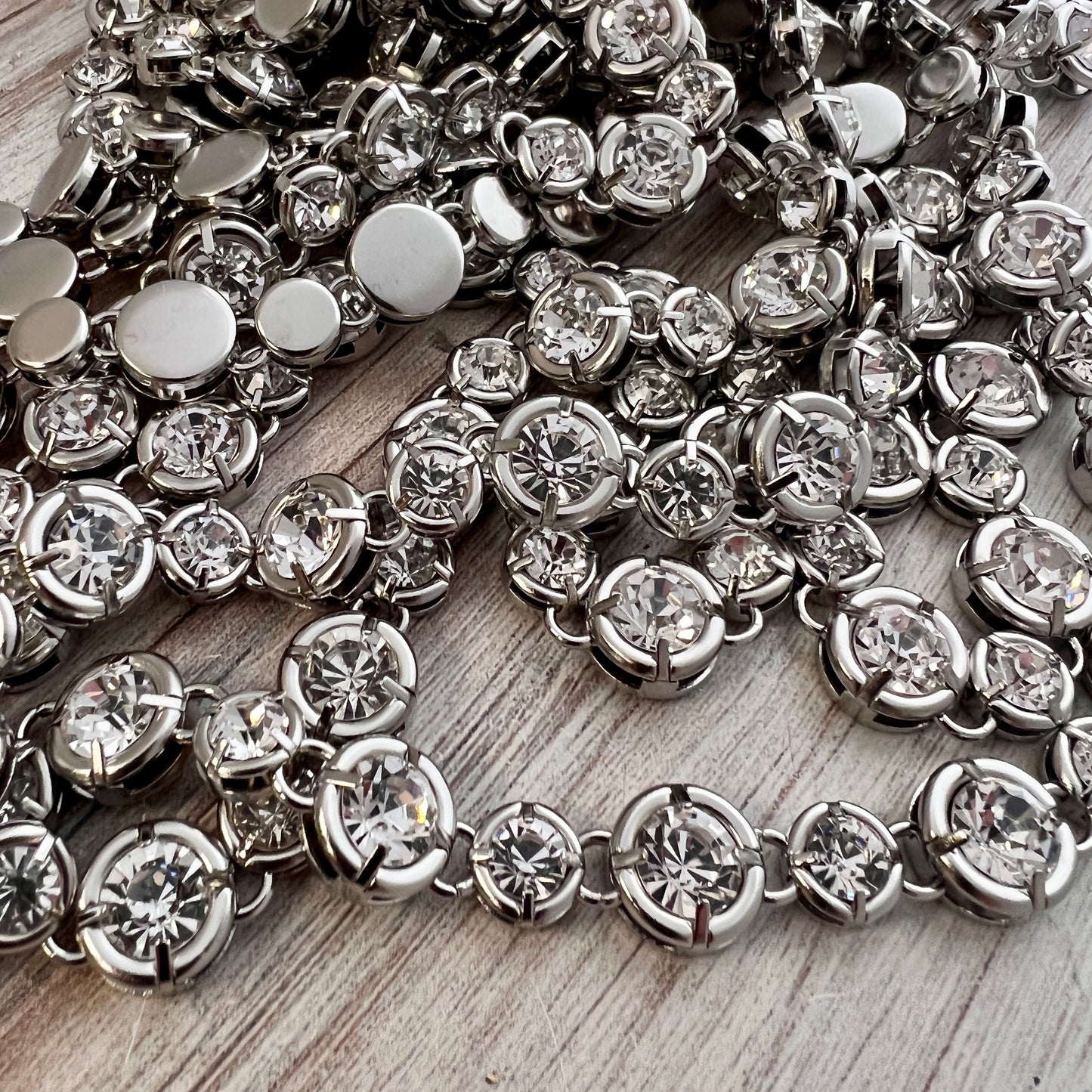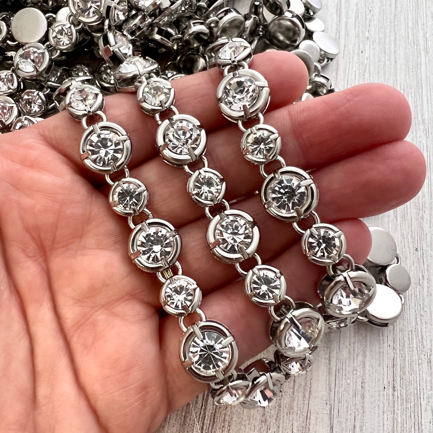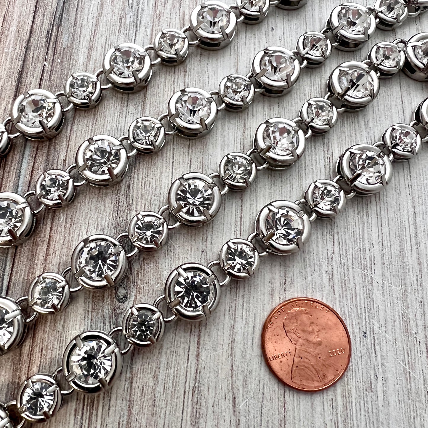 This chain is an eye-catcher! There are alternating crystals of two sizes. This is sold by the foot, but we ship in one continuous length unless requested otherwise.