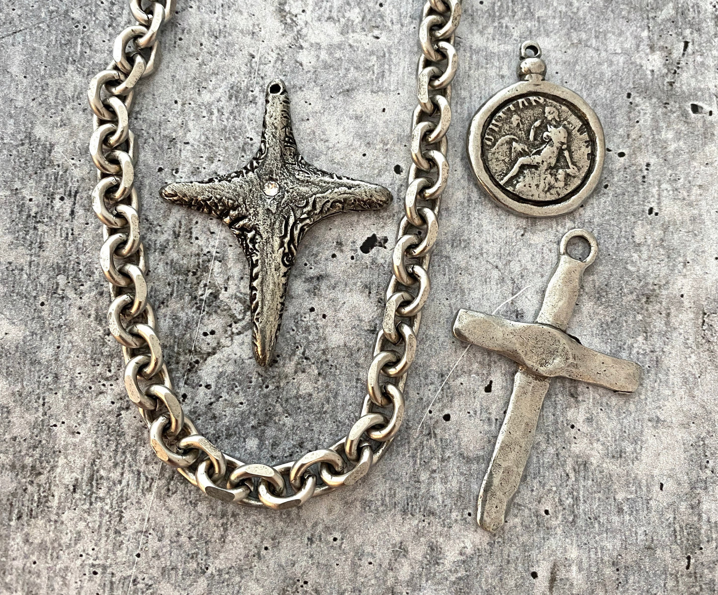 CC pewter components are made of high-quality pewter that is free of lead and cadmium. Most CC chain is made of regular steel, and some is made of brass. It is then plated with the various CC finishes. CC plating is known to hold up very well over time, but as always with any plated items, we recommend keeping it away from water and perfume.