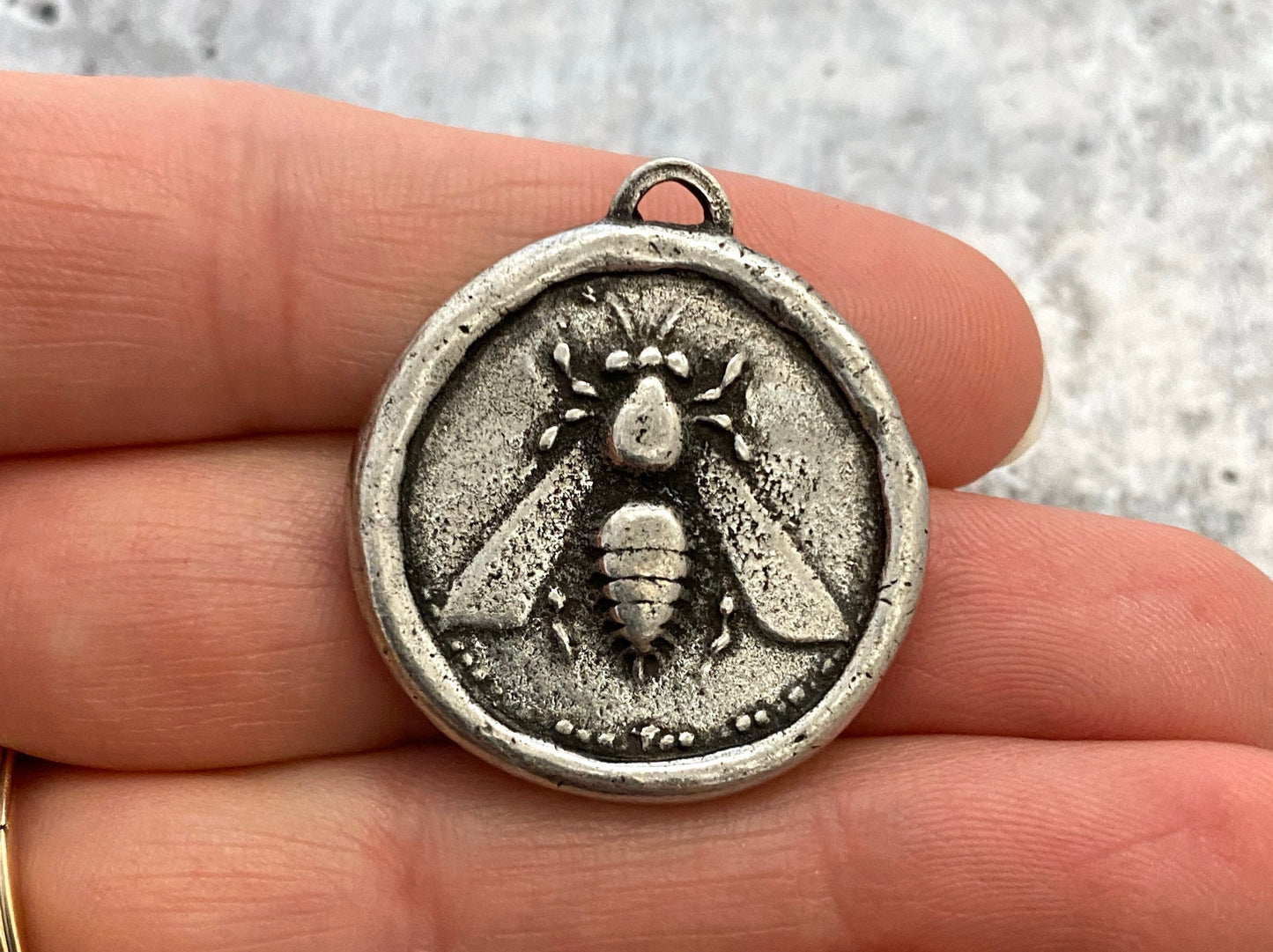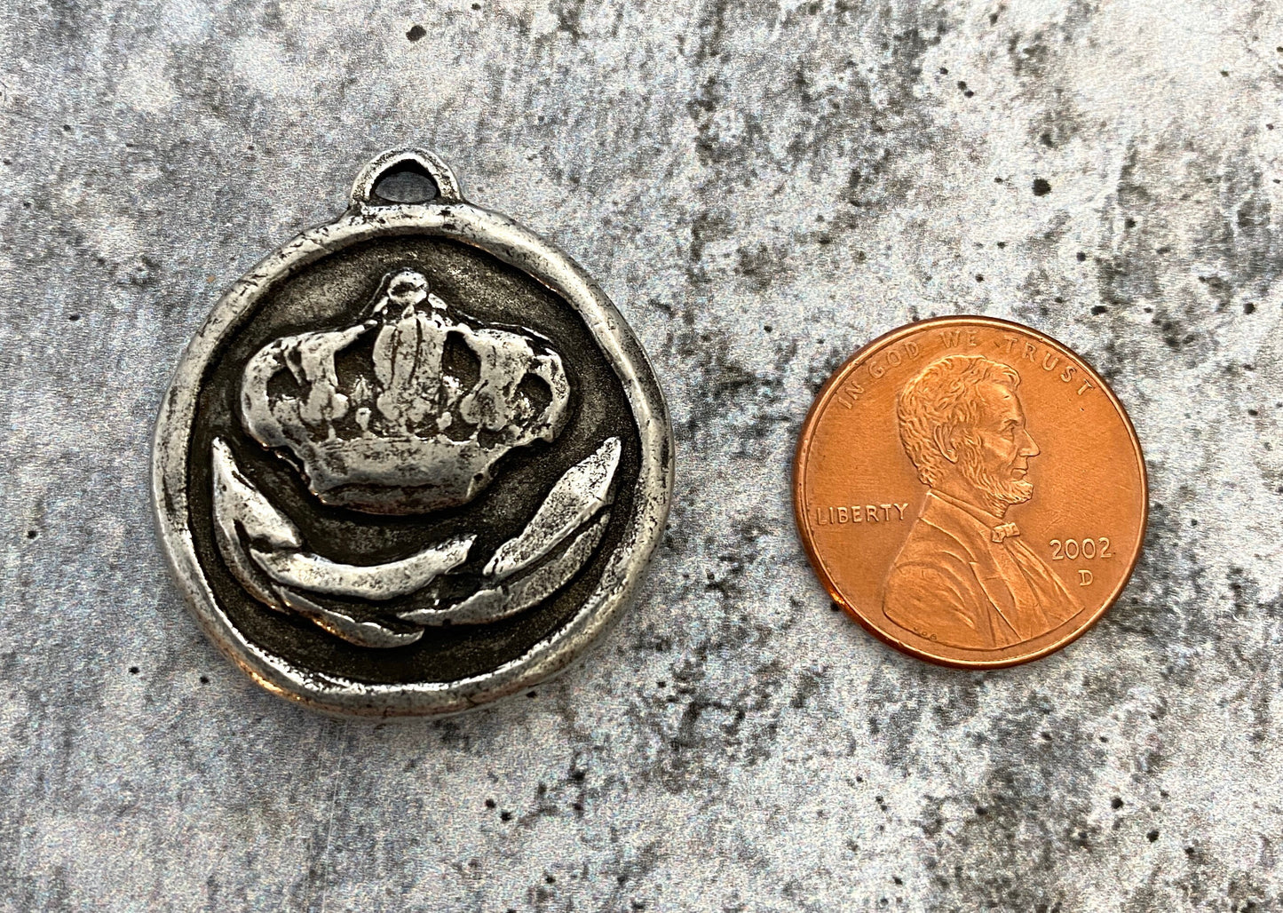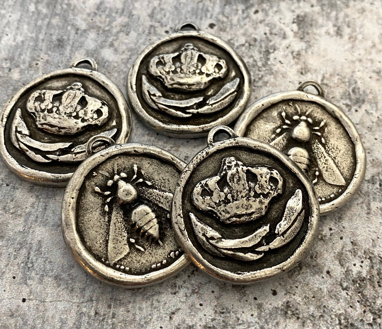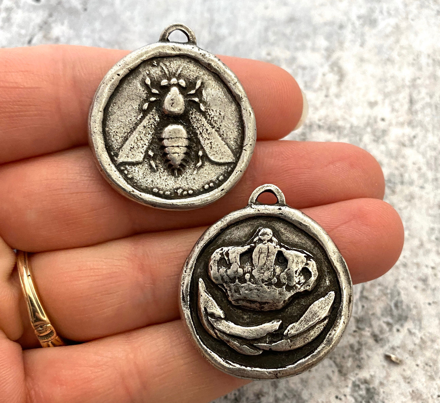 This pendant features a bee on one side and an aristocratic, old-world crown and laurel leaf on the other. This piece is quite weighty, and it feels wonderful to hold. This makes a wonderful component for a necklace or bracelet.