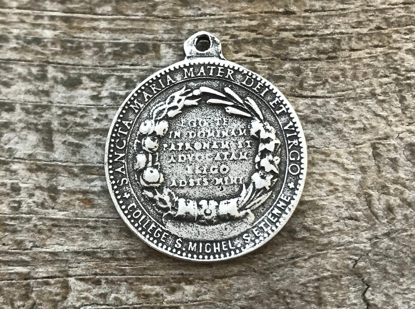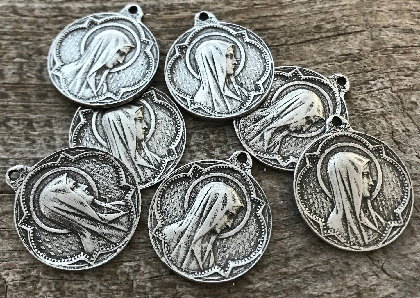 This is a beautiful medal of the Virgin Mary. The back contains writing in Latin. The size of this makes it so versatile - use it for a necklace, earrings, bracelet, or even a keychain.