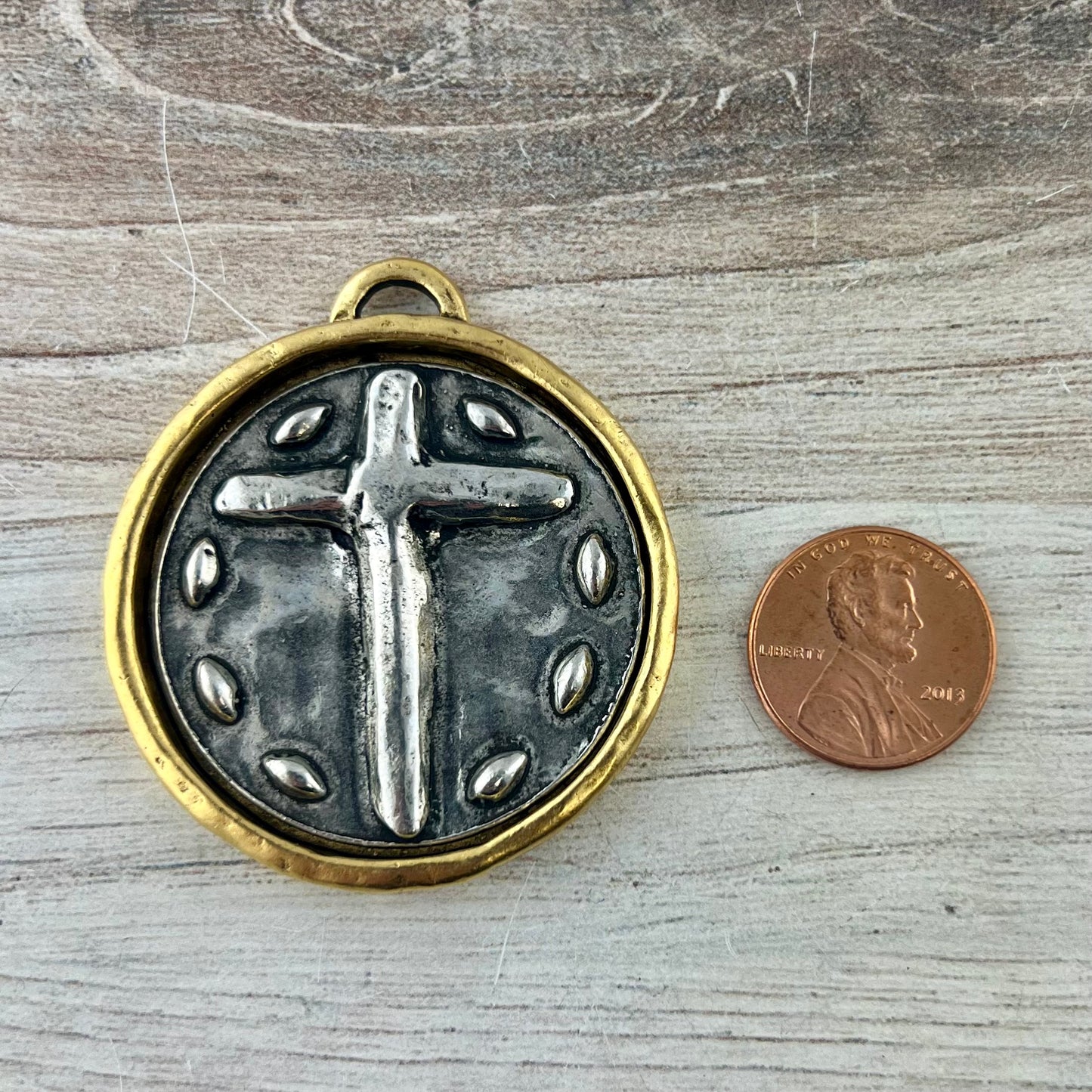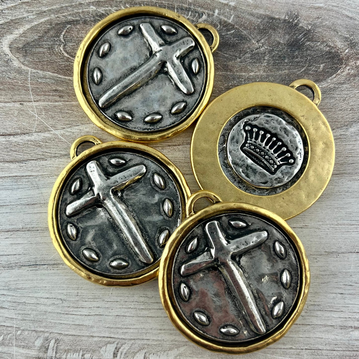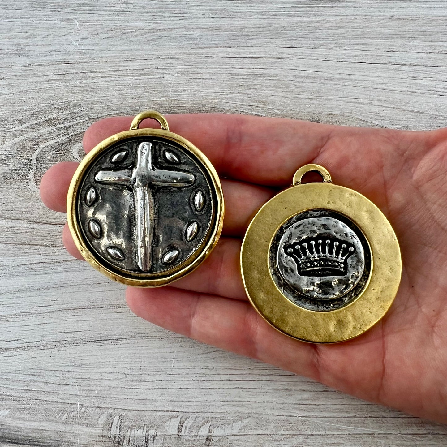 This mixed metal coin pendant is perfect for making a classy statement. It has a really nice weight to it. It features a charming dotted cross on the front and a regal crown on the back.