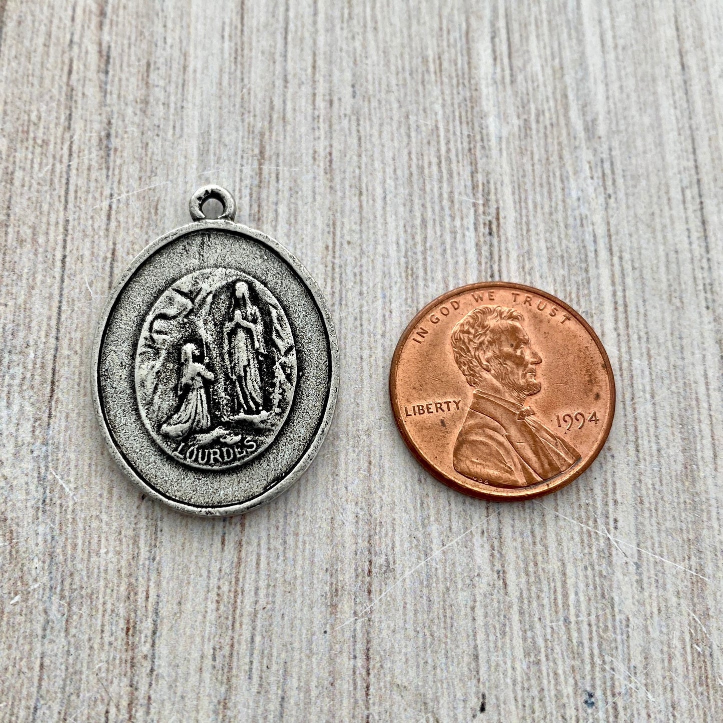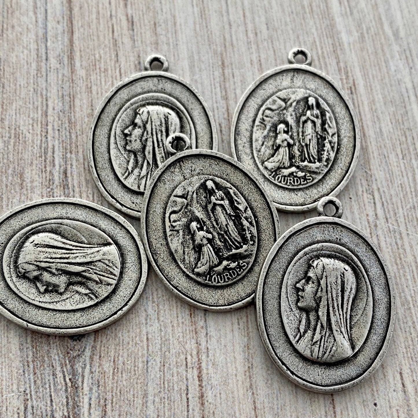 Oval Mary Medal, Virgin Mary, Our Lady of Lourdes, Catholic Necklace, Religious Antiqued Silver French Charm, PW-6207