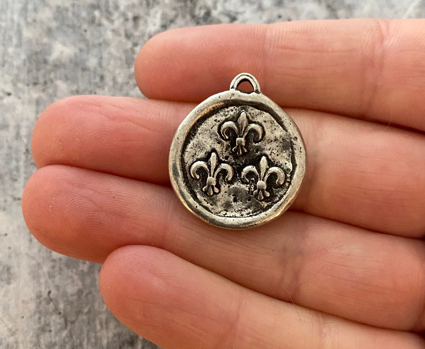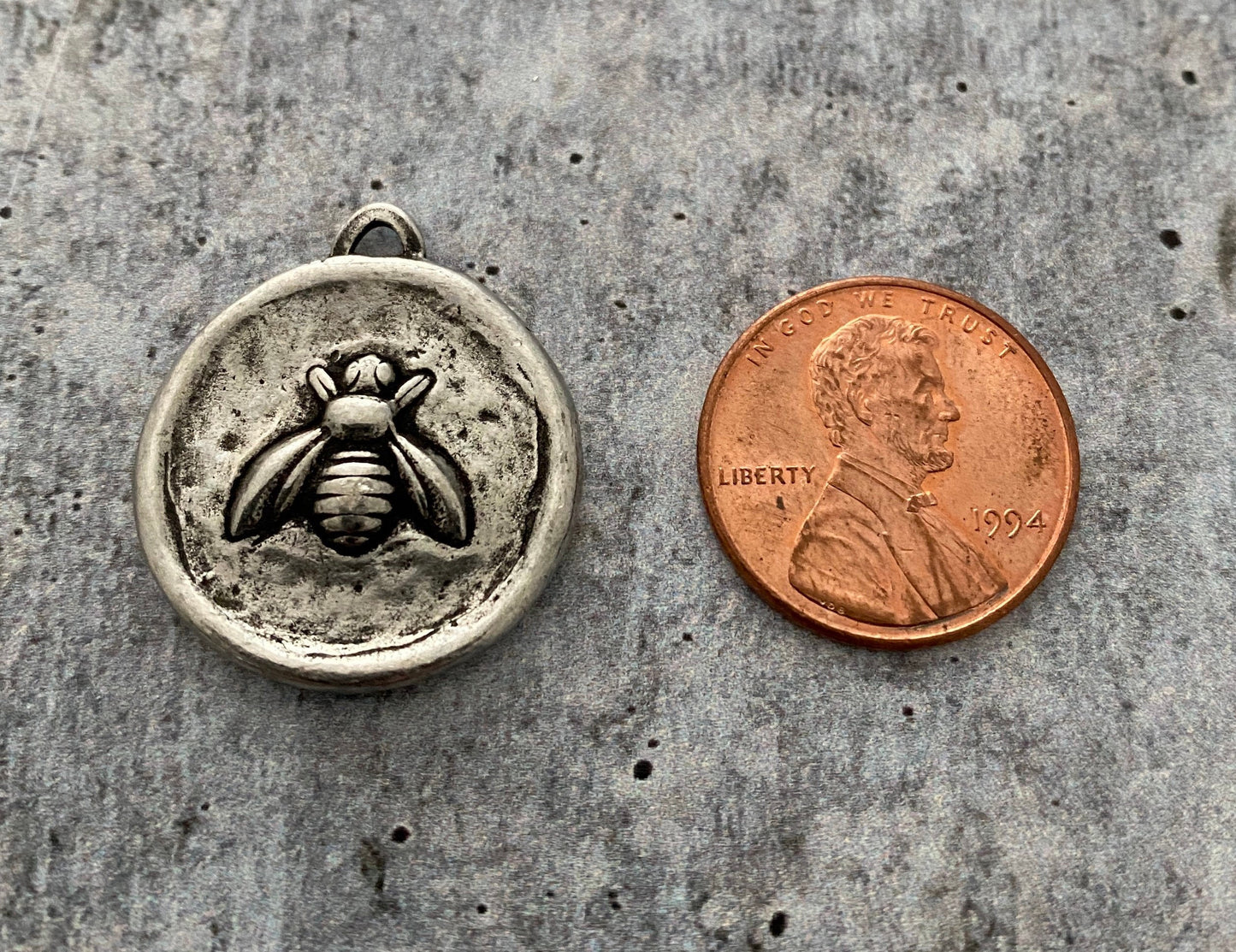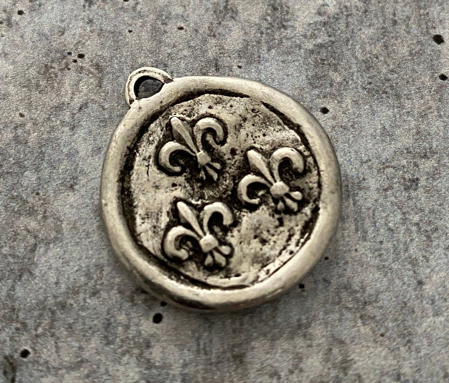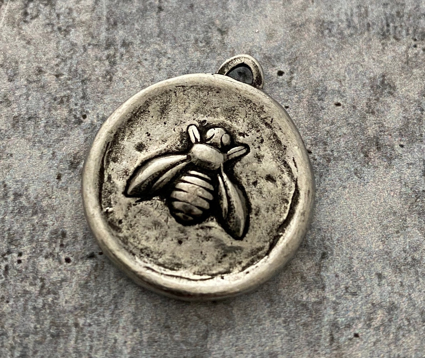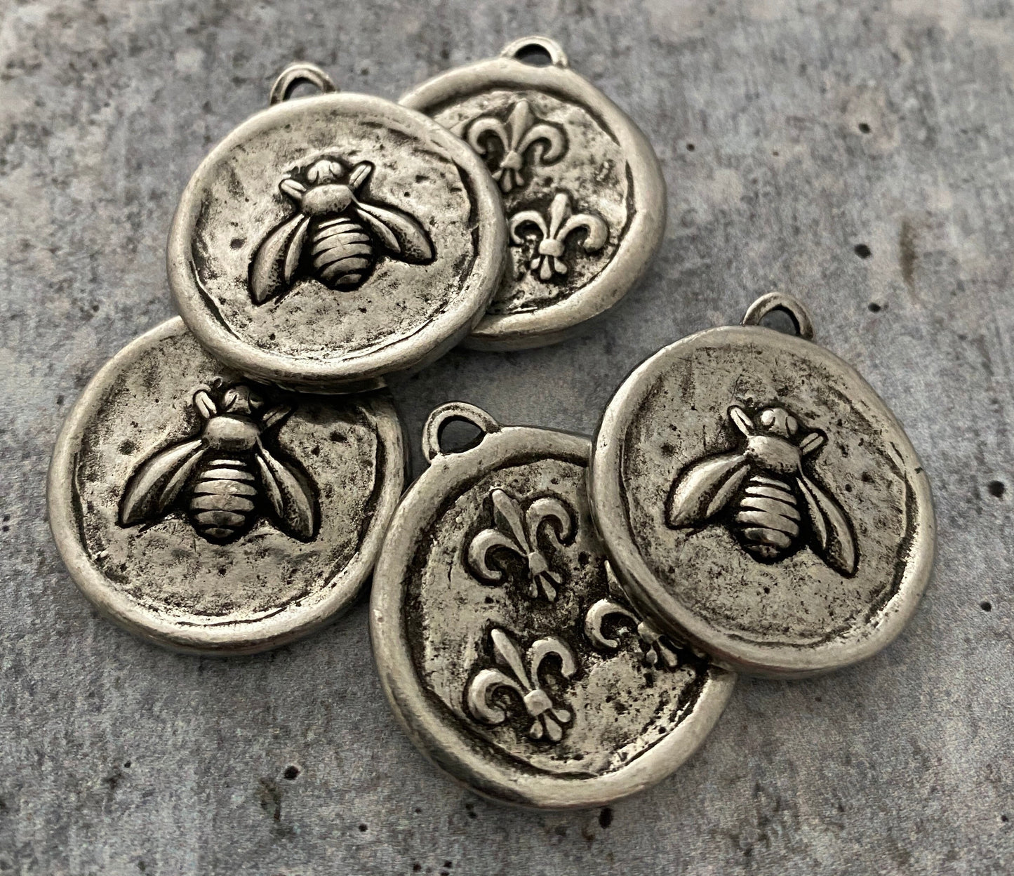 This soldered little honey bee is just the cutest. The fleurs-de-lis on the reverse side gives you two charms in one.