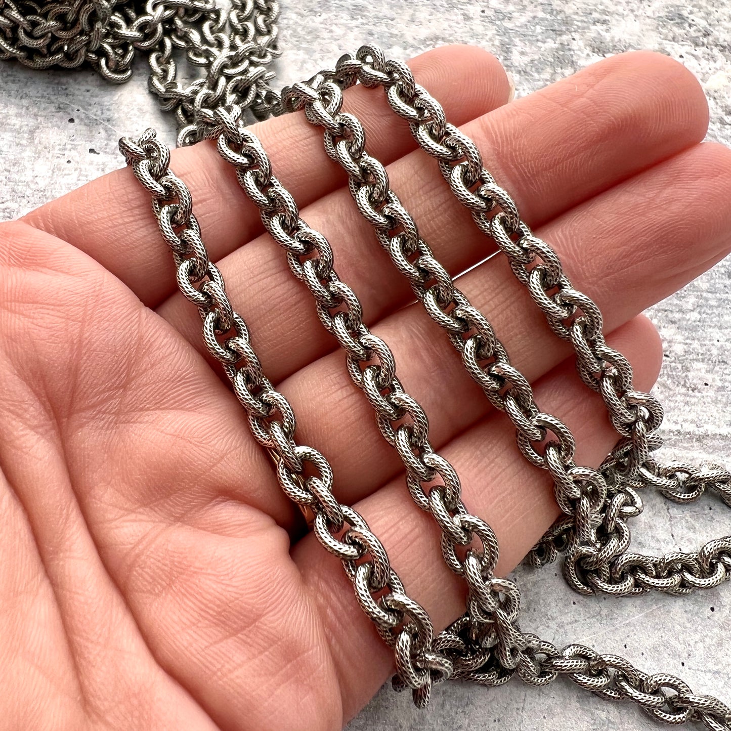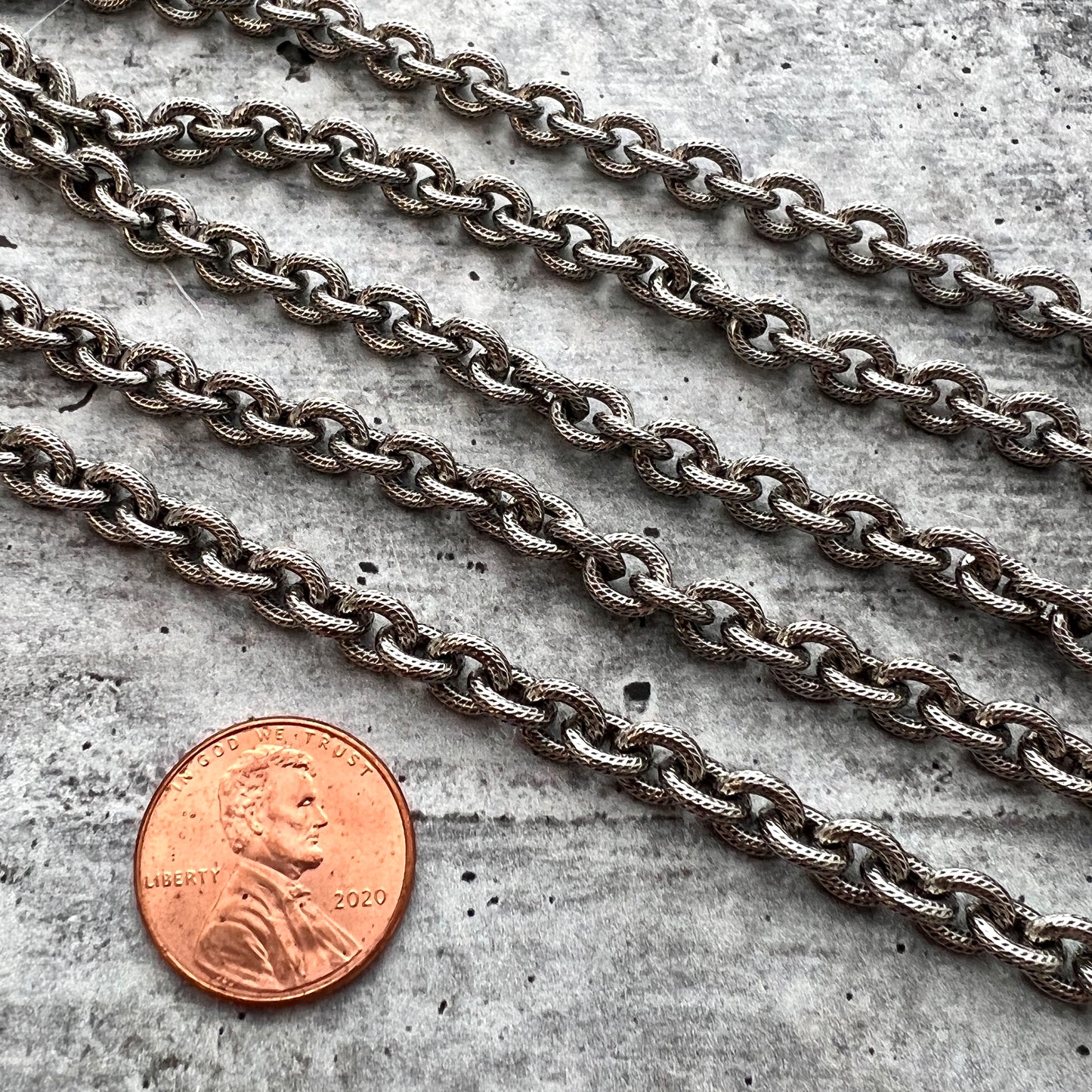 This chain is thick, sturdy, and gorgeous. The links have a subtle texture. This is sold by the foot, but we ship in one continuous length unless requested otherwise.