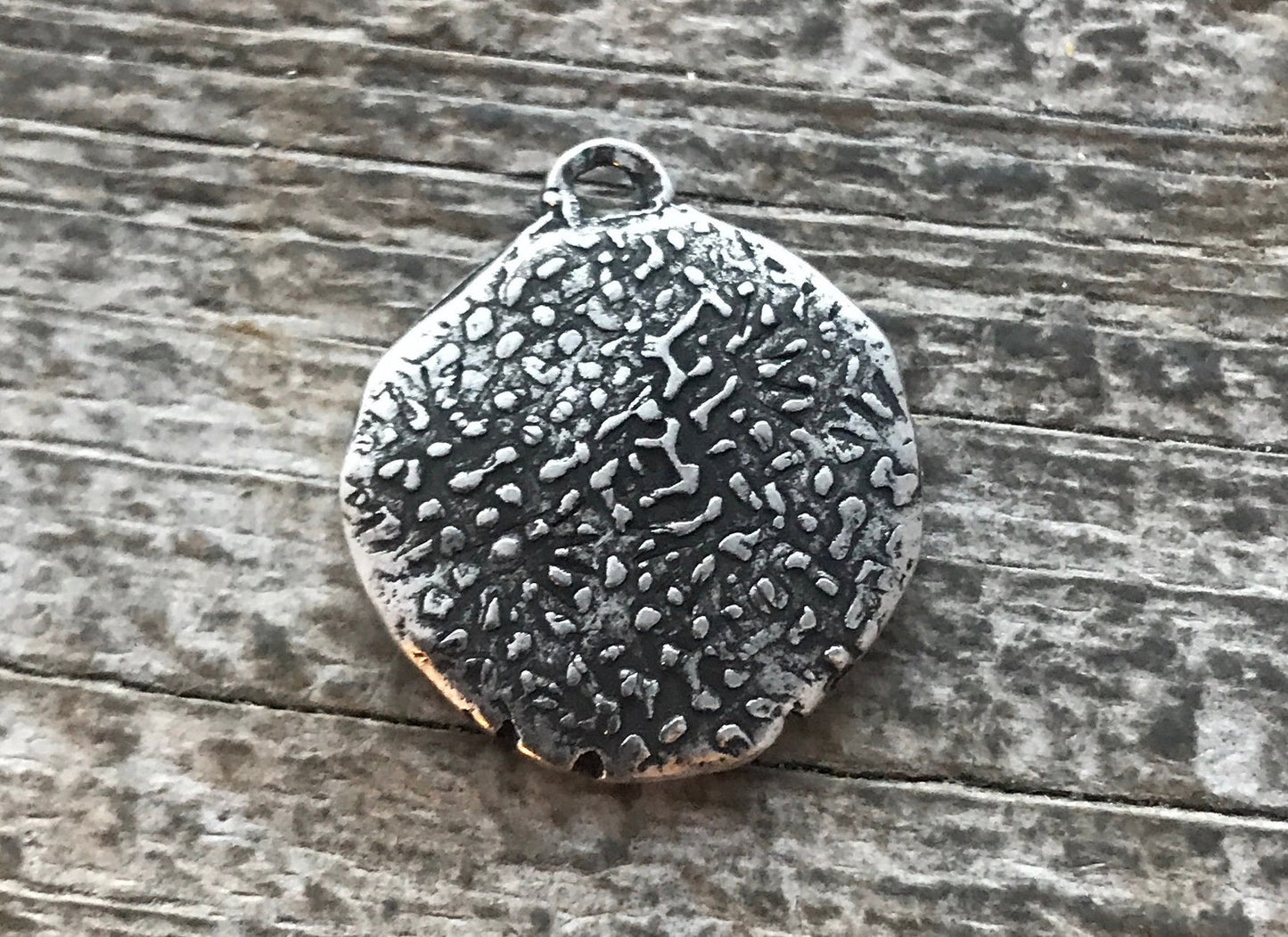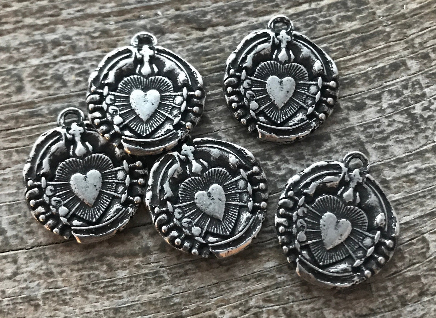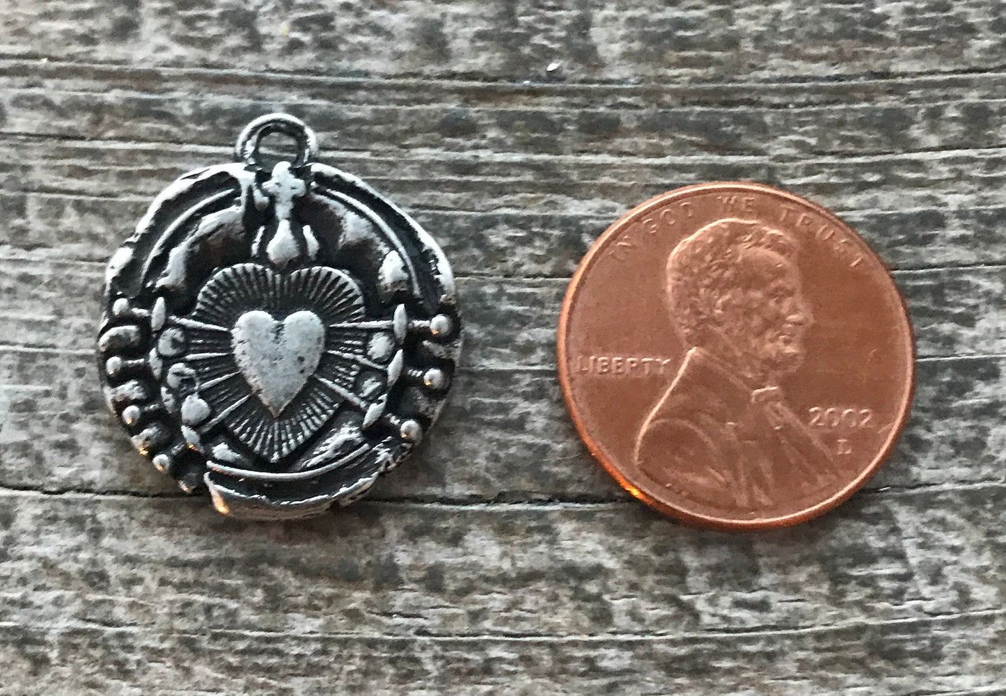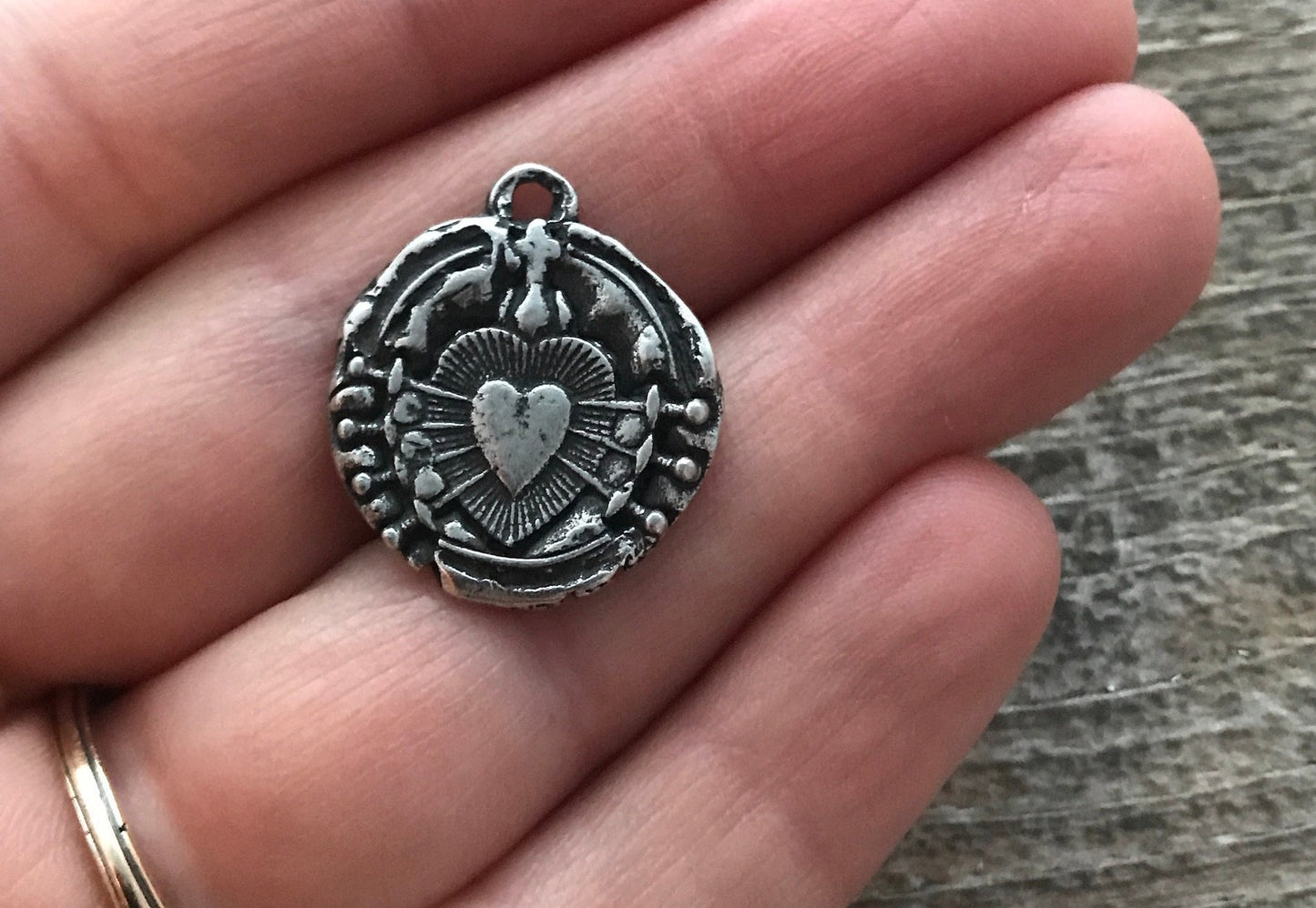 Wax Seal Medal, Catholic Religious Immaculate Heart of Seven 7 Sorrows, Sacred, Oxidized Antiqued Silver Charm, Religious Jewelry, PW-6062