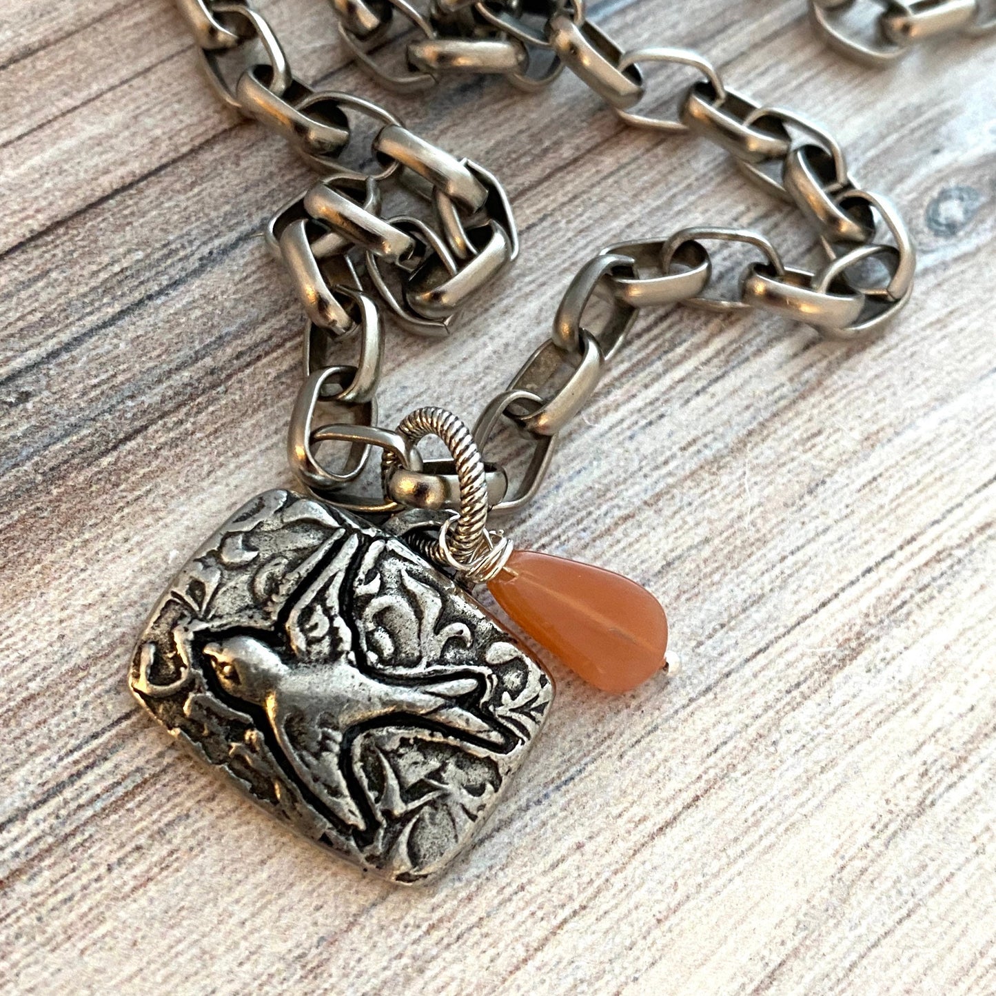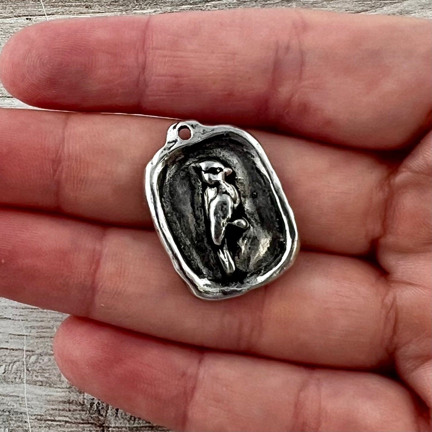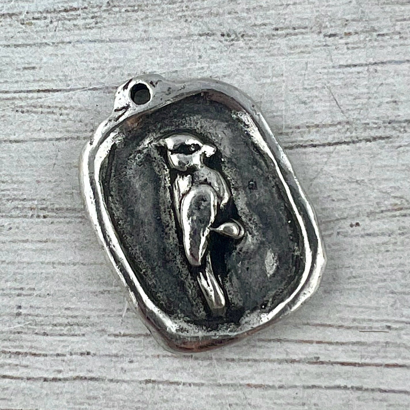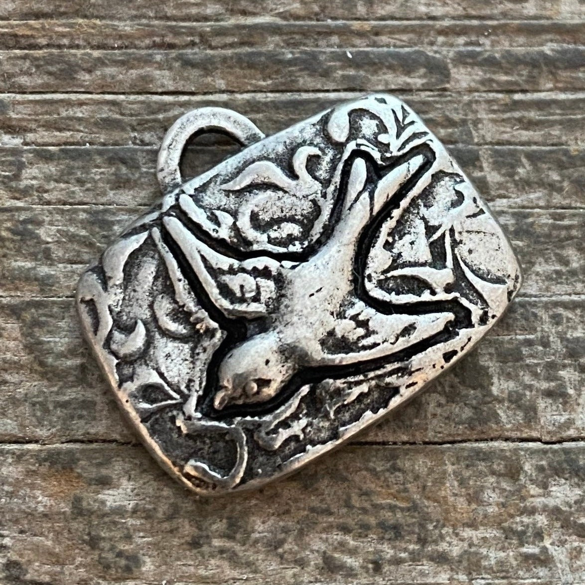 Bird Pendant, Antiqued Silver Rectangle Nature Charm for Jewelry Making, PW-6117