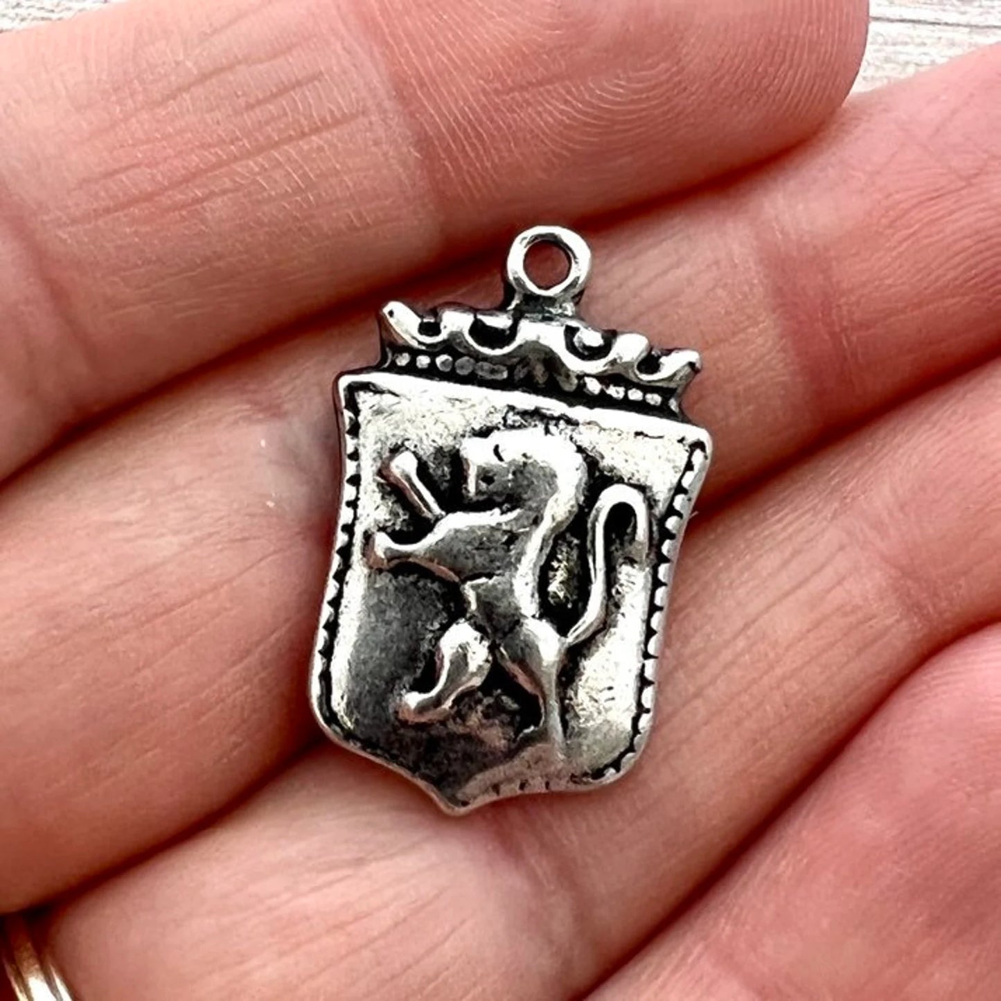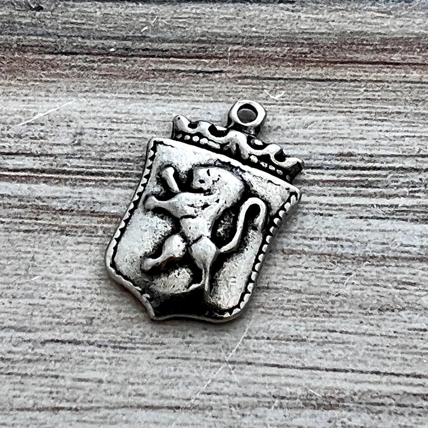 Add Lion Shield, Heraldry, Strength Talisman, Antiqued Silver Charm, Jewelry Making, PW-6230 to the cart