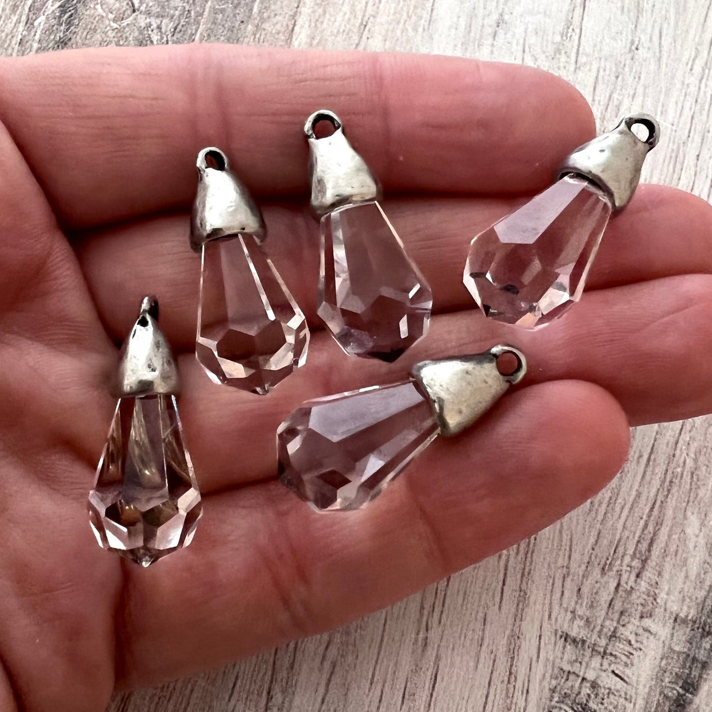 Small Chandelier Crystal Prism Drop Charm, Rounded Clear with Silver Pewter Bead Cap, Jewelry Making Artisan Findings, PW-S028