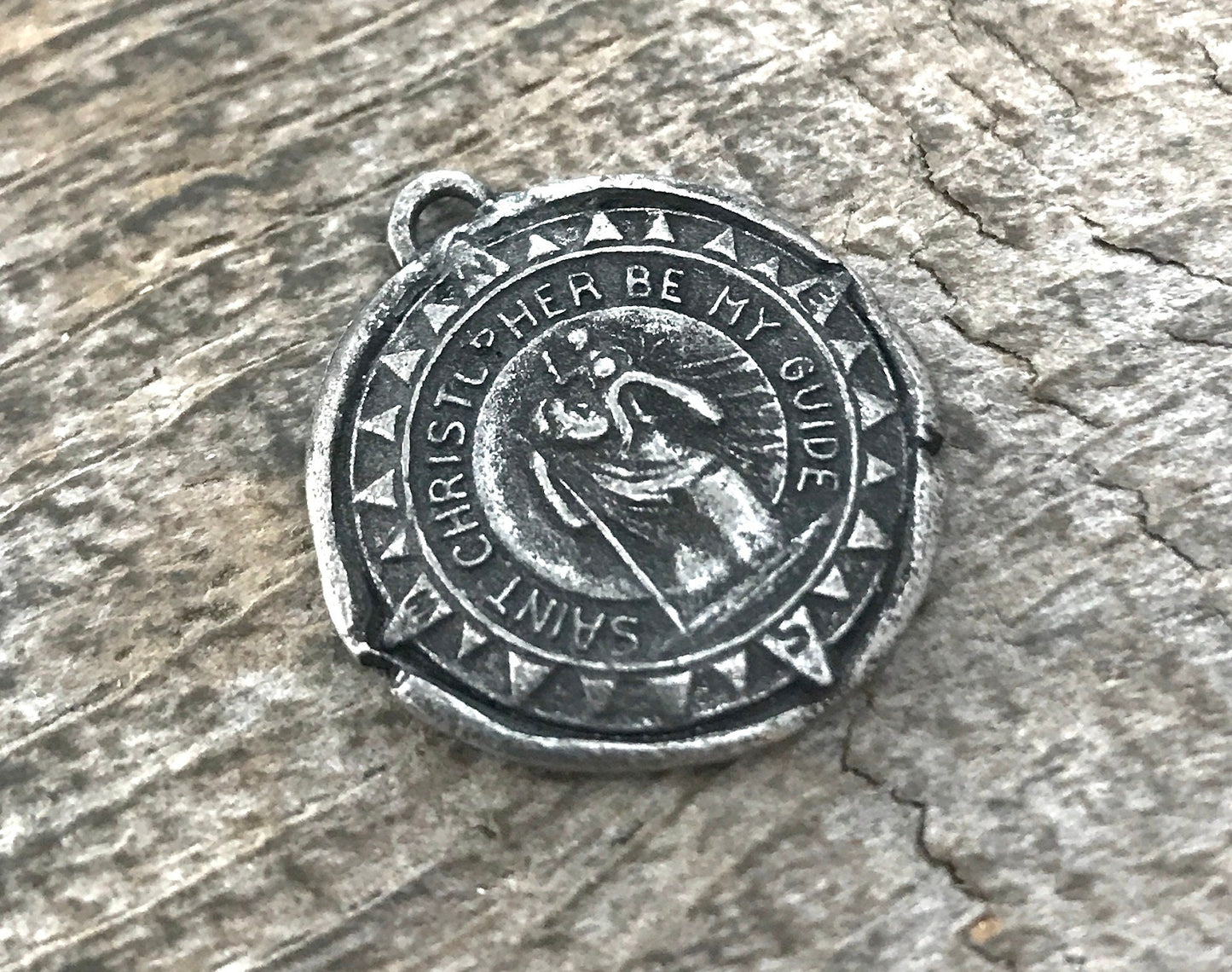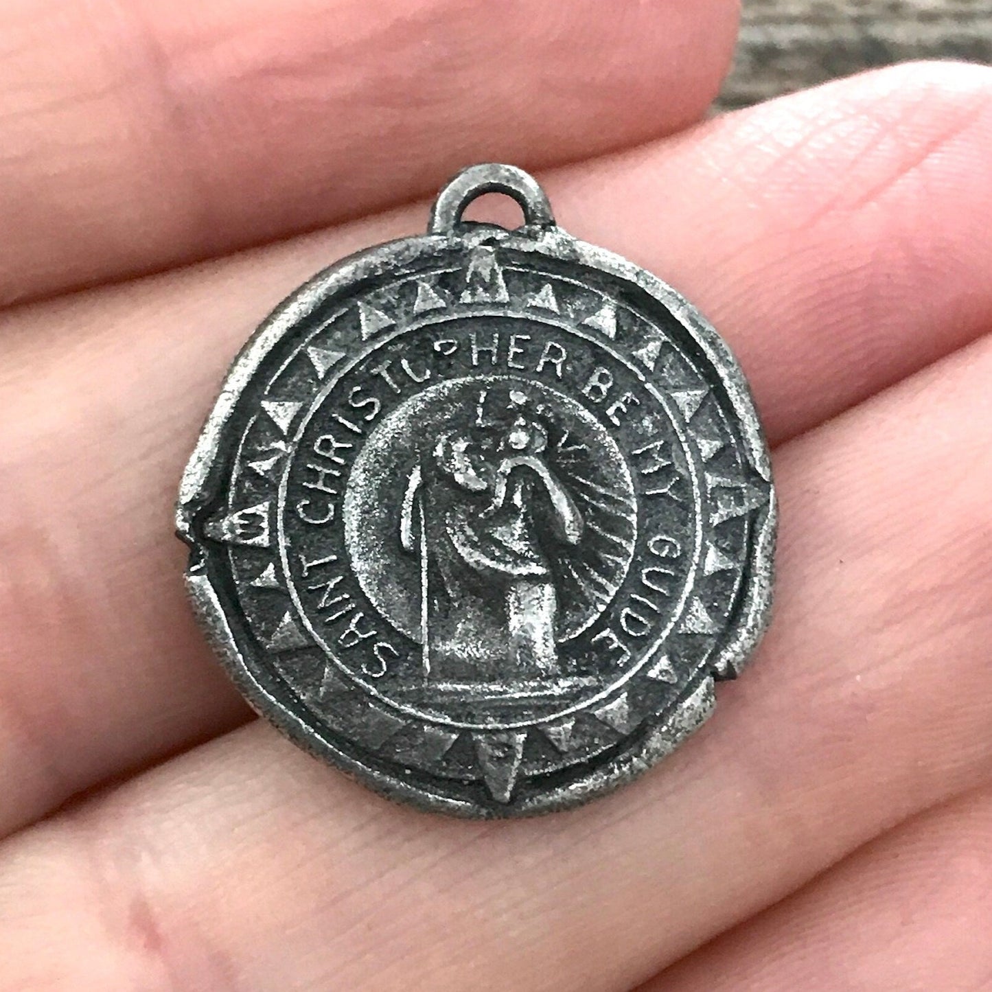 St. Christopher, Catholic Medal, Silver Wax Seal Charm, Religious Medal, Compass, Saint, Protect Us, PW-6141