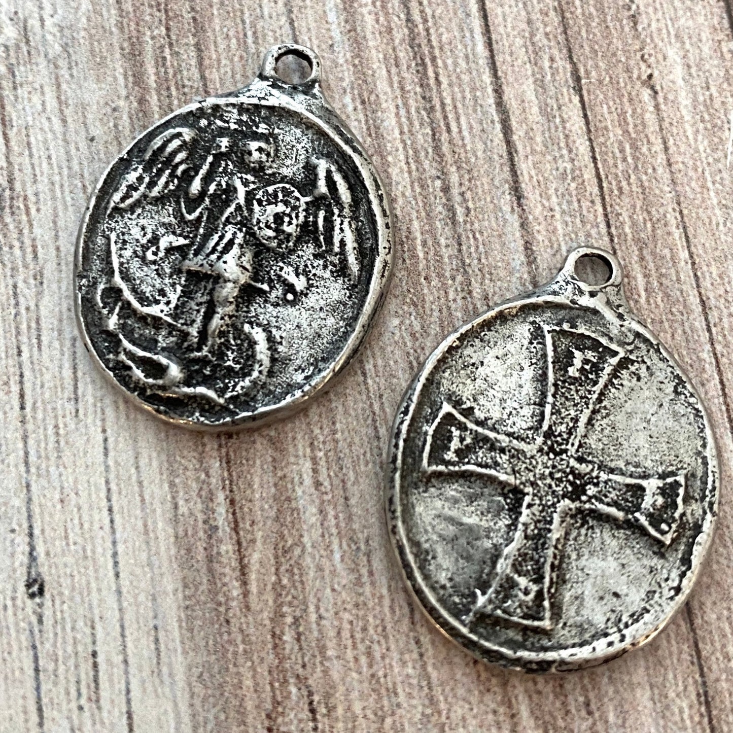 Archangel St. Michael, Catholic Medal, Antiqued Silver Cross Pendant, Religious Charm, Protect Us, Protection Christian Jewelry, PW-6177