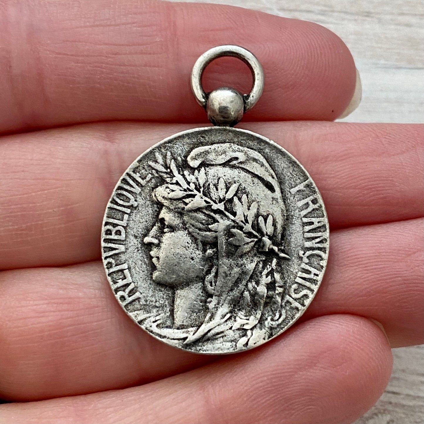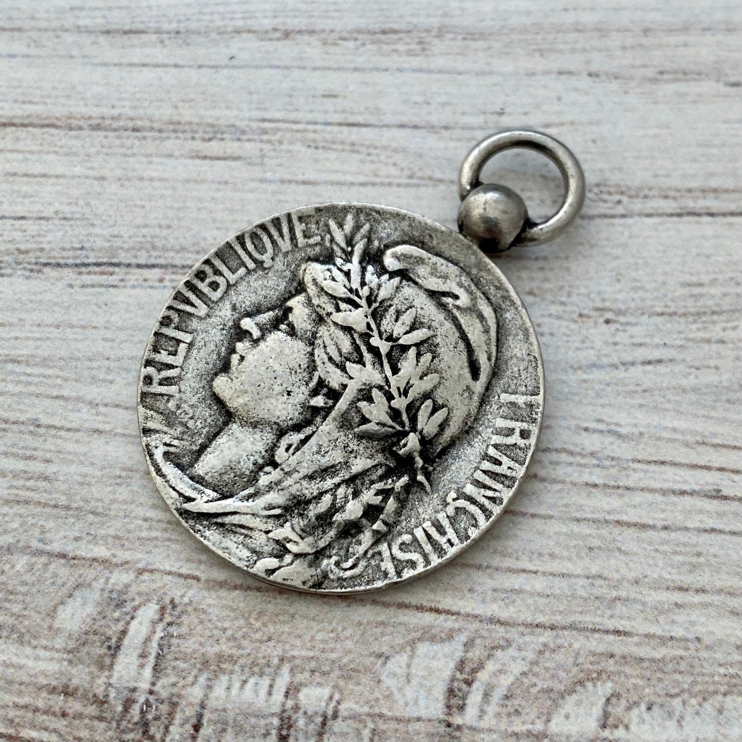 Medium Old French Marianne Medal Replica, Antiqued Silver Charm Pendant, Woman Lady Coin, Jewelry Supplies, PW-6158