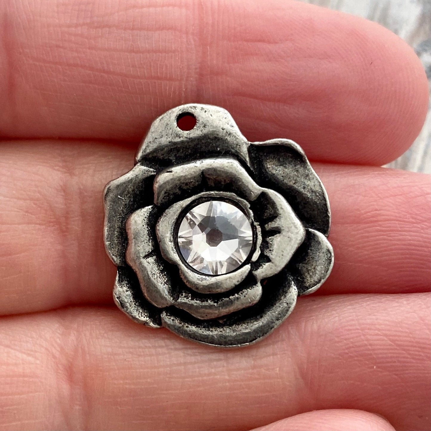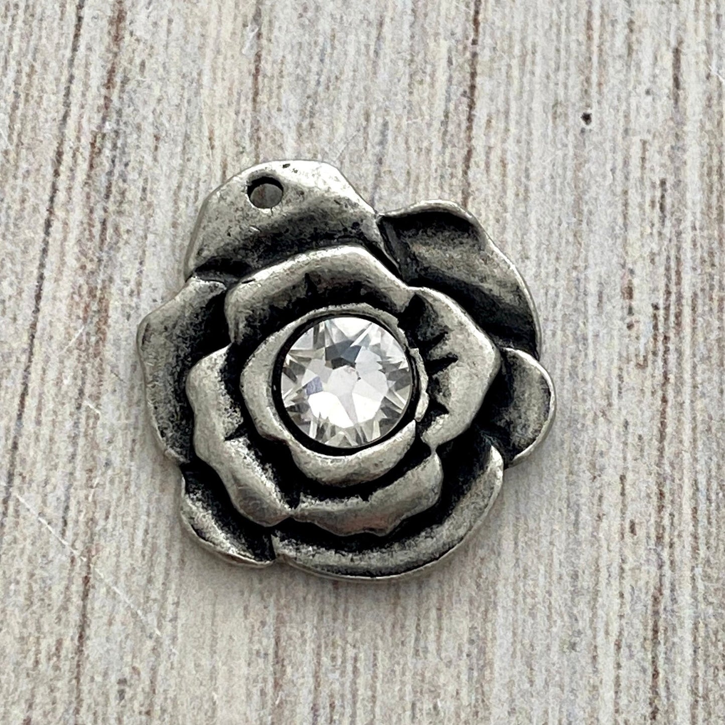 Swarovski Crystal Hammered Rose Flower Charm, Antiqued Silver Pewter Artisan Pendant for Jewelry, PW-6204