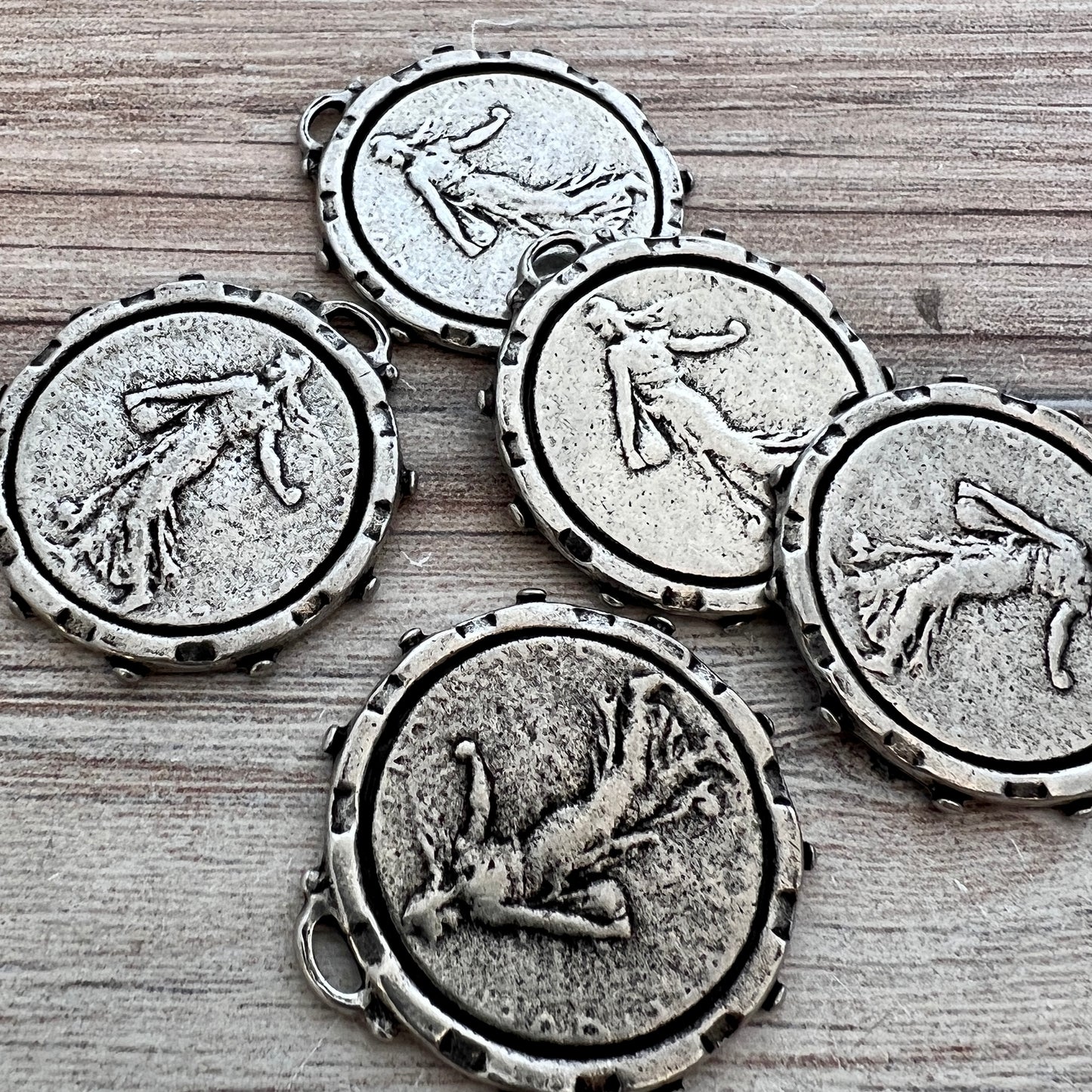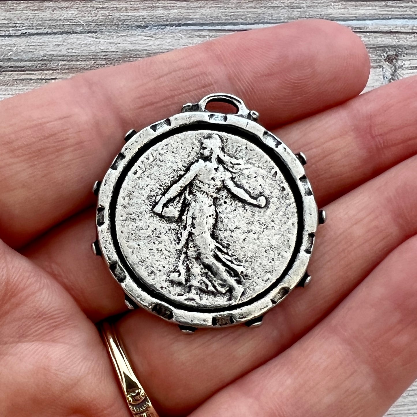 Large Old French Medal Large Old French Marianne the Sower, Dotted Coin Replica, Antiqued Silver Charm Pendant, Woman Lady Coin, Jewelry Supplies, PW-6240