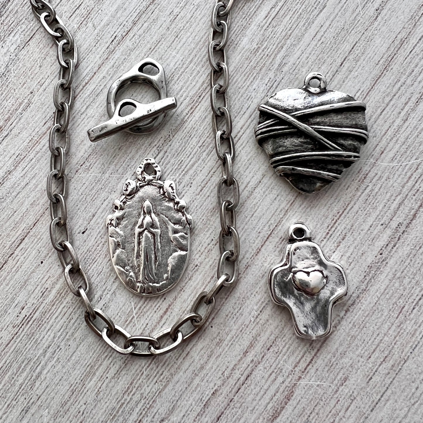 CC pewter components are made of high-quality pewter that is free of lead and cadmium. Most CC chain is made of regular steel, and some is made of brass. It is then plated with the various CC finishes. CC plating is known to hold up very well over time, but as always with any plated items, we recommend keeping it away from water and perfume.