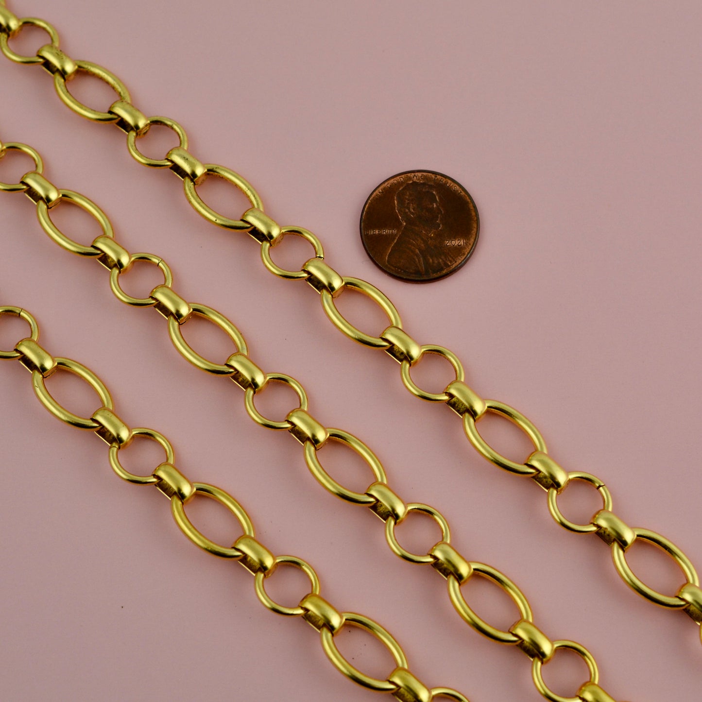 This chunky chain features a stylish mix of gold oval and circle multi-ring links, creating an eye-catching alternating pattern. Perfect for adding warmth and dimension to your jewelry projects. It’s sold by the foot and shipped in one continuous length unless otherwise requested.