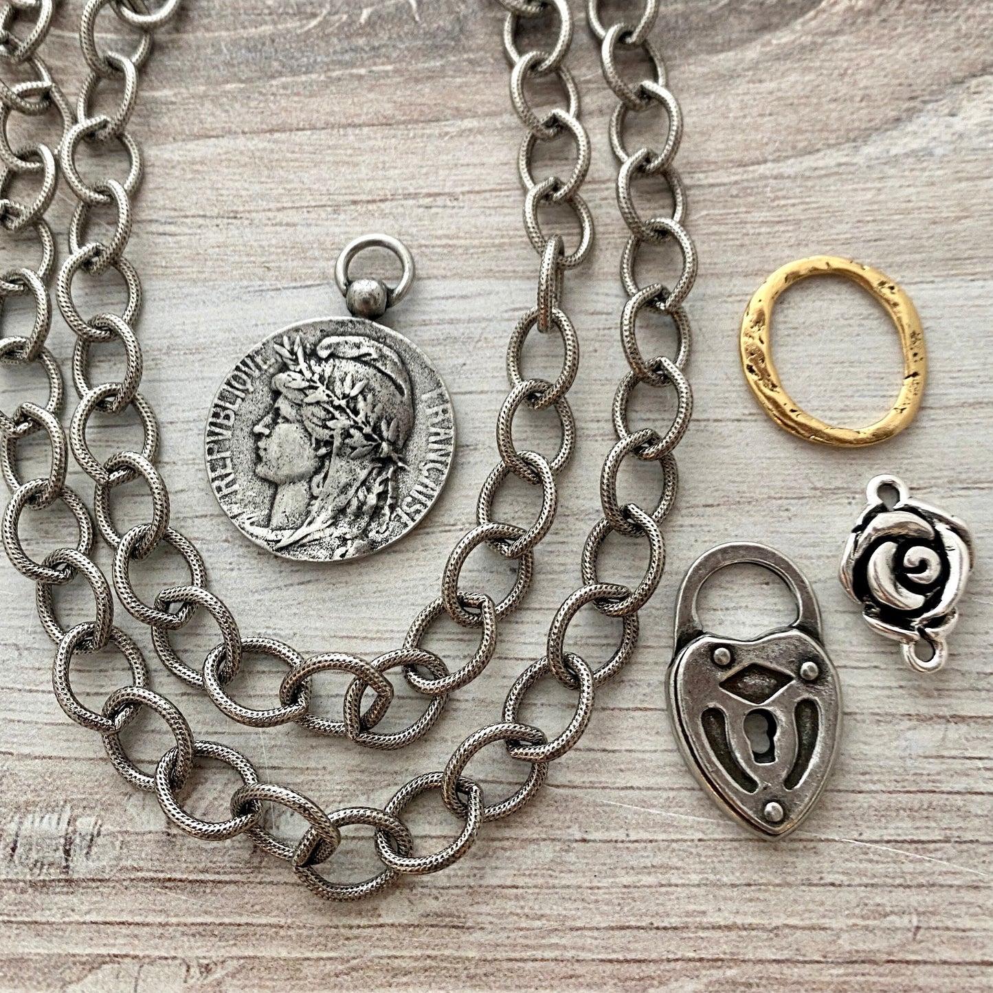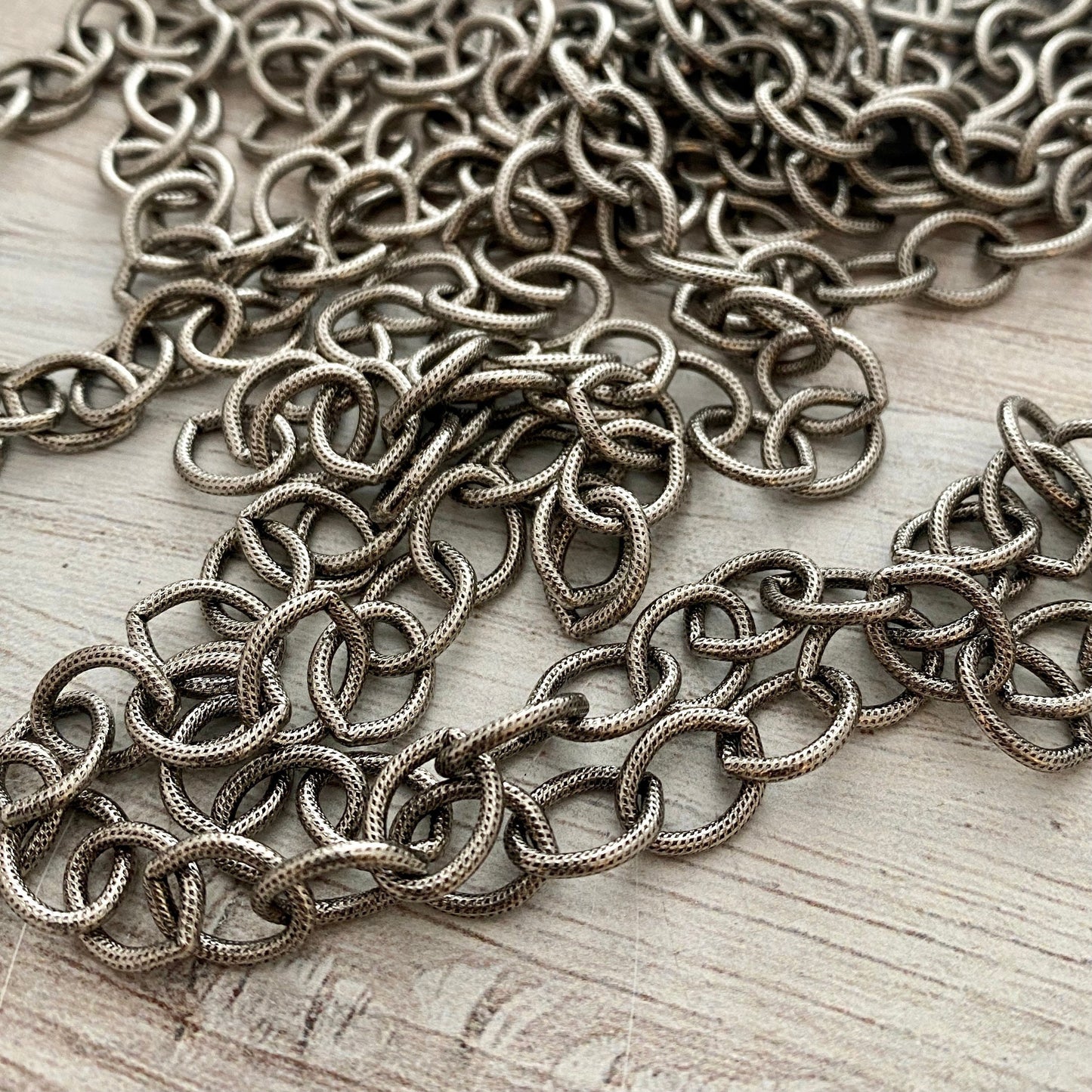 This chain is thick and sturdy. The links of this textured cable chain have a bit of an oval shape. The patina gives it an aged, rustic vintage look. Use this for a charm bracelet, or triple it up for an amazing statement necklace! Get creative and use the chain links on earrings!