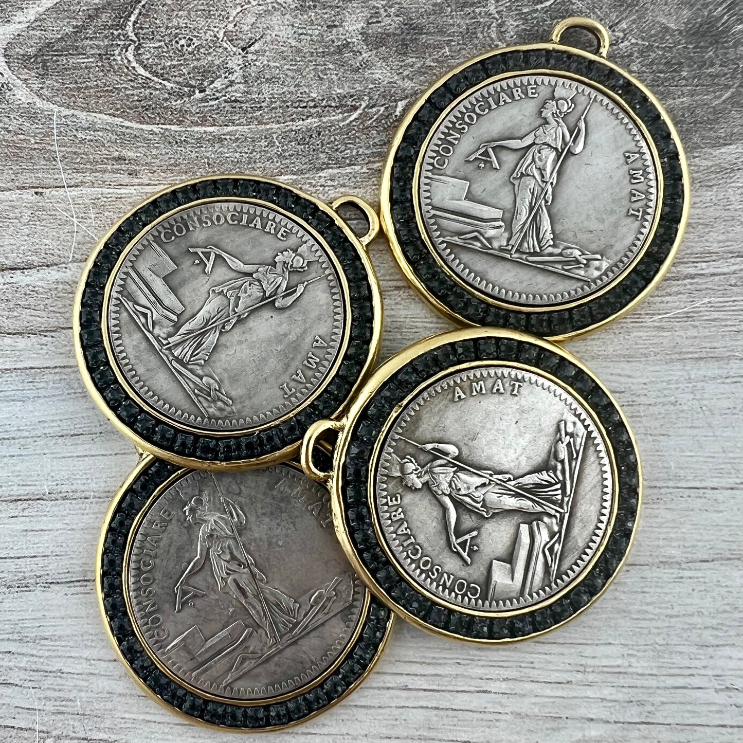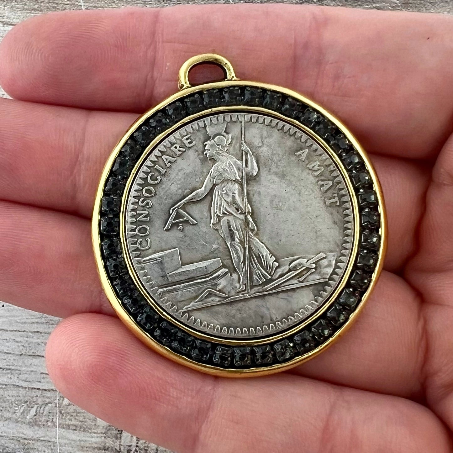 This sparkling, large coin pendant is a French replica coin dating back to the time of the French Revolution. The coin features a helmeted Athena (Roman Minerva) holding a level and a spear.