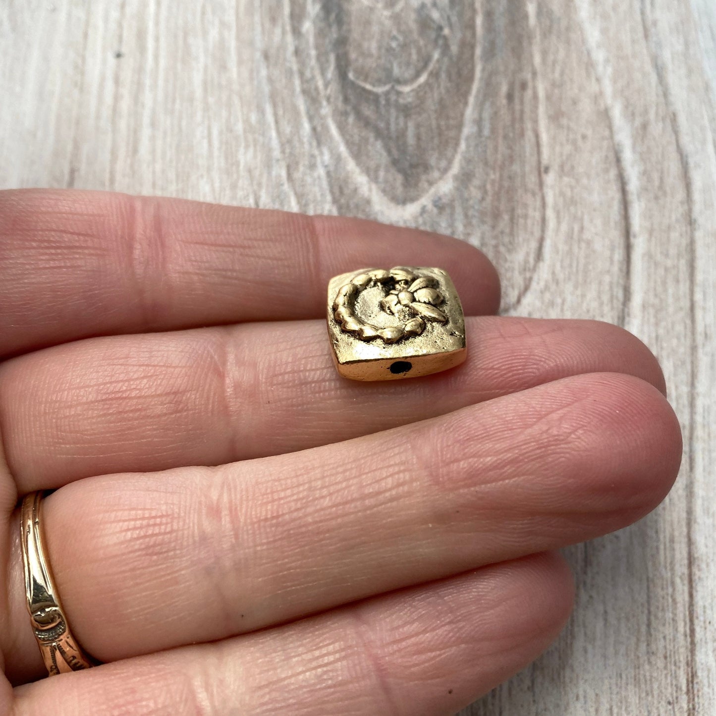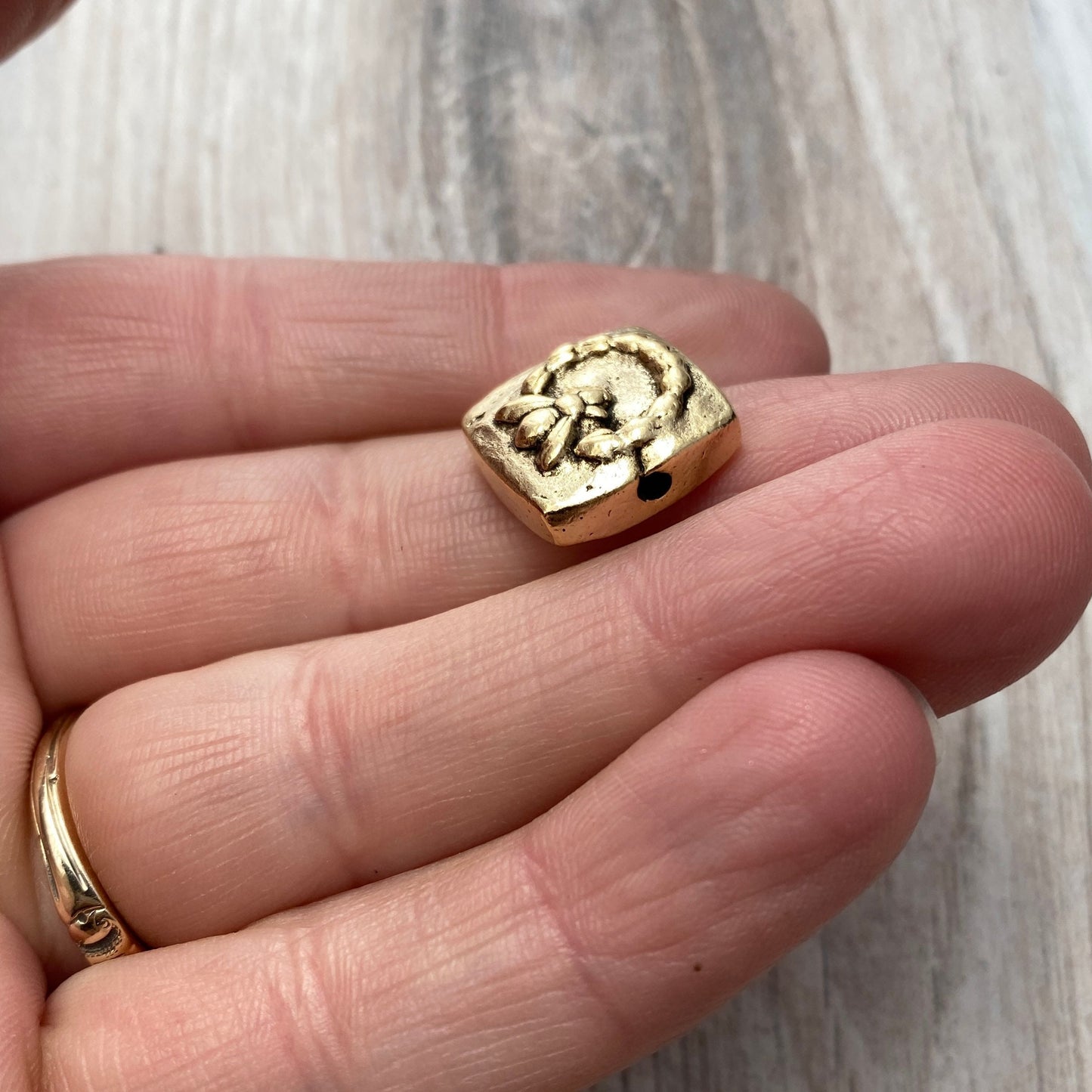 All Carson's Cove "12k Antiqued Gold" finish components are plated with real 12k gold, and then antiqued. They are all the same gold, but highly textured pieces may look a bit different than smooth pieces because the texture captures more of the antiquing elements. Why 12k gold? Because 12k gold is a light, neutral gold without an orange tone, and it looks beautiful on every skin tone!