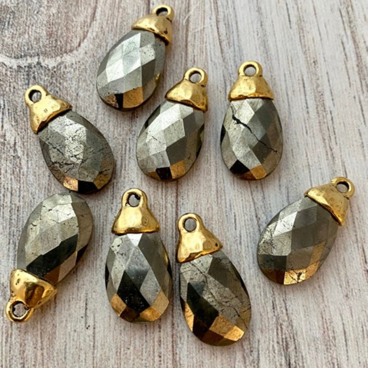 Semi-precious gemstones add value and elegance to your designs! These pear-shaped briolettes are ready to be added to your jewelry creations - no wire wrapping necessary. This saves you precious time when fulfilling orders. Pyrite is a stone with a beautiful metallic color that can range from gray and silver to gold. It can have naturally occurring color variations running through it from black all the way to white. Because of its metallic properties and color, it pairs extremely well with all types of jewelry.