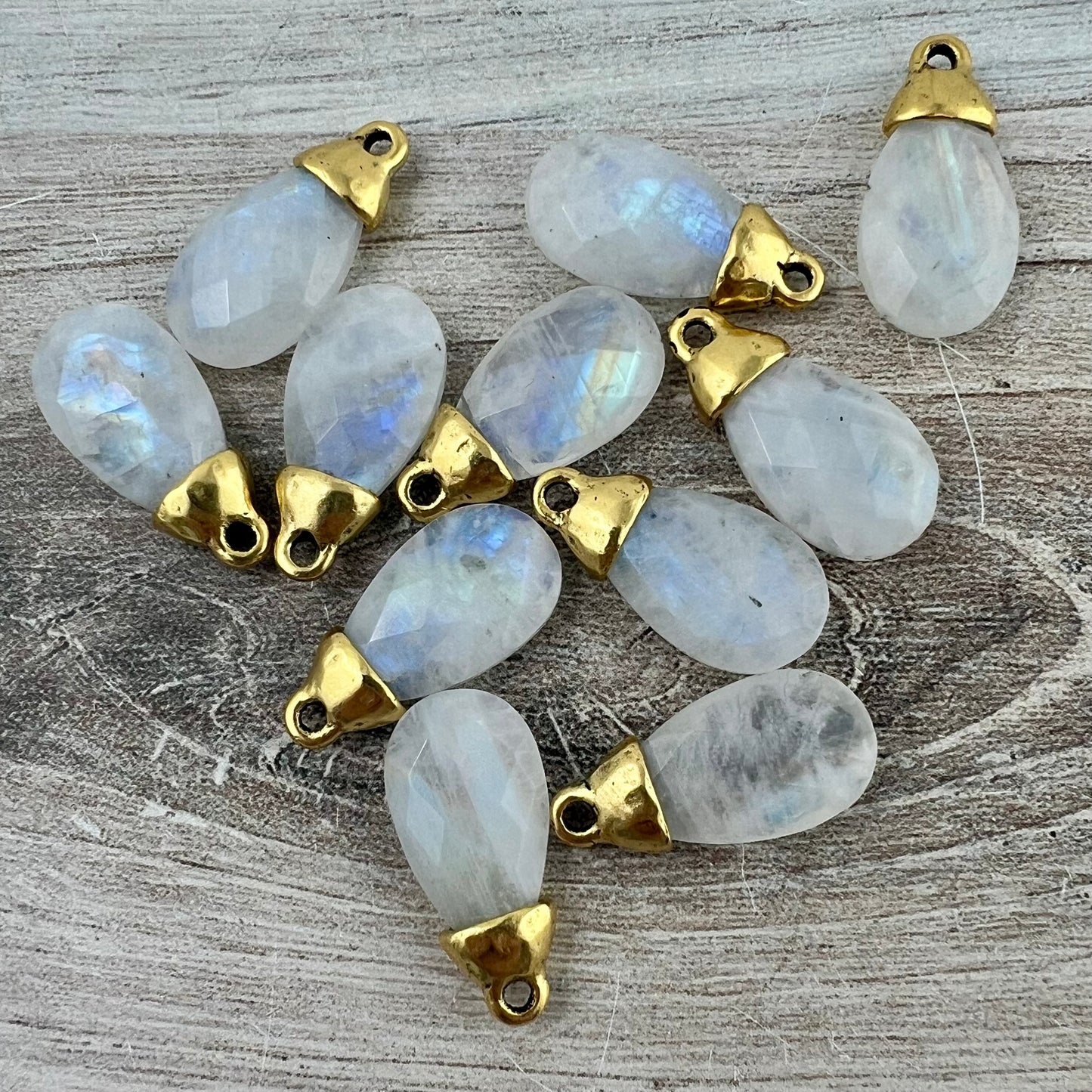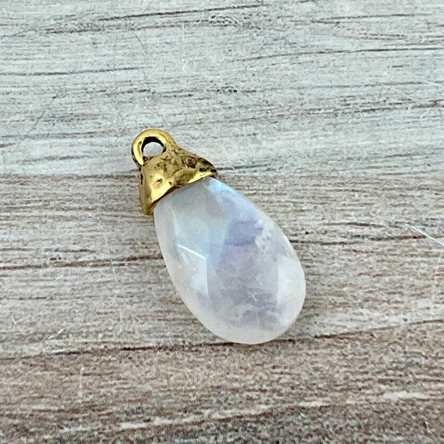 White Rainbow Moonstone Pear Faceted Briolette Drop Pendant with Antique Gold Bead Cap, Gemstone, Jewelry Making Artisan Findings, GL-S044