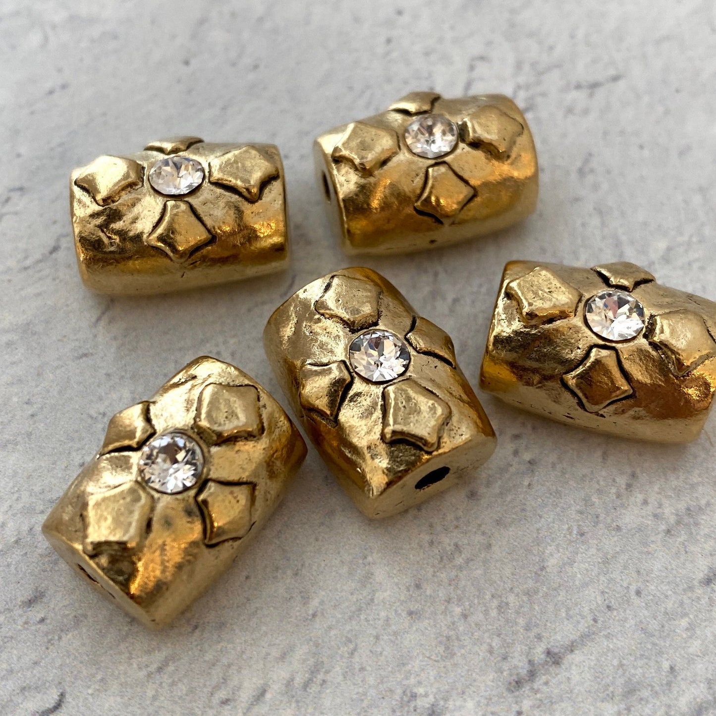Large Artisan Barrel Bead with Swarovski Crystal Rhinsetone, Antiqued Gold Cross Flower Slider Jewelry Components, Supplies, GL-6116